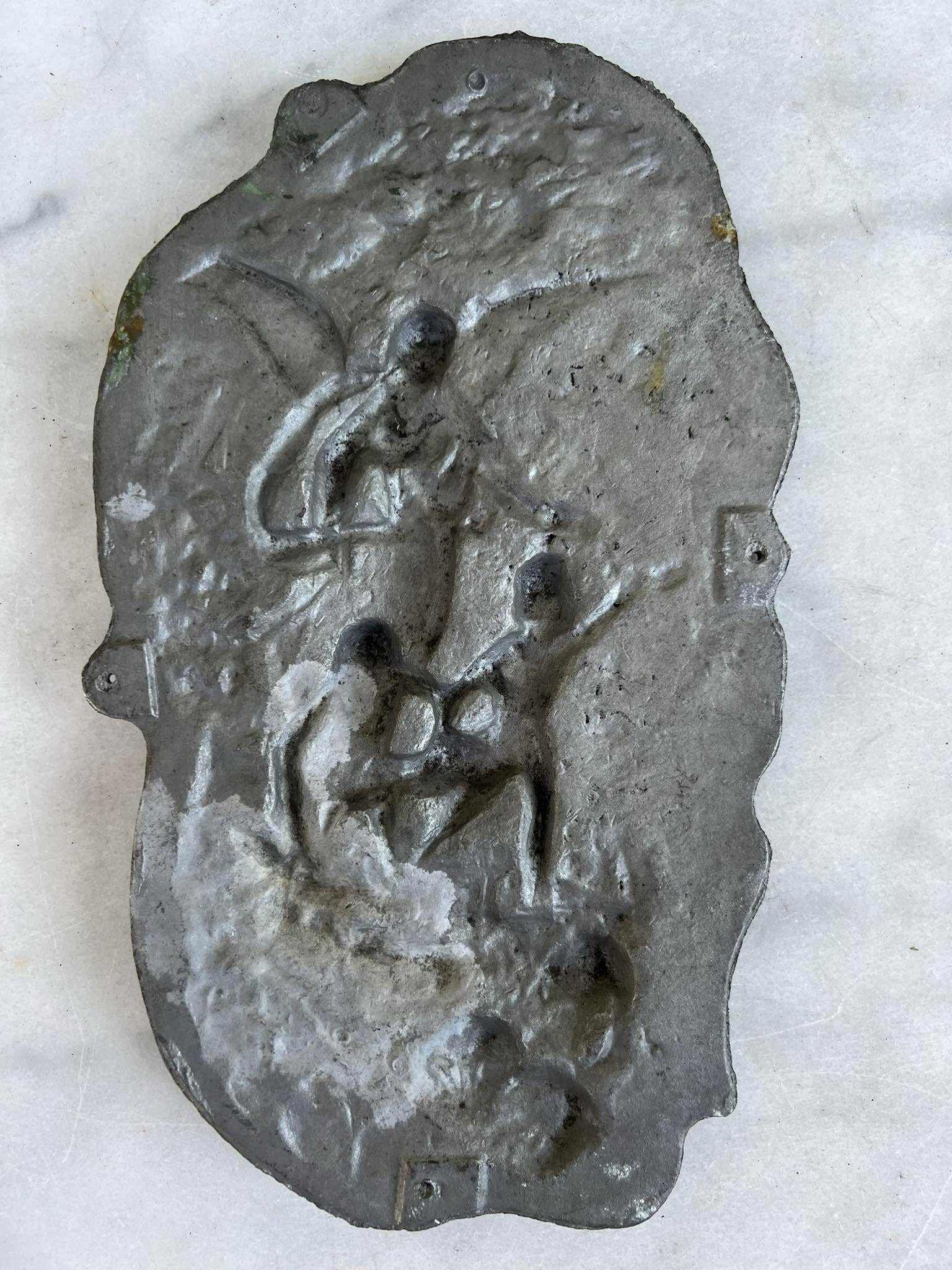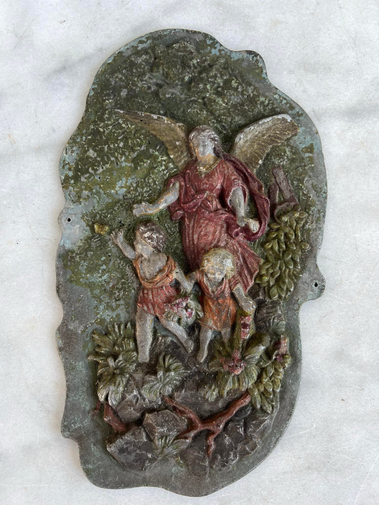 Plaketė religinė, antikvarinė, Metalinė, išlikę tapybos fragmentai. Dydis: 16 x 37 cm. Kaina 53