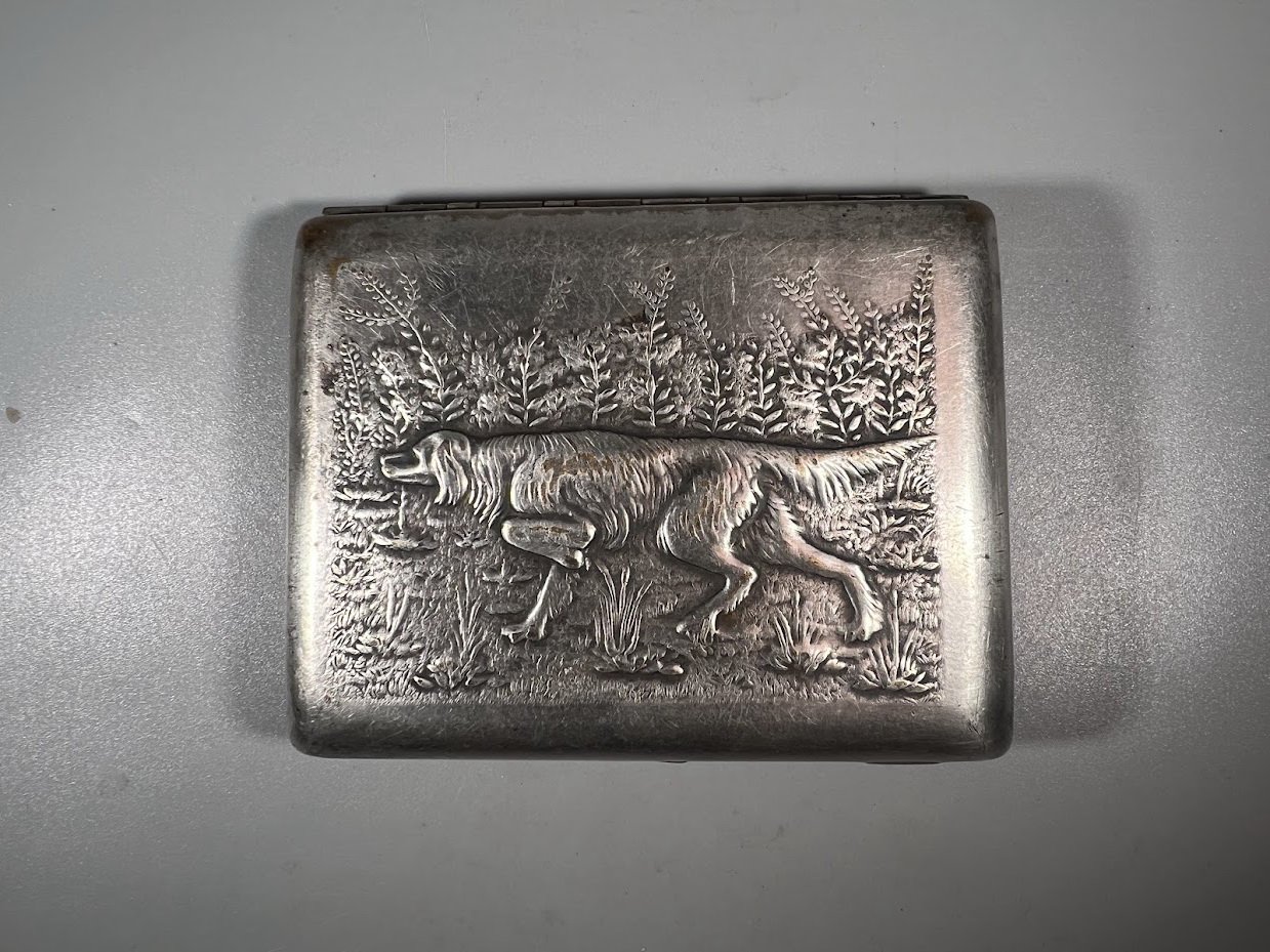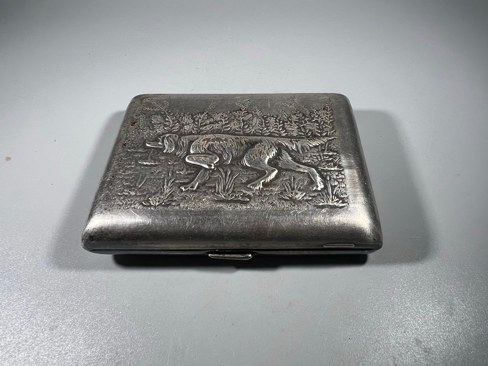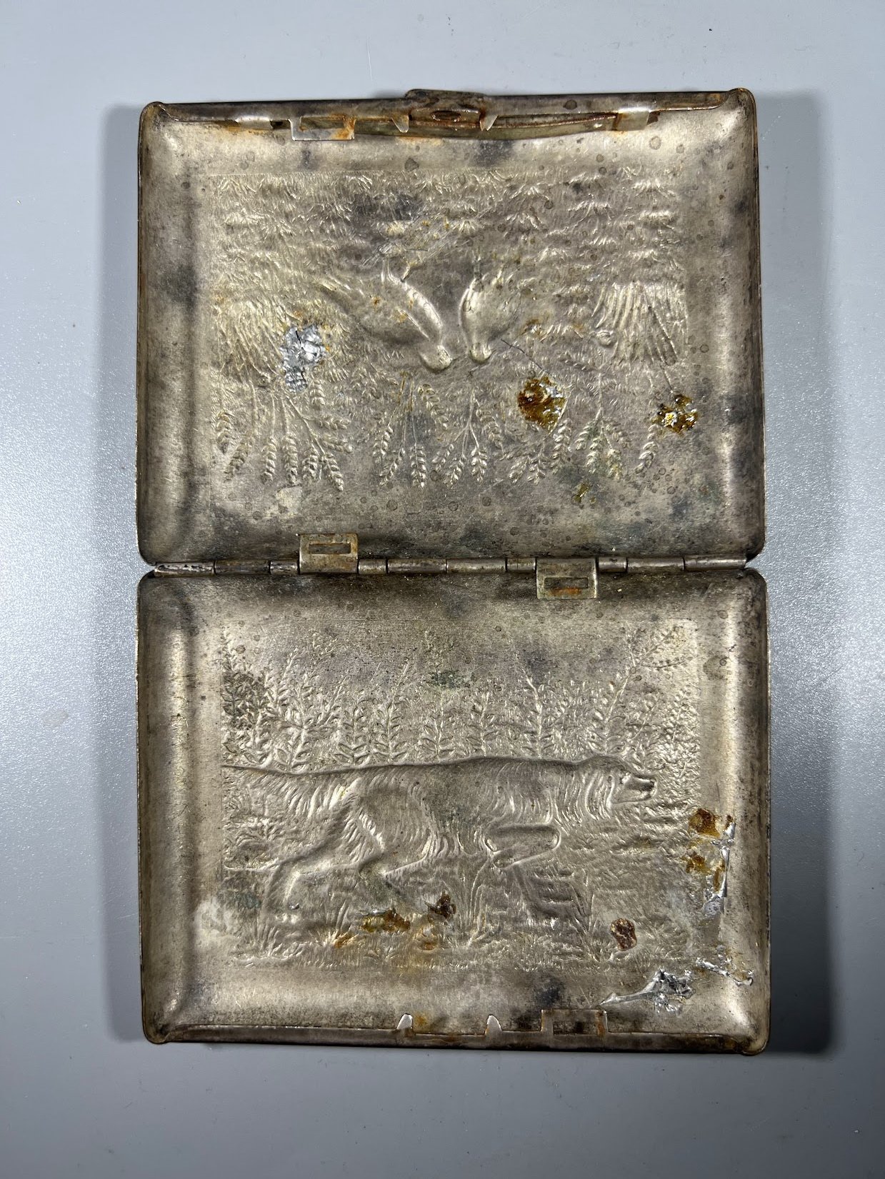Portsigaras antikvarinis puoštas reljefiniais medžioklinio šuns ir kurapkų piešiniais. Dydis: 8 x 11 cm. Kaina 48