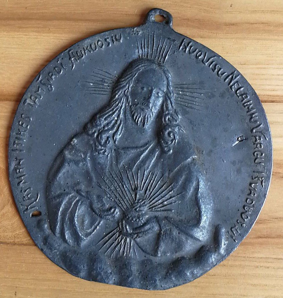 Prieskarine plakete Kas man itikes, tam sirdi aukuosiu Nuo visu nelaimiu vargu isvaduosiu.. Skersmuo 13 cm. Kaina 26