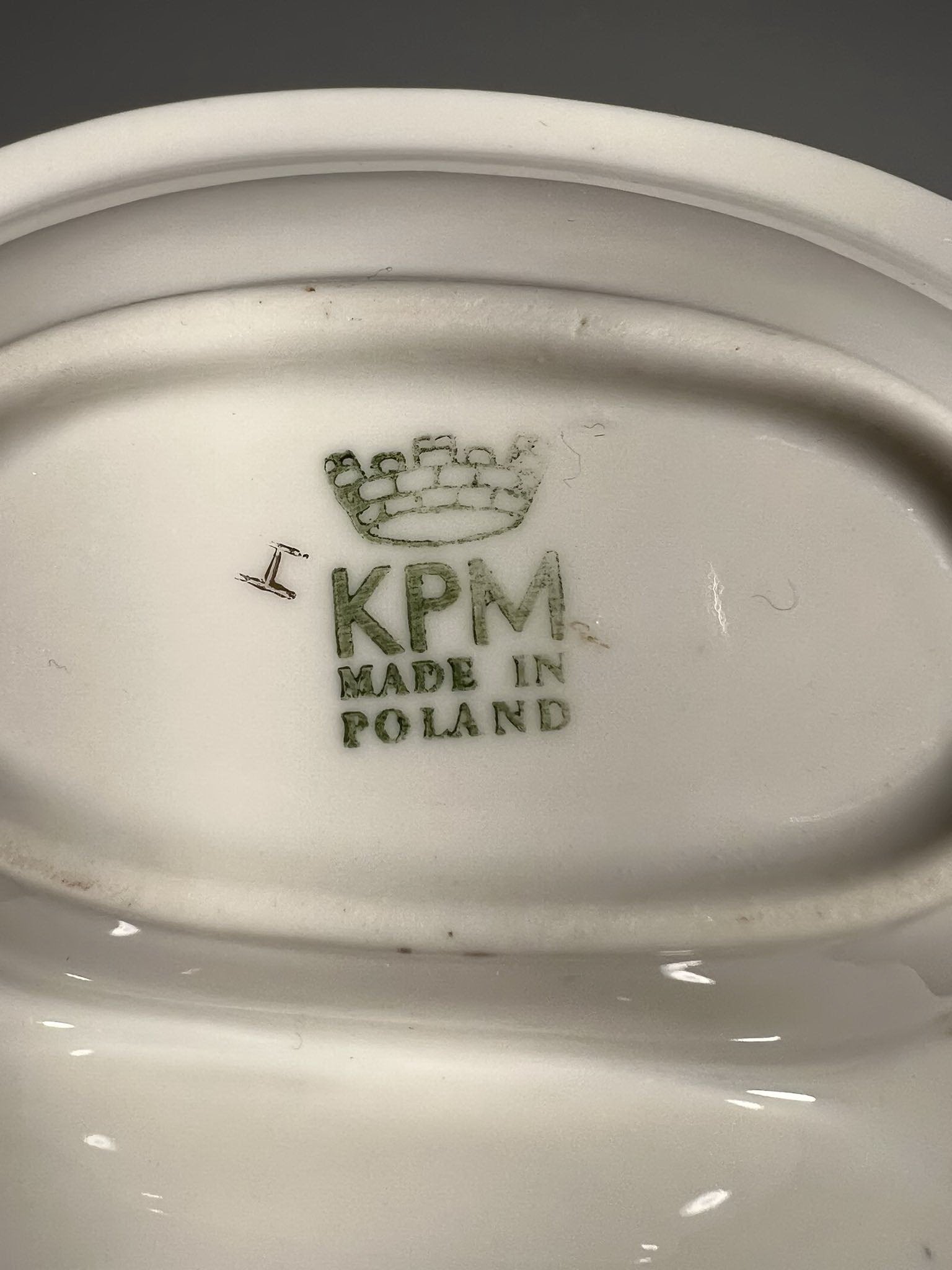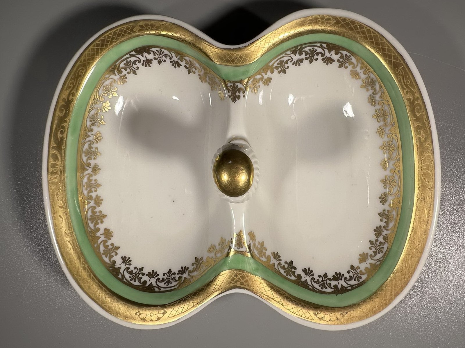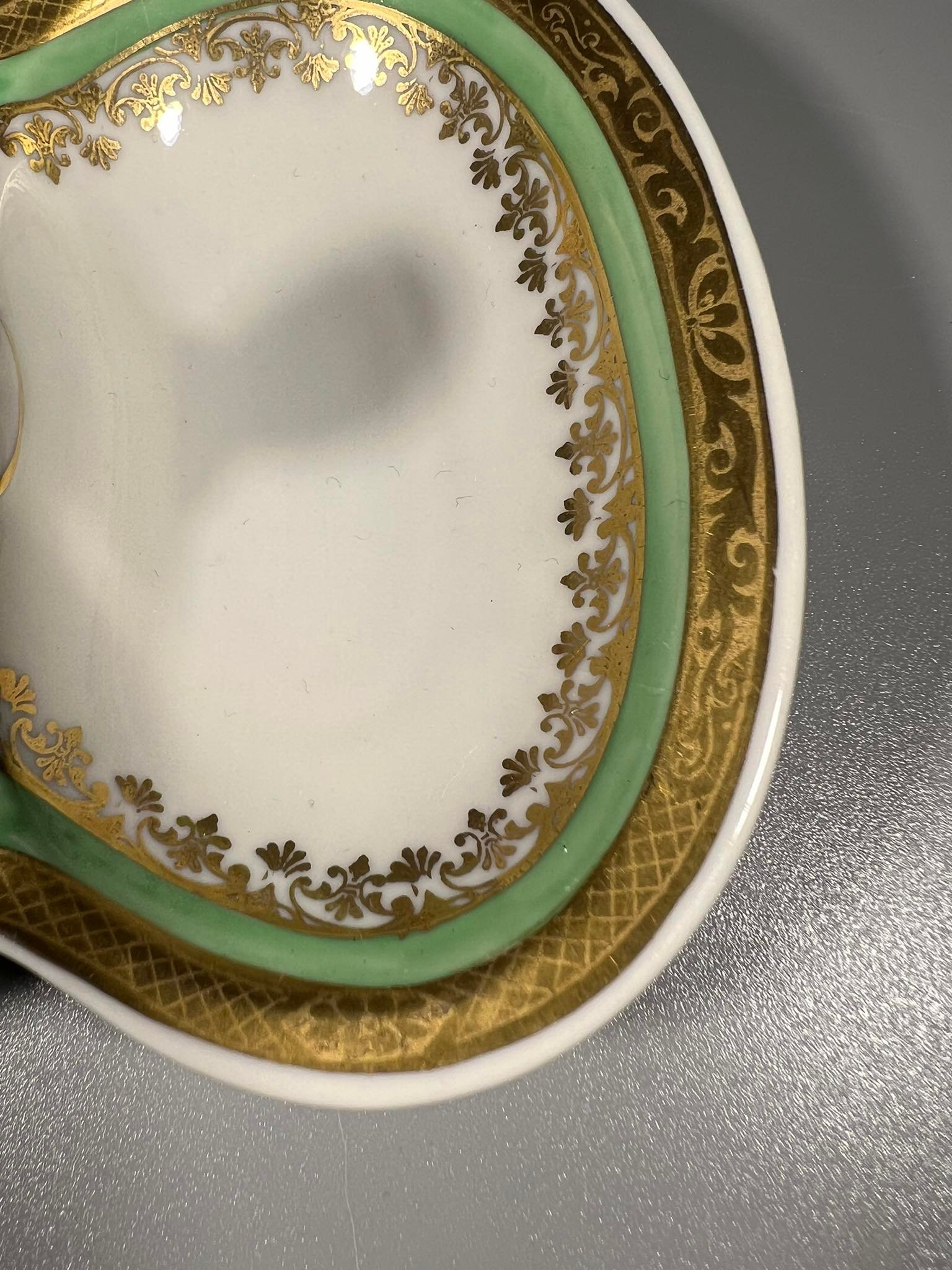 Prieskoninė porcelianinė antikvarinė KPM 1945 – 1952 m. Ilgis 12, plotis 10, aukštis 5 cm. Kaina 16