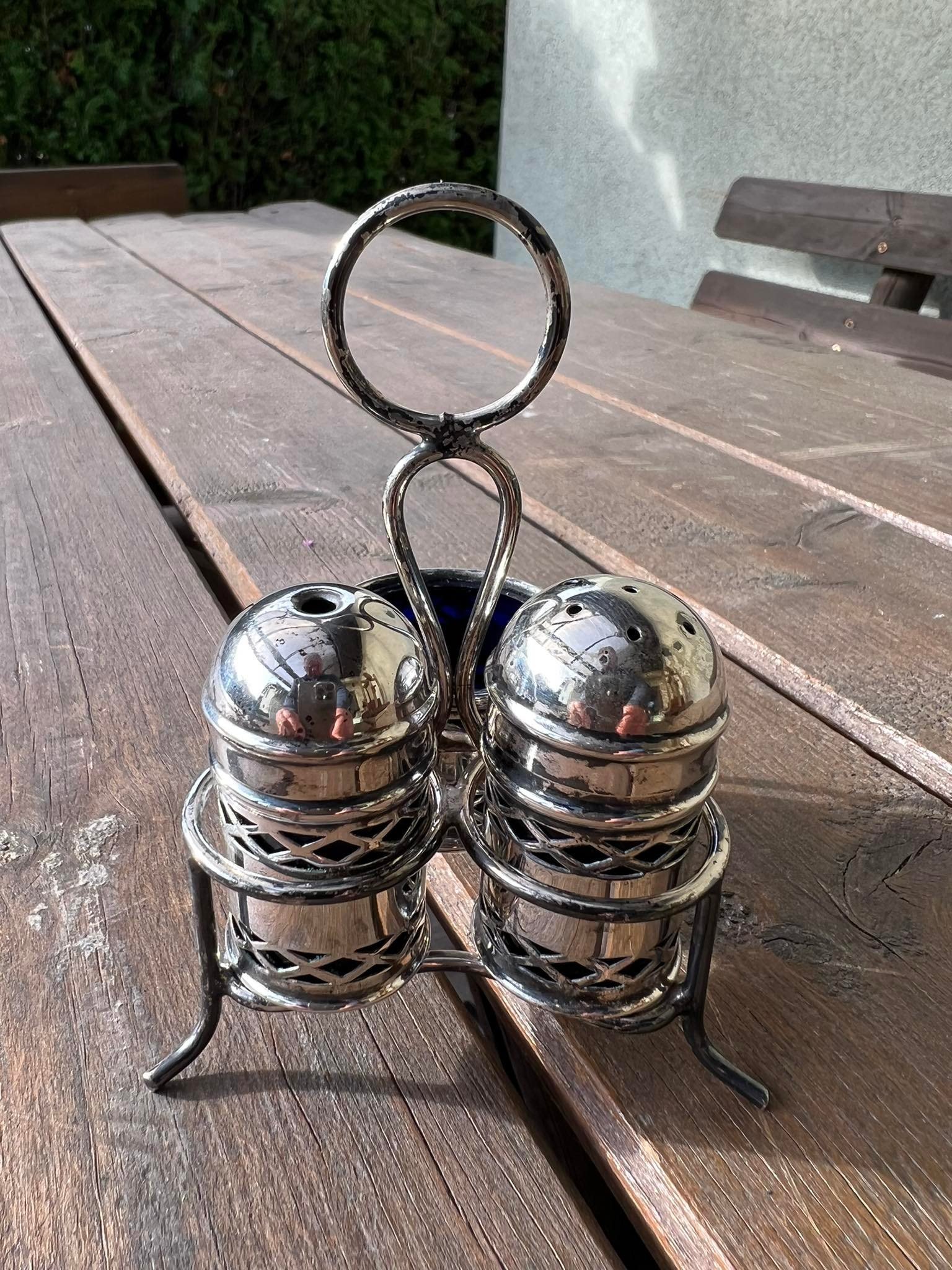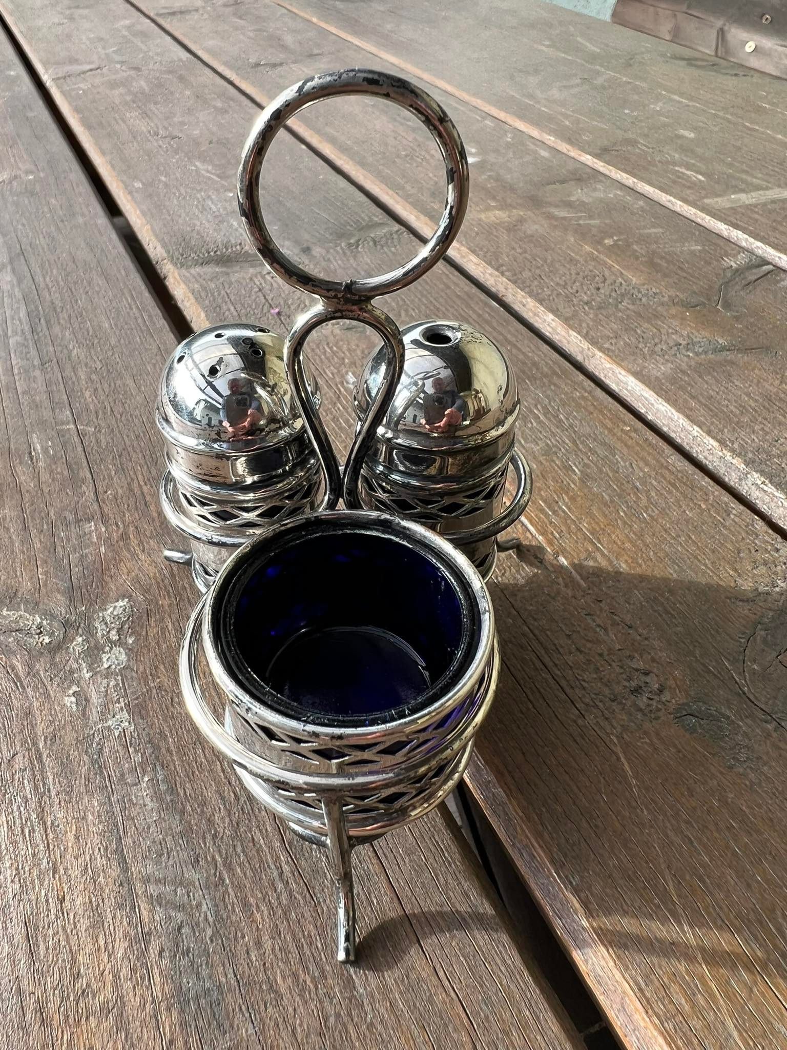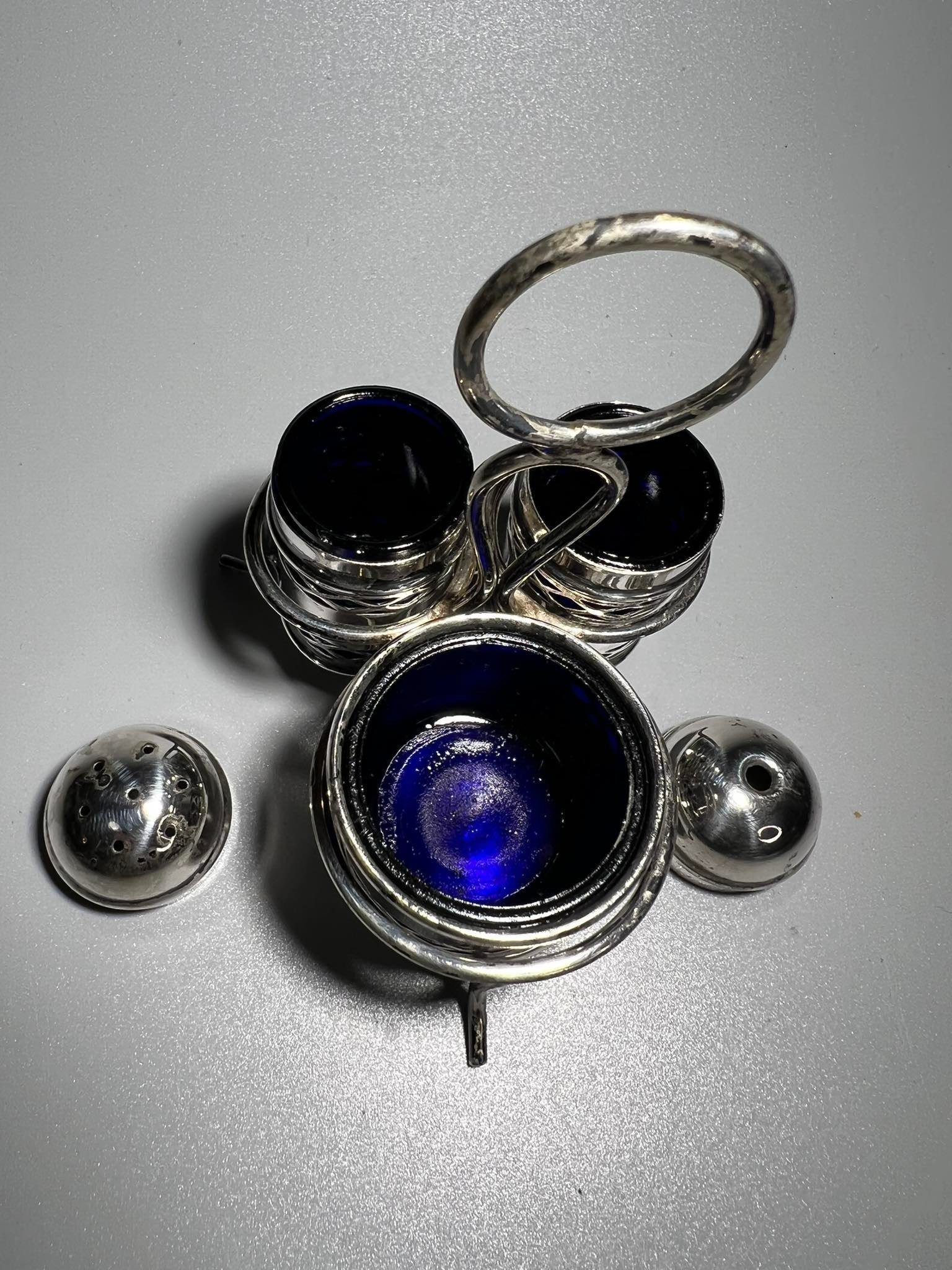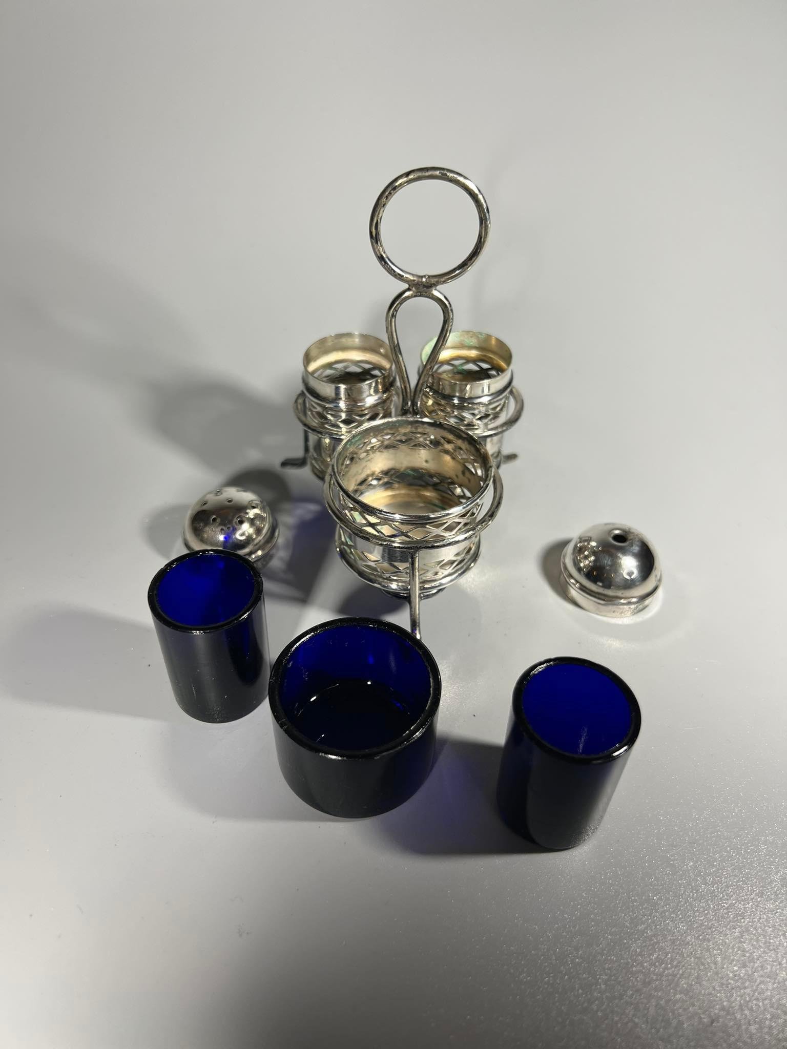 Prieskoninių rinkinys, komplektas, antikvarinis, sidabruotas, mėlynas stiklas. E.P.N.S. Made in England. Kaina 28