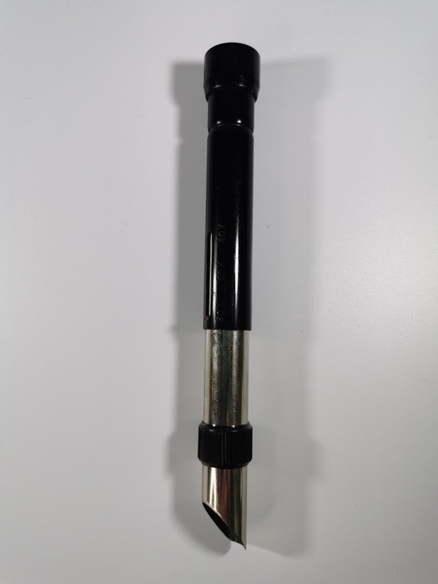 Prietaisas vokiškas su objektyvais. Ilgis 14 cm. Metalinis, prailginamas. Kaina 22