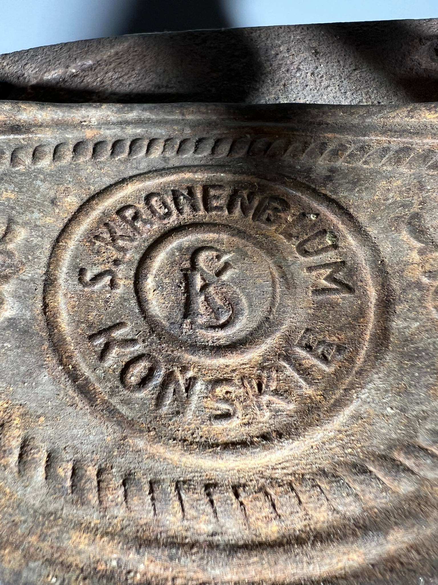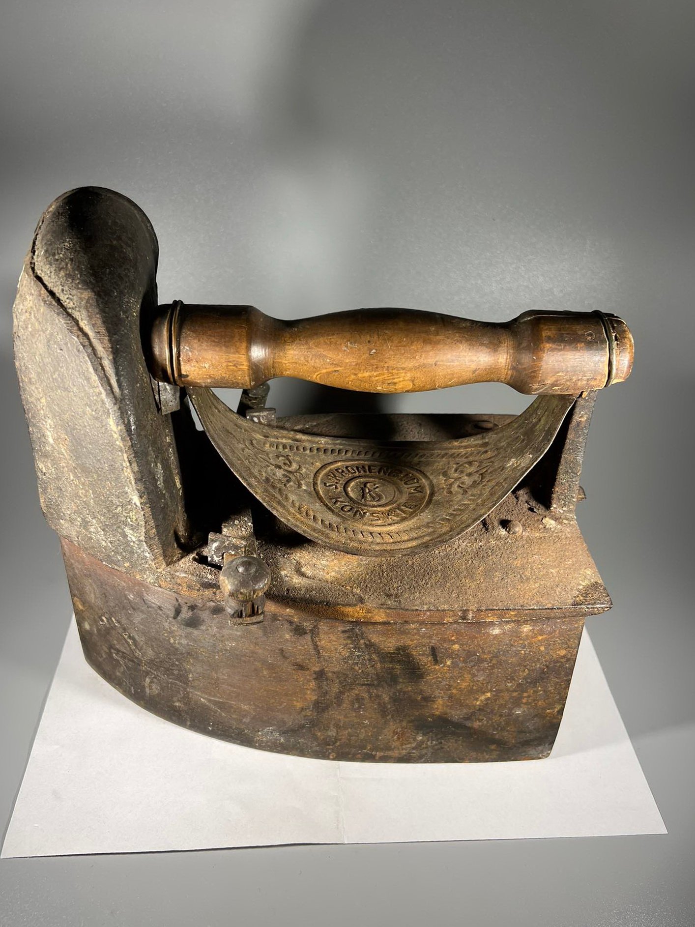 Prosas, lygintuvas su kaminėliu, antikvarinis, didelis Nr. 10. S. Kronenblum Konskie. 1901-1939 m. Ilgis 24, aukštis 24 cm. Netrūkęs, neskilęs. Kaina 63