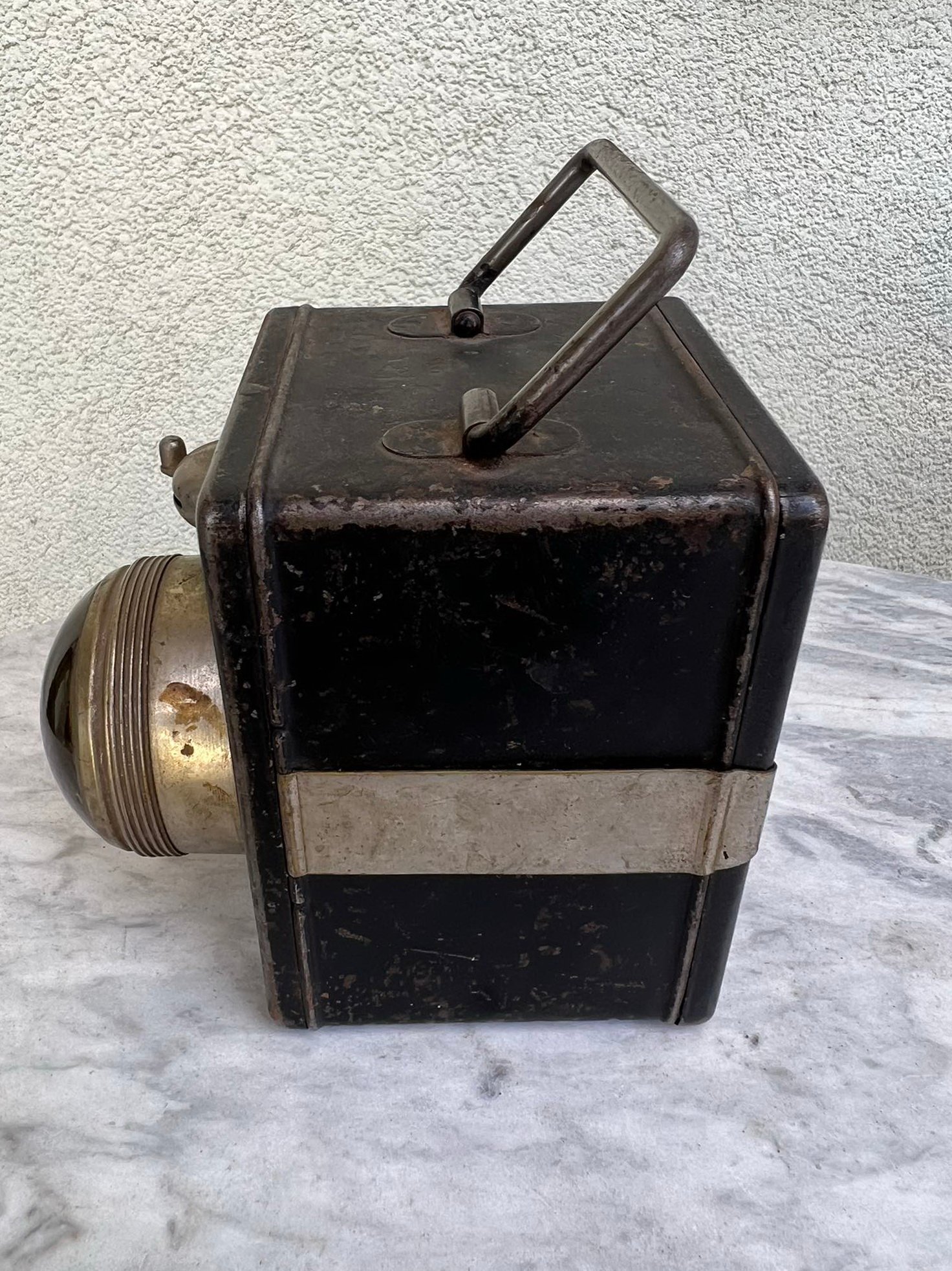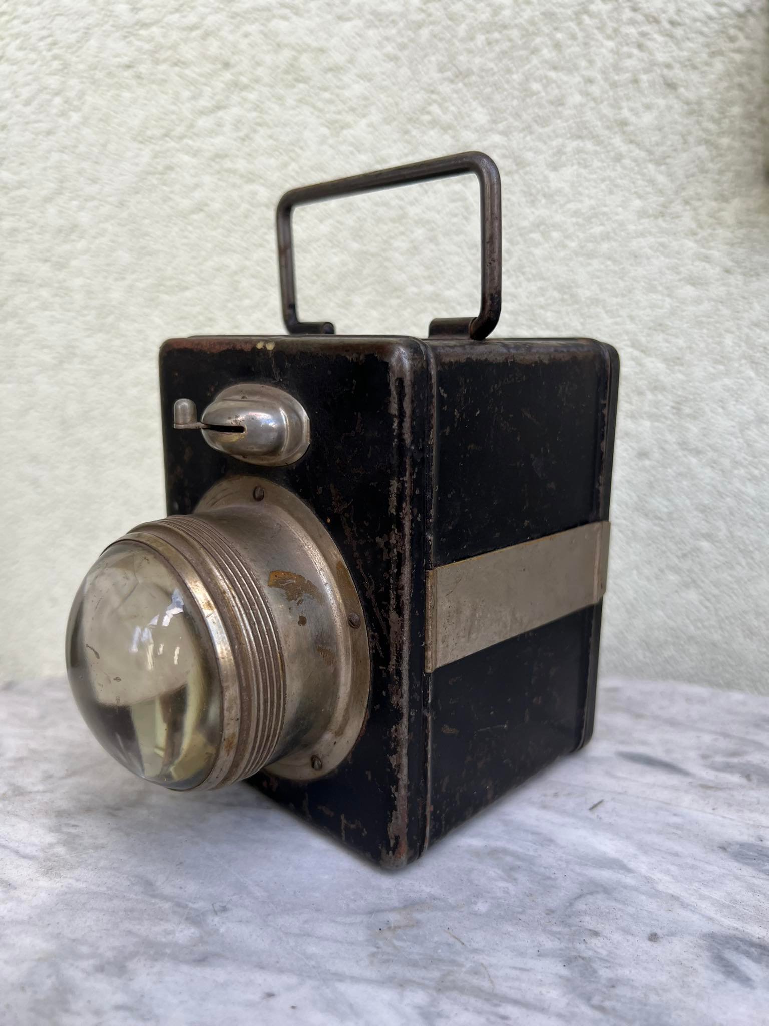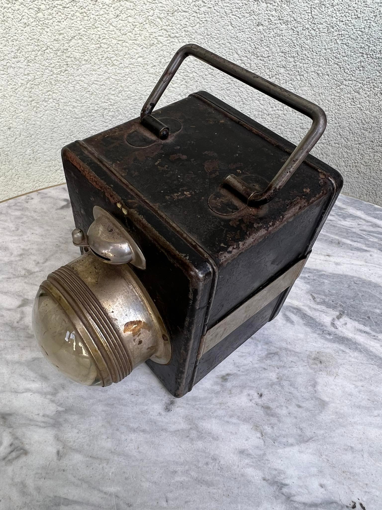 Prožektorius antikvarinis su baterija. Netikrintas. Korpuso dydis: 7 x 7 x 11 cm. Kaina 43