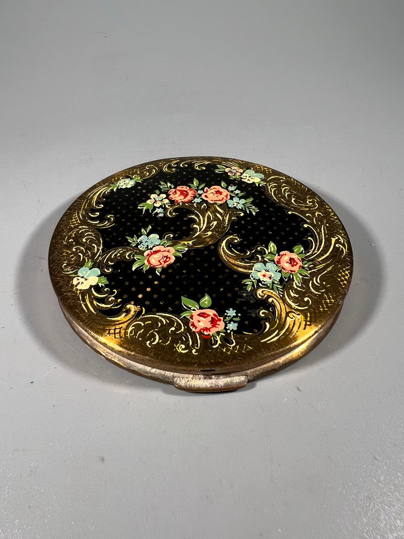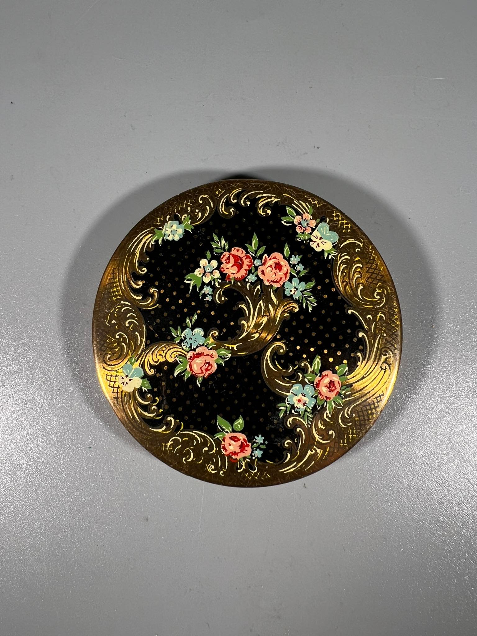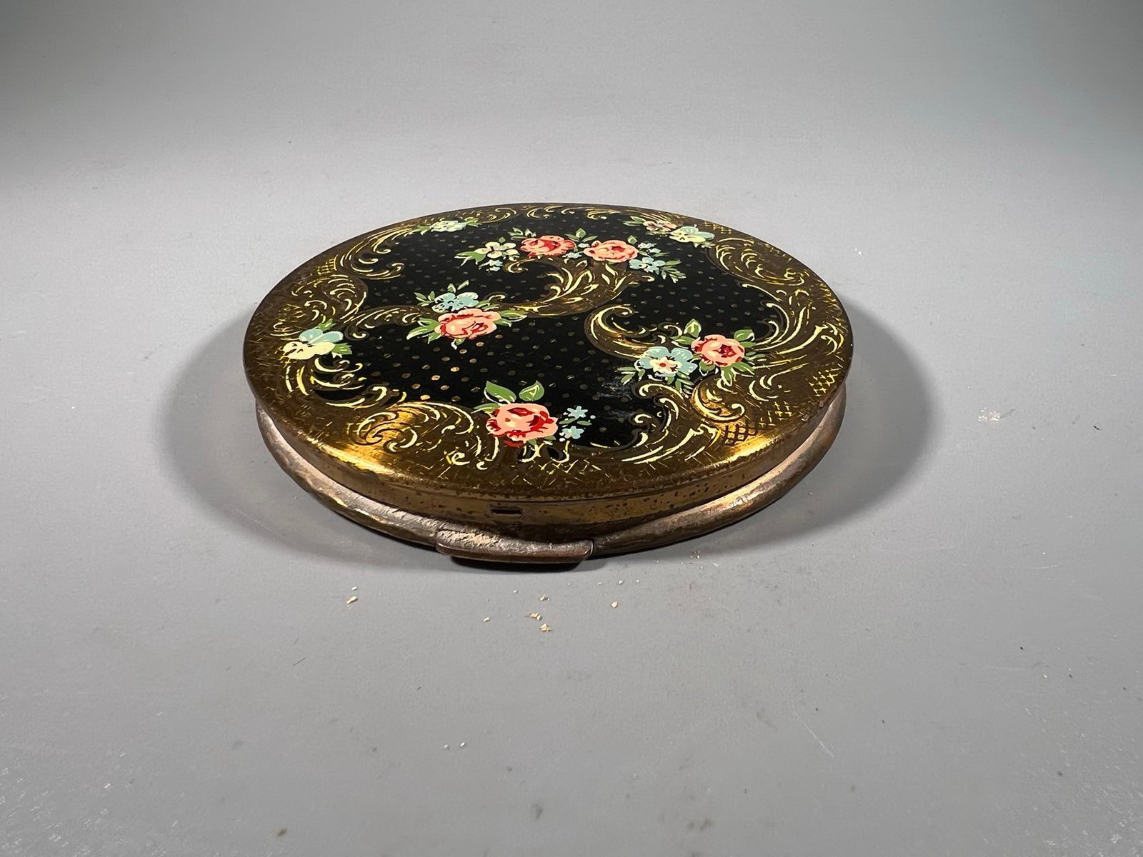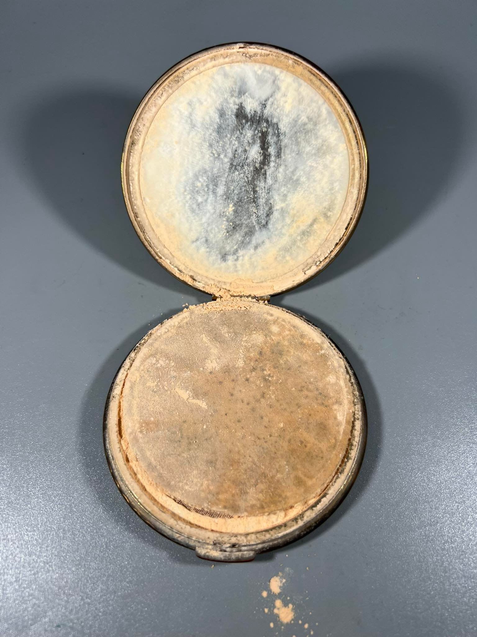 Pudra metalinėje dėžutėje su veidrodėliu, vintažinė, prancūziška. Skersmuo 8, aukštis 2,5 cm. Kaina 43