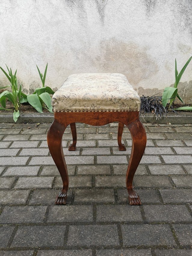 Pufas, minkšta tabutetė, antikvarinė. Tvirtas, ąžuolinis. Sėdimosios dalies aukštis 51, ilgis 46, plotis 33 cm. Kaina 93