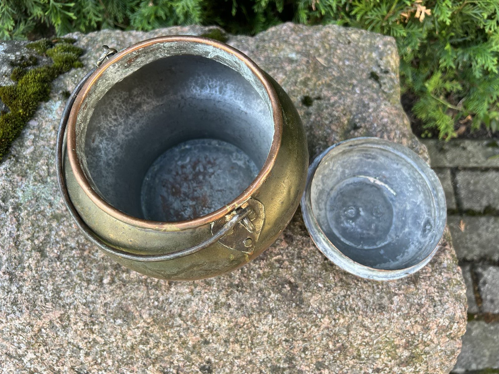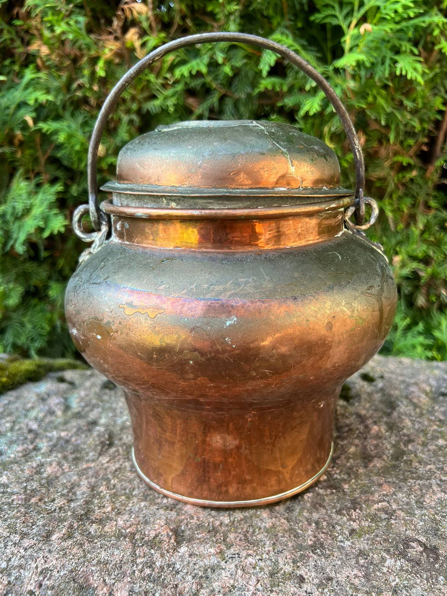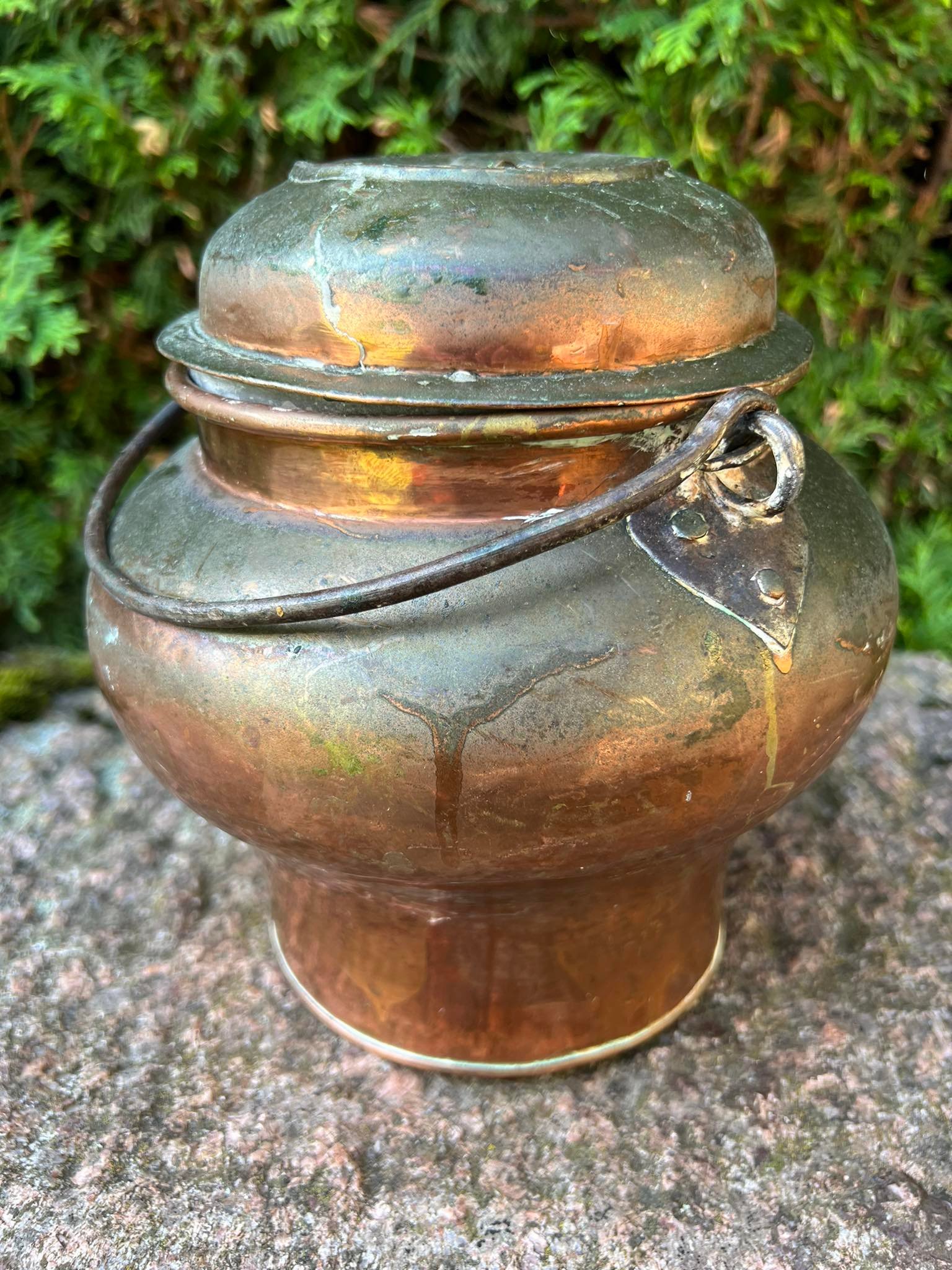 Puodas, kibiras su dangčiu ir rankena, varinis, kaltinis, antikvarinis. Nekiauras. Kaina 53
