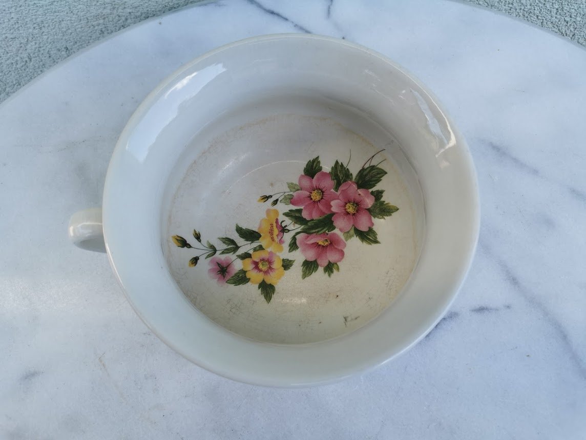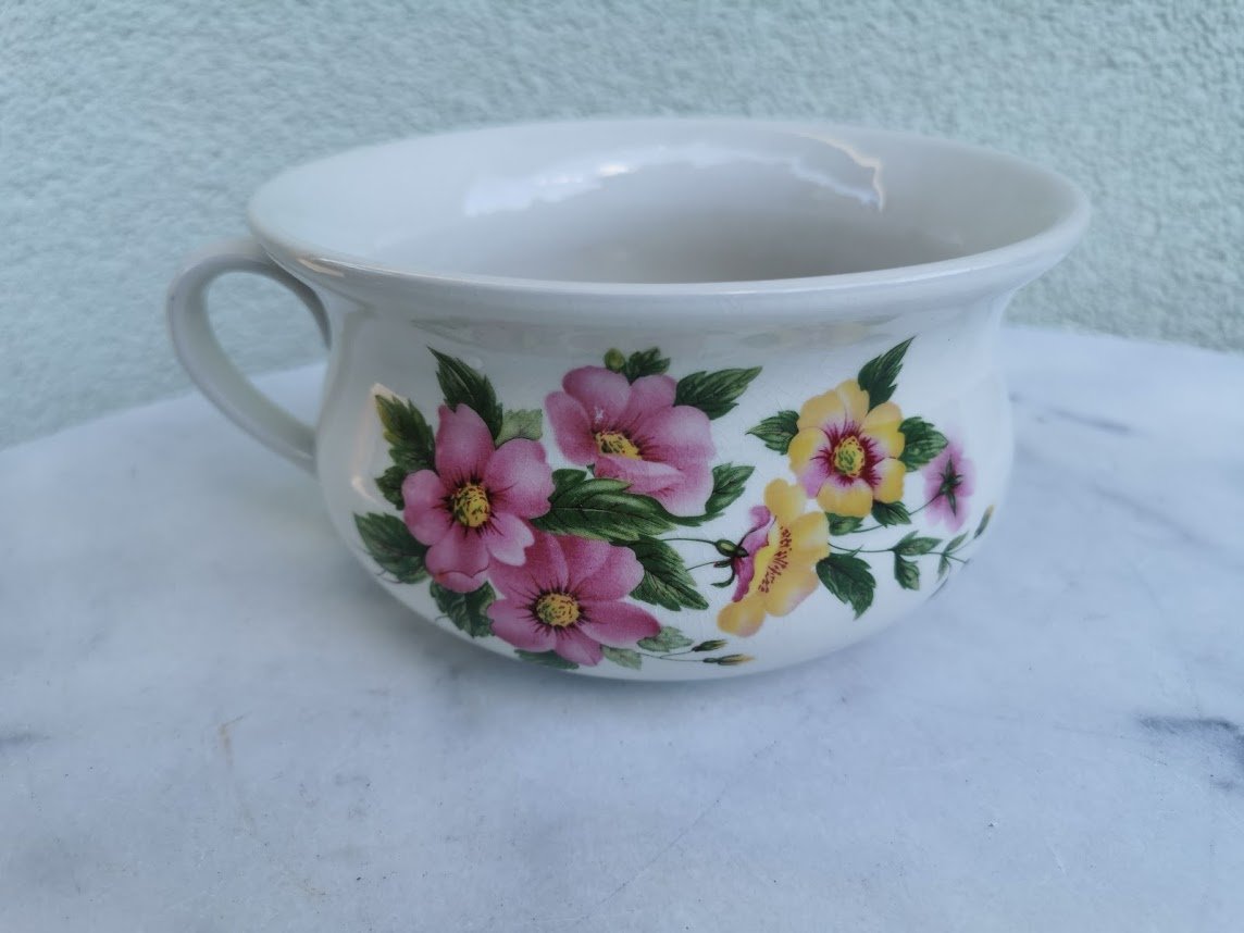Puodas su rankena, porcelianinis, gėlėtas, angliškas. Aukštis 9, skersmuo 16 cm. Kaina 12