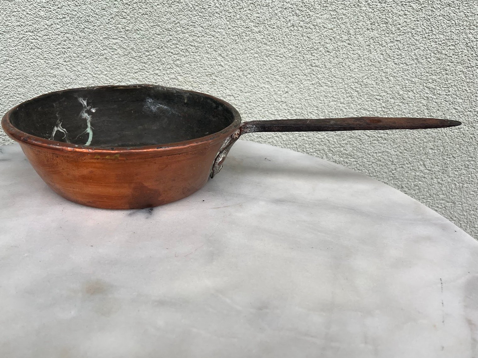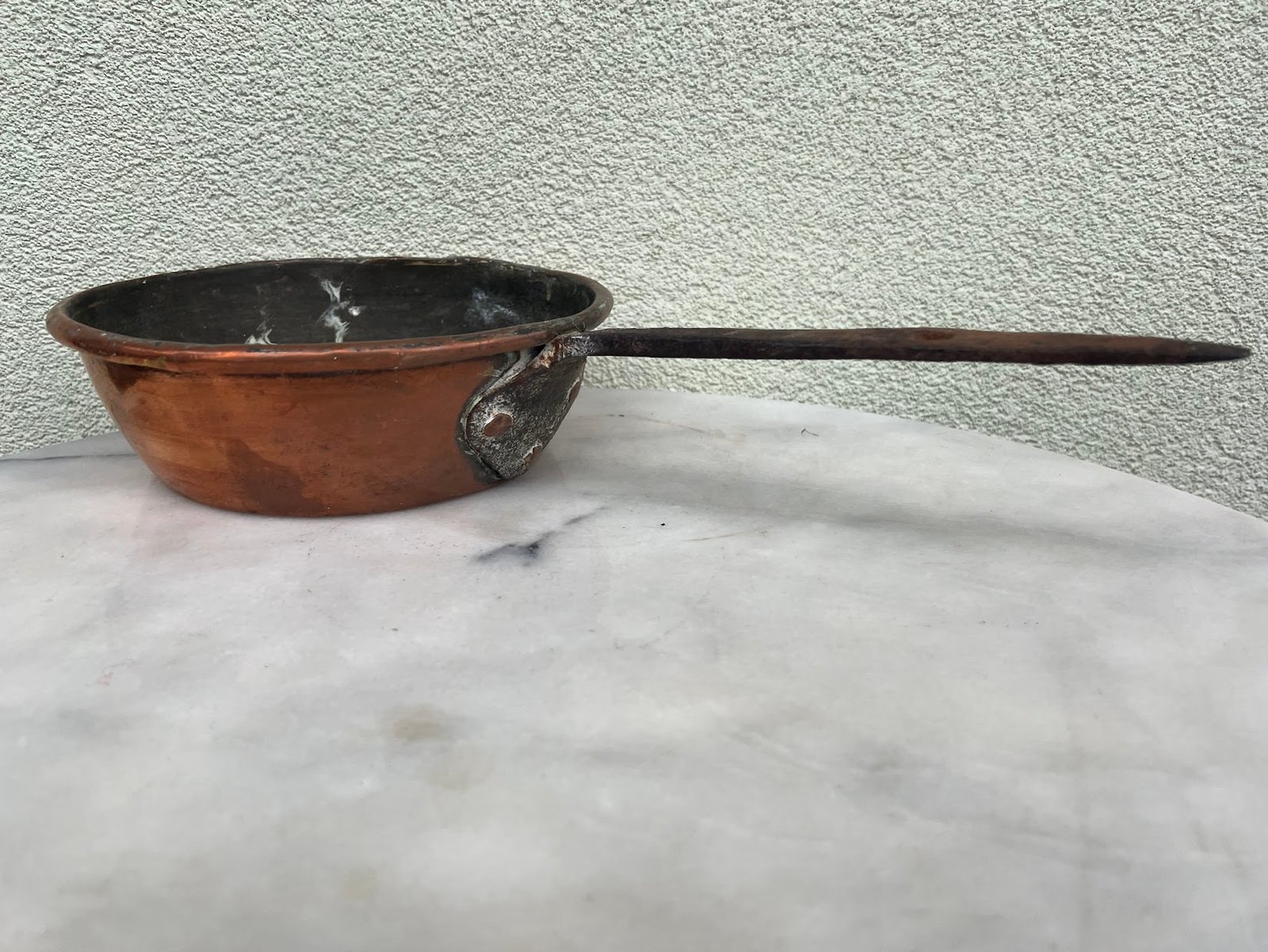 Puodas varinis su rankena, kaltinis, antikvarinis. Puodo skersmuo 22, aukštis 7 cm. Kaina 43