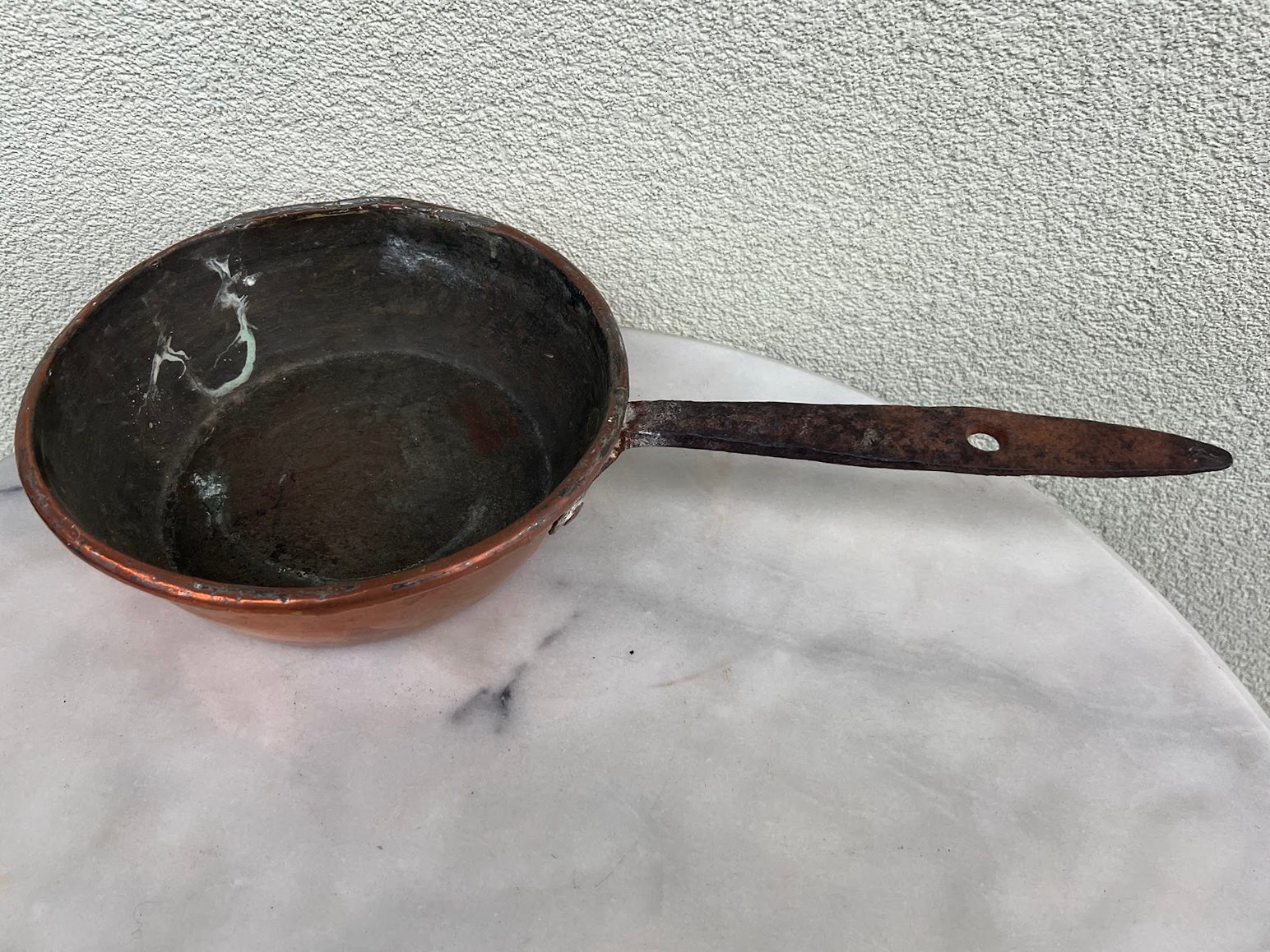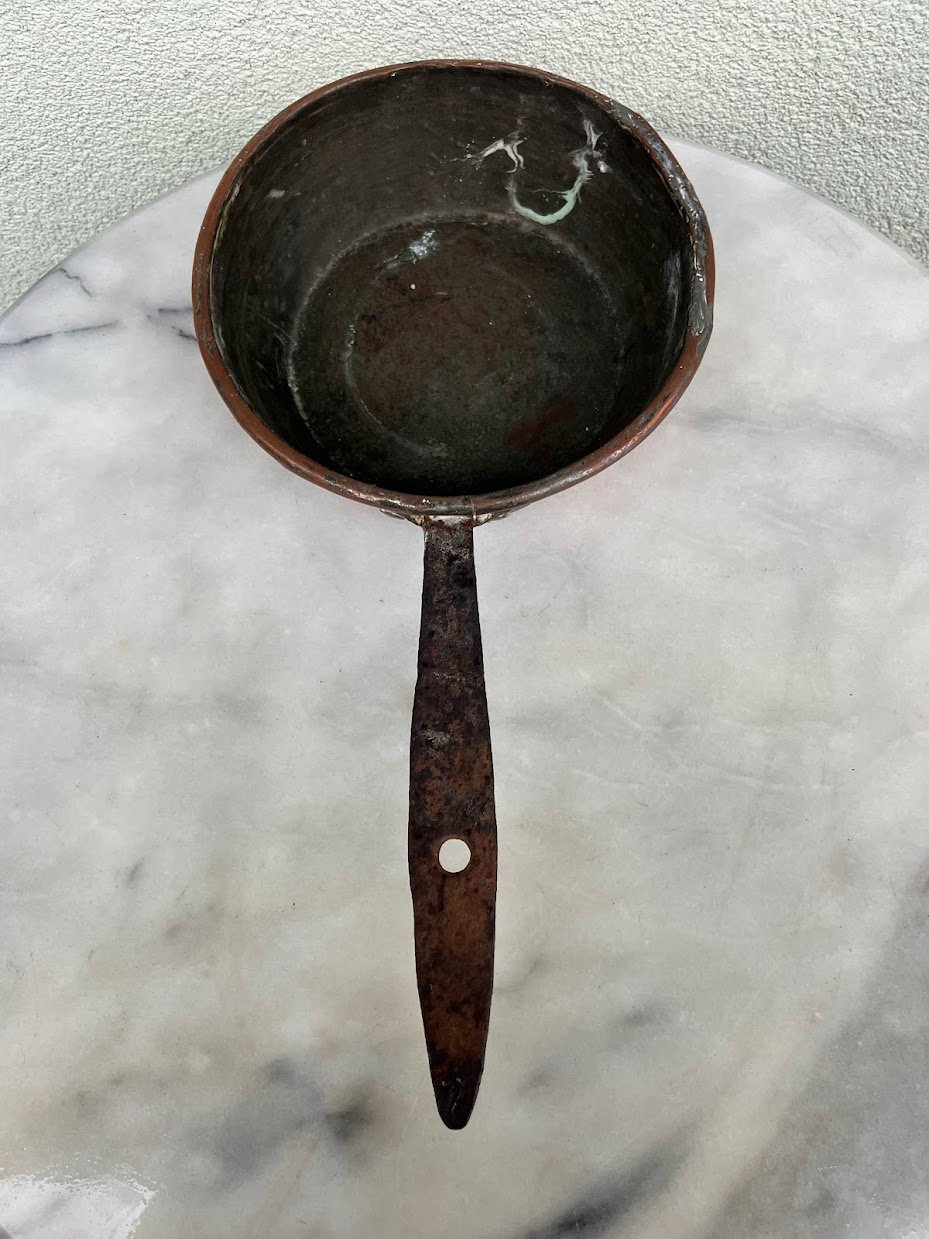 Puodas varinis su rankena, kaltinis, antikvarinis. Kaina 43