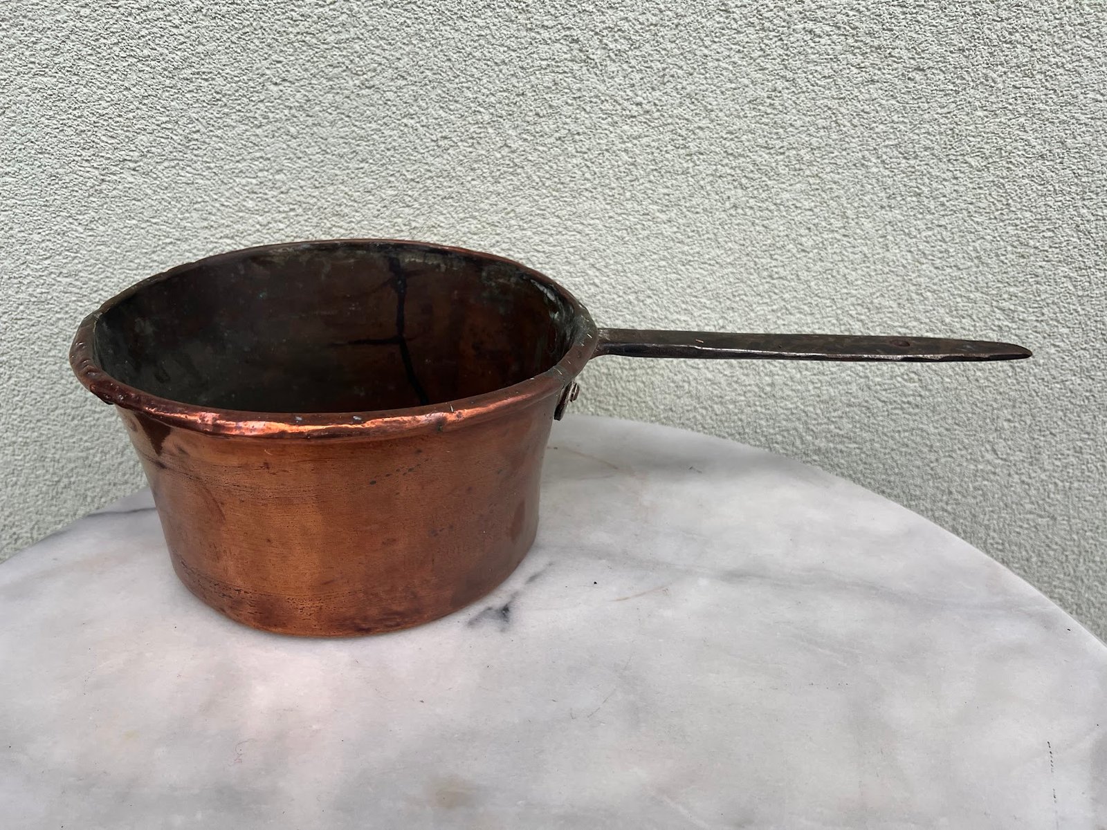 Puodas varinis su rankena, varinis, kaltinis, antikvarinis. Puodo skersmuo 24,5, aukštis 13,5 cm. Kaina 66
