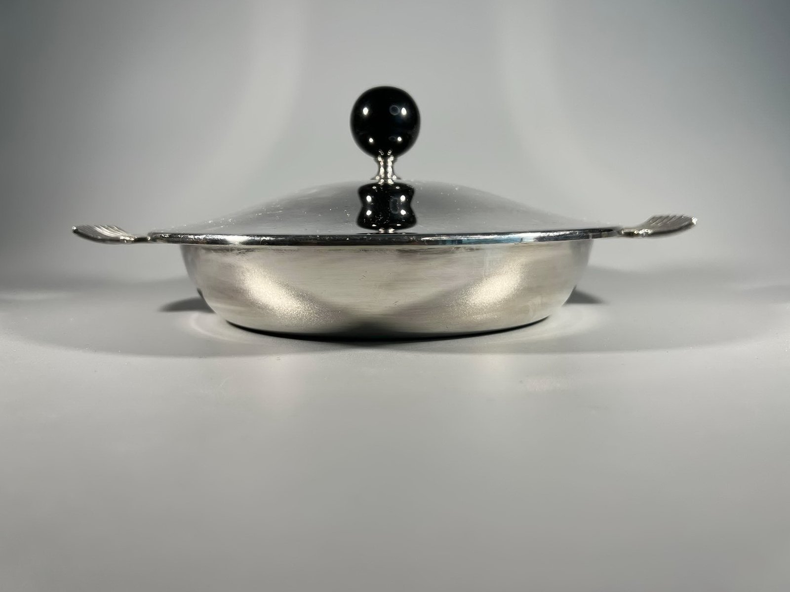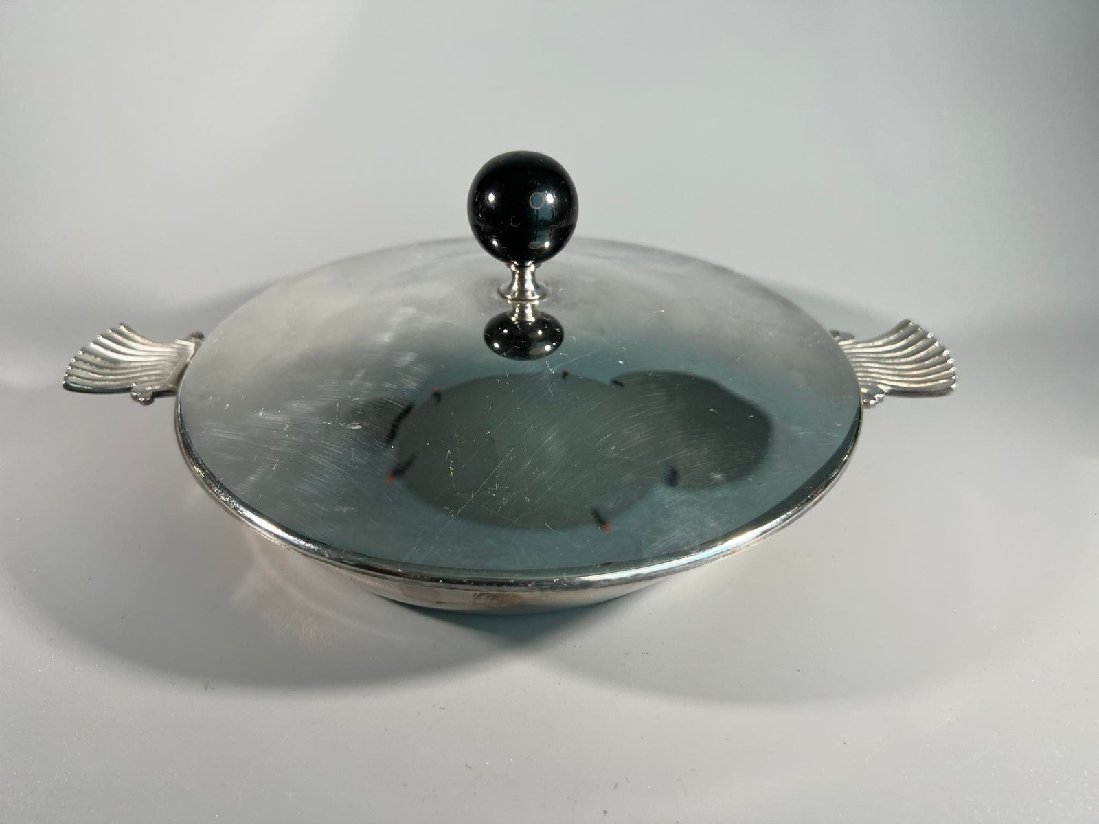 Puodas žemas, antikvarinis, tnkamas naudojimui. Aukštis su dangčiu 9, be dangčio 4 cm. Skersmuo be rankenų 18 cm. Kaina 28