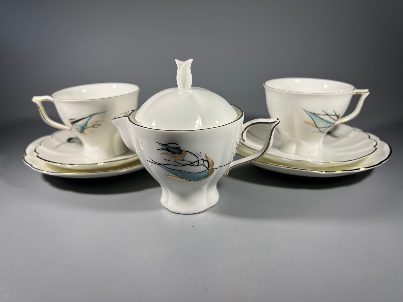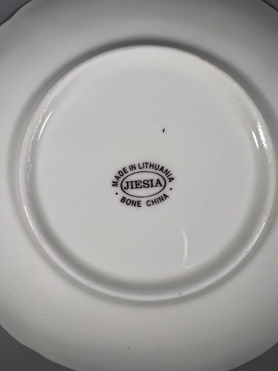 Puodeliai su lėkštutėmis ir indu grietinėlei kaulinio porceliano. Gamykla Kauno Jiesia. Viena mažalėkštutė įskilusi. Kaina 13 už viską