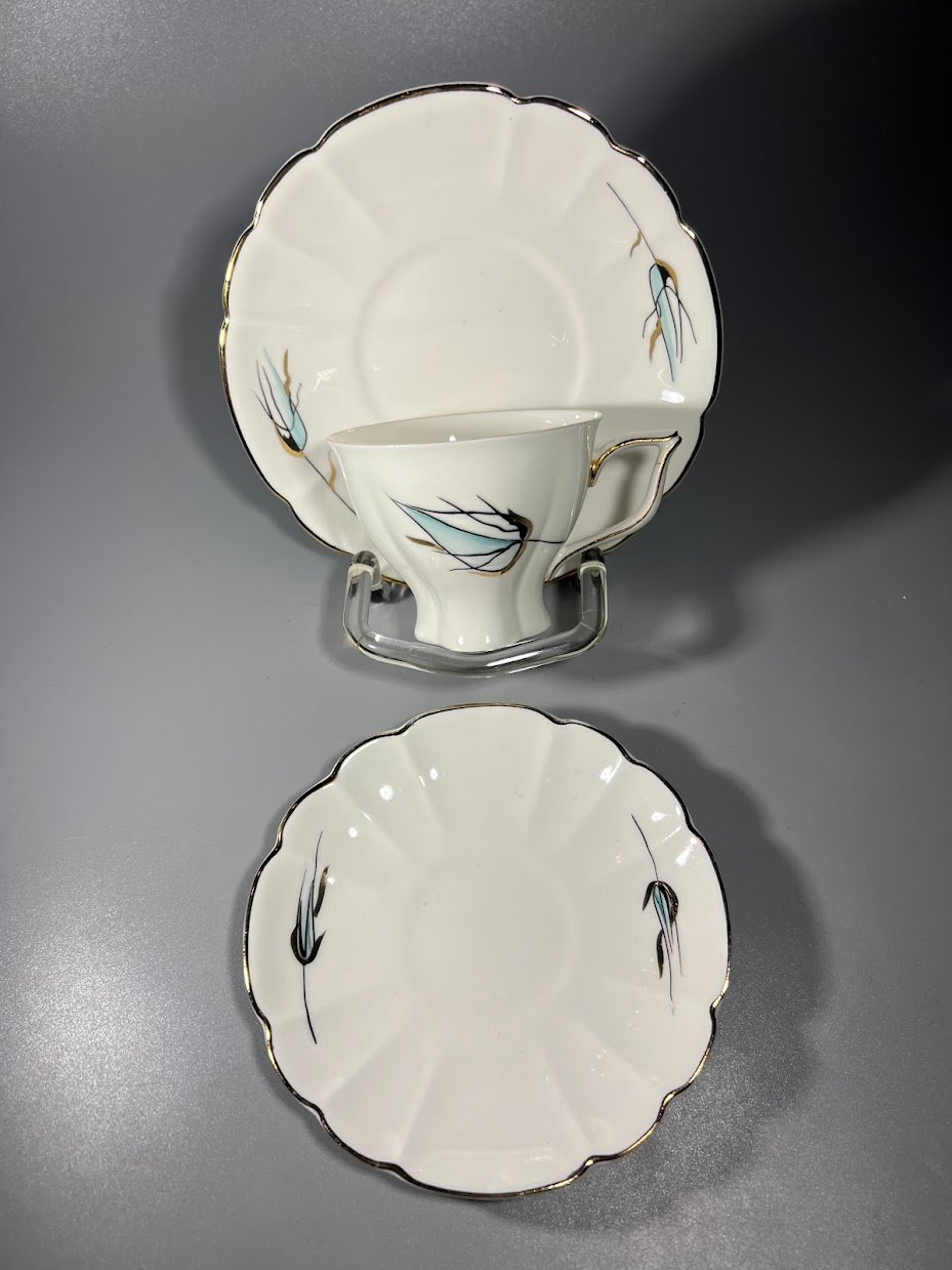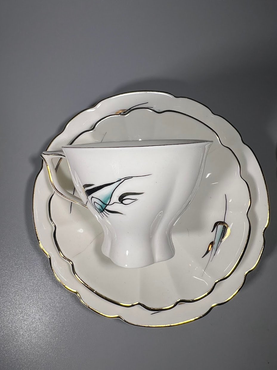 Puodeliai su lėkštutėmis ir indu grietinėlei kaulinio porceliano. Gamykla Kauno Jiesia. Kaina 13 už viską