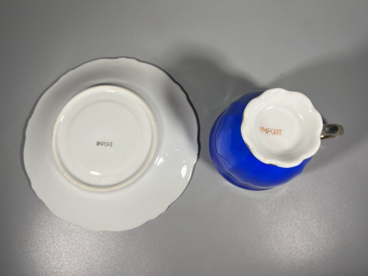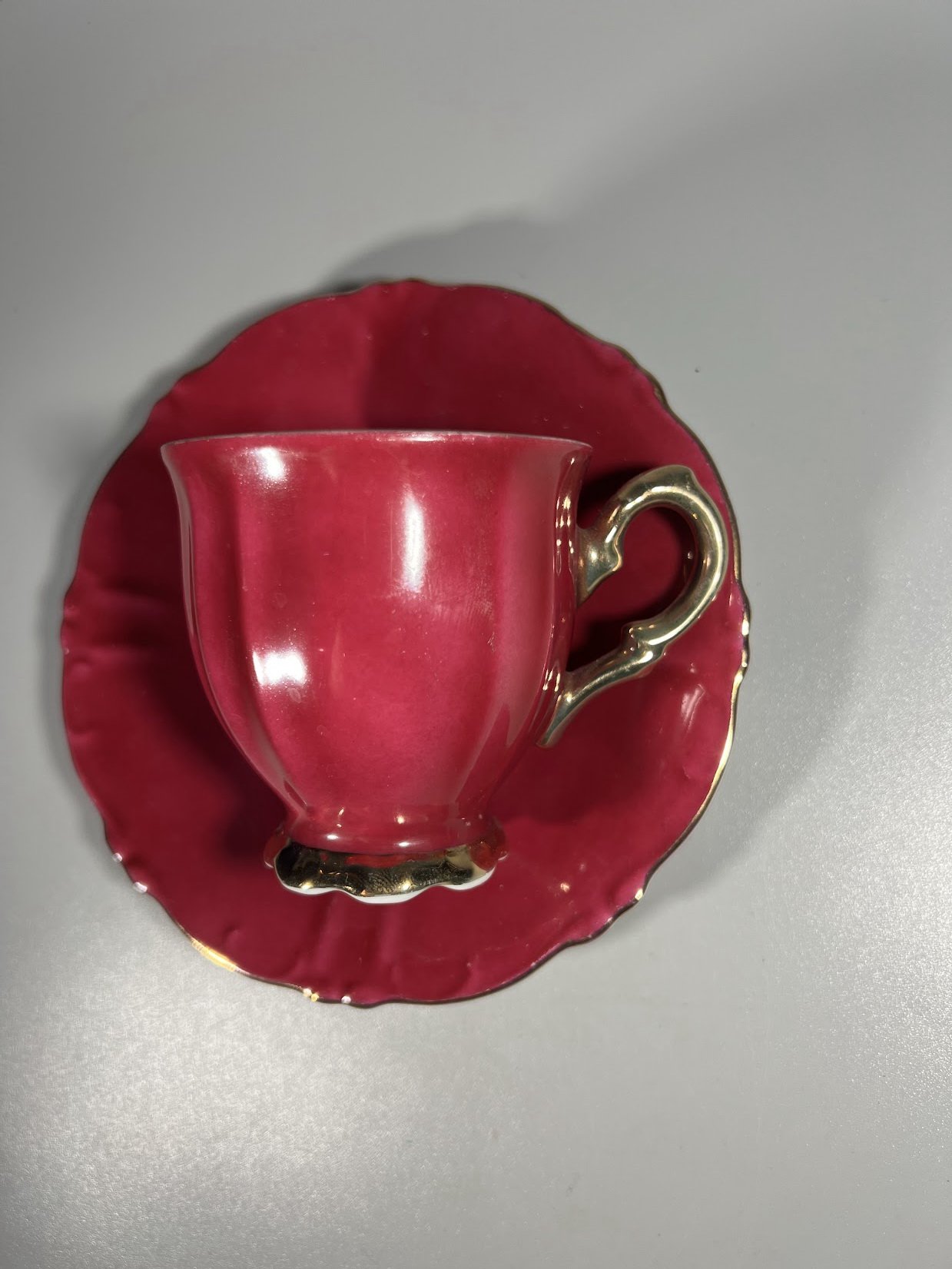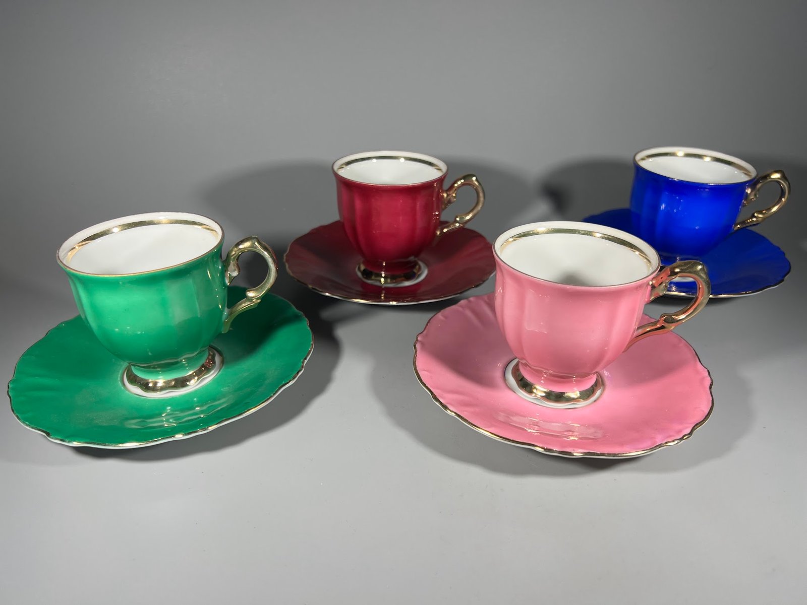 Puodeliai su lėkštutėmis porcelianiniai: žalias (2 vnt.), raudonas (2 vnt.), rožinis (2 vnt.), mėlynas 1 vnt. su 2 lėkštutėm. Talpa po 130 ml. Kaina po 8
