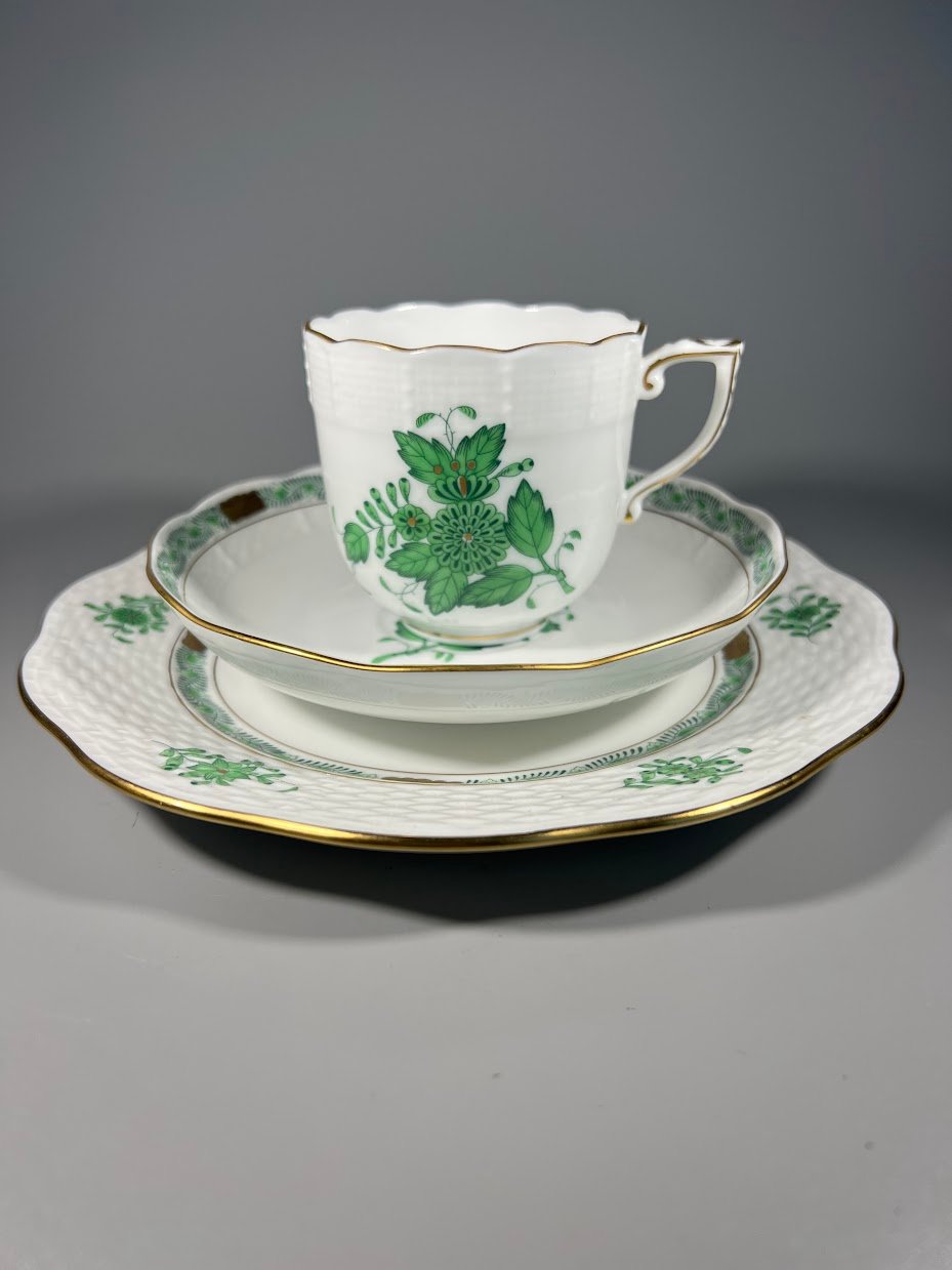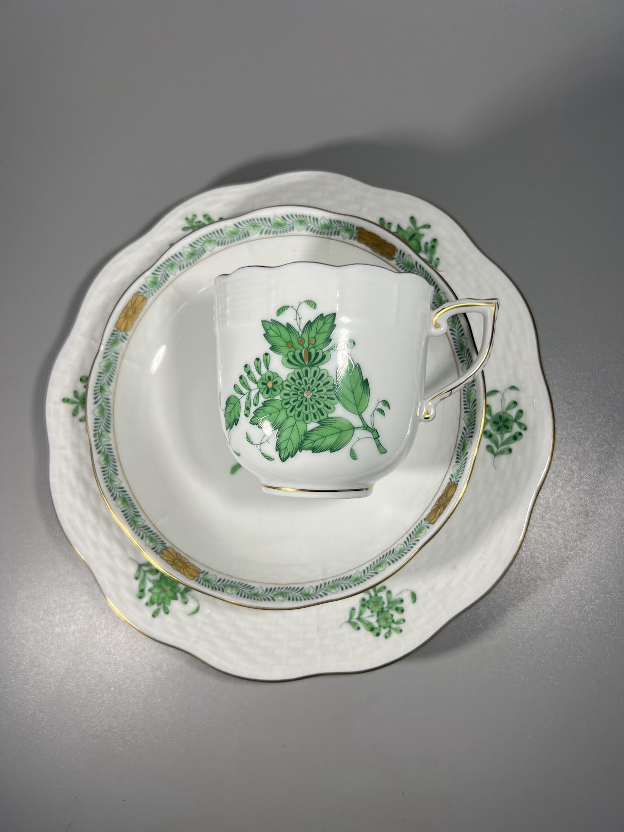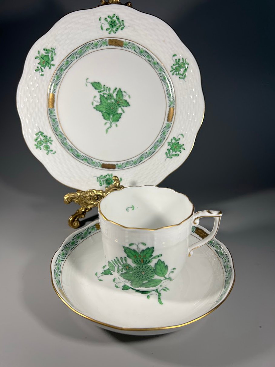 Tai yra pilnas „Trio“ komplektas (puodelis, polėkštė ir desertinė lėkštė), priklausantis tai pačiai Herend „Apponyi Green“ kolekcijai. Komplektas visada vertinamas labiau nei pavienės dalys.