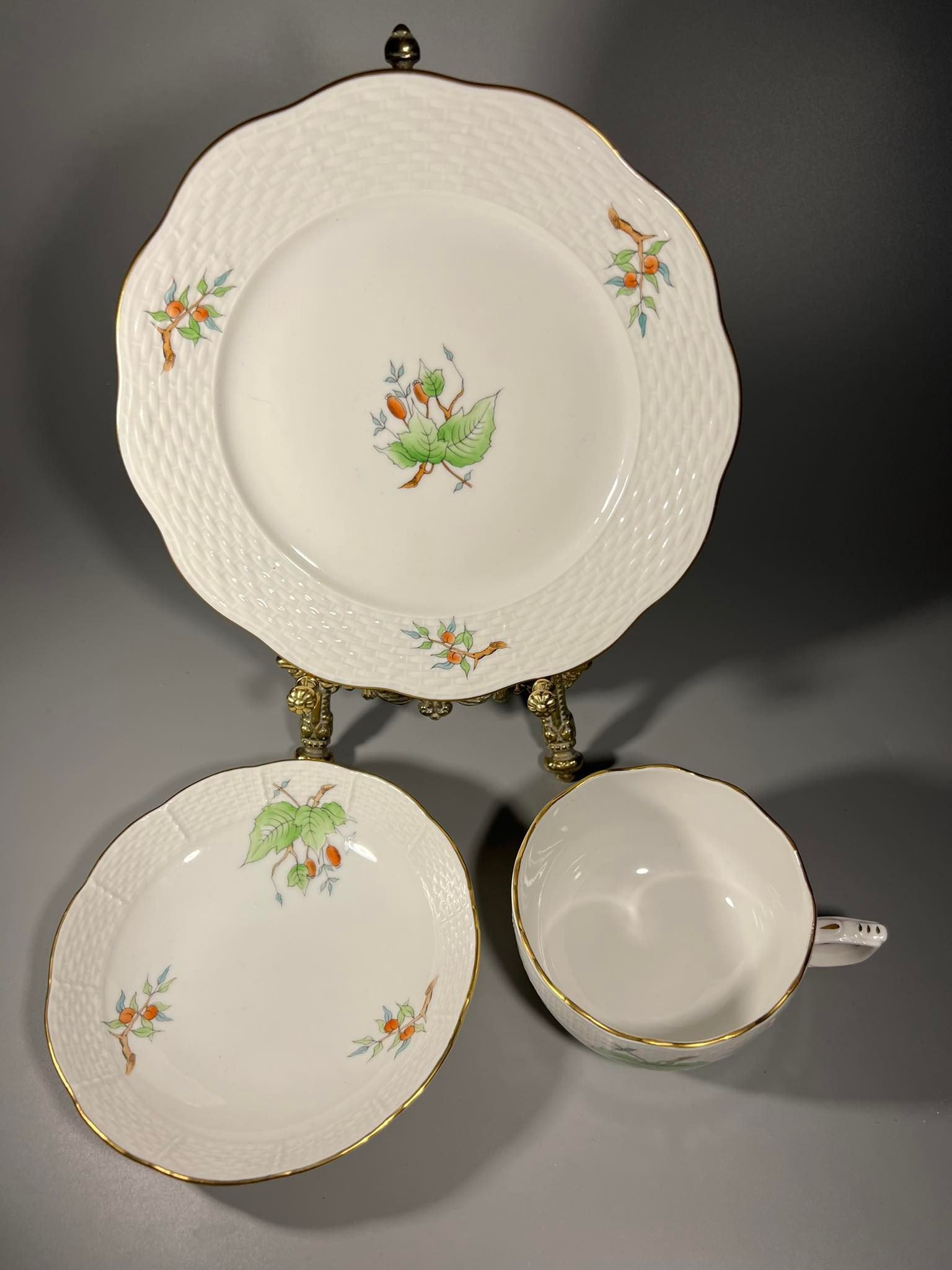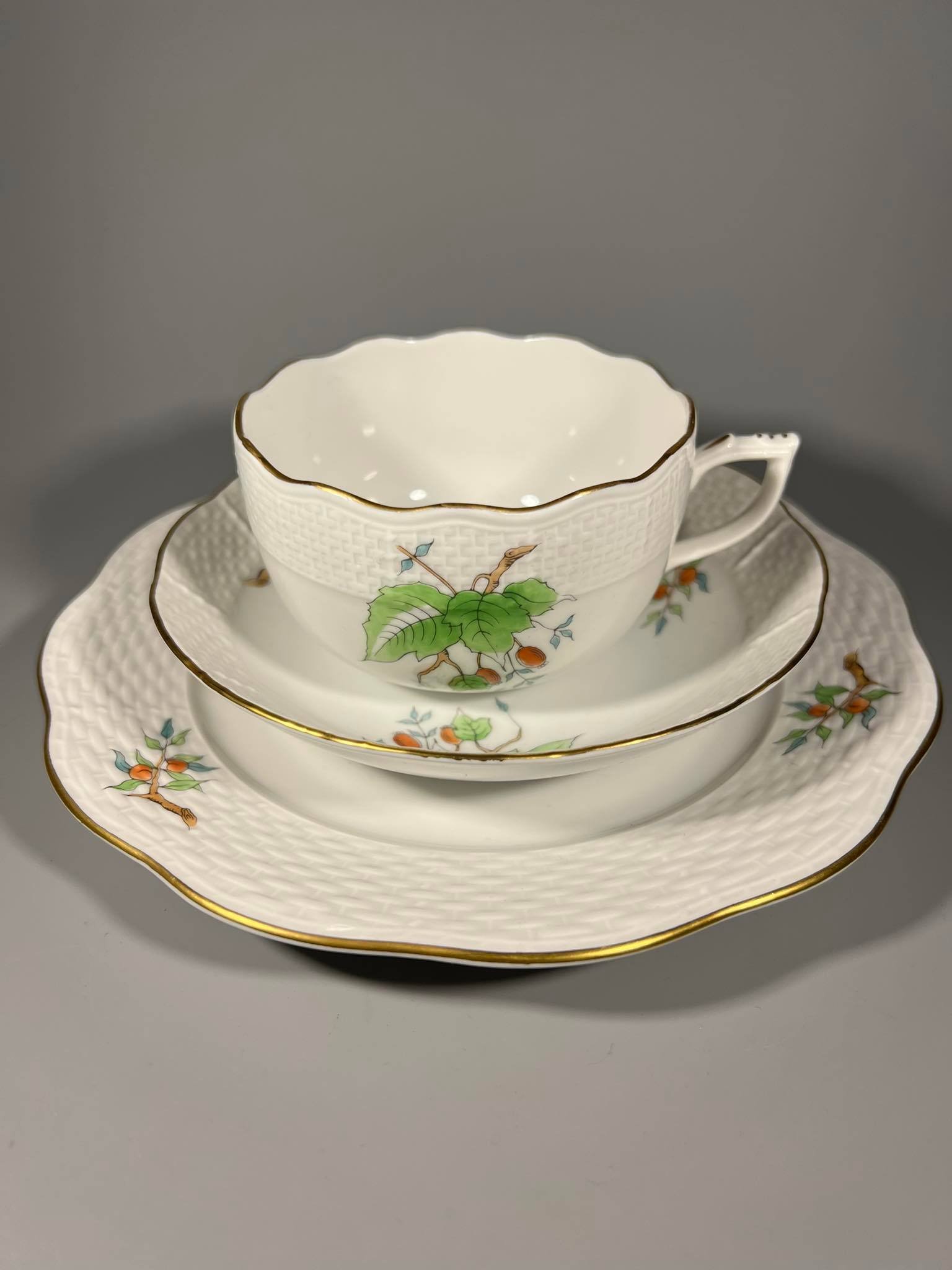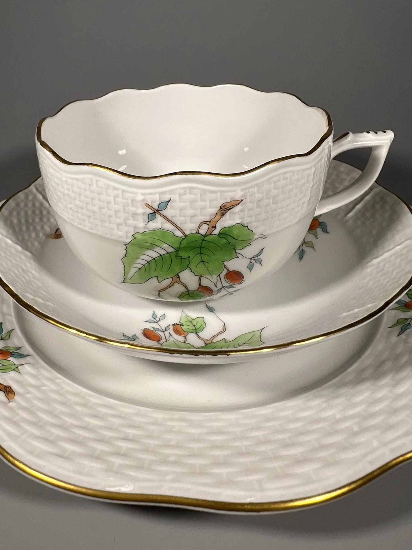 Puodelis su dviem lėkštutėmis Herend, Erškėtrožė, porcelianiniai, antikvariniai. 6 vnt. Puodelio talpa 220 ml. Didesnė lėkštutės skersmuo 19, mažesnės 14 cm. Kaina po 83