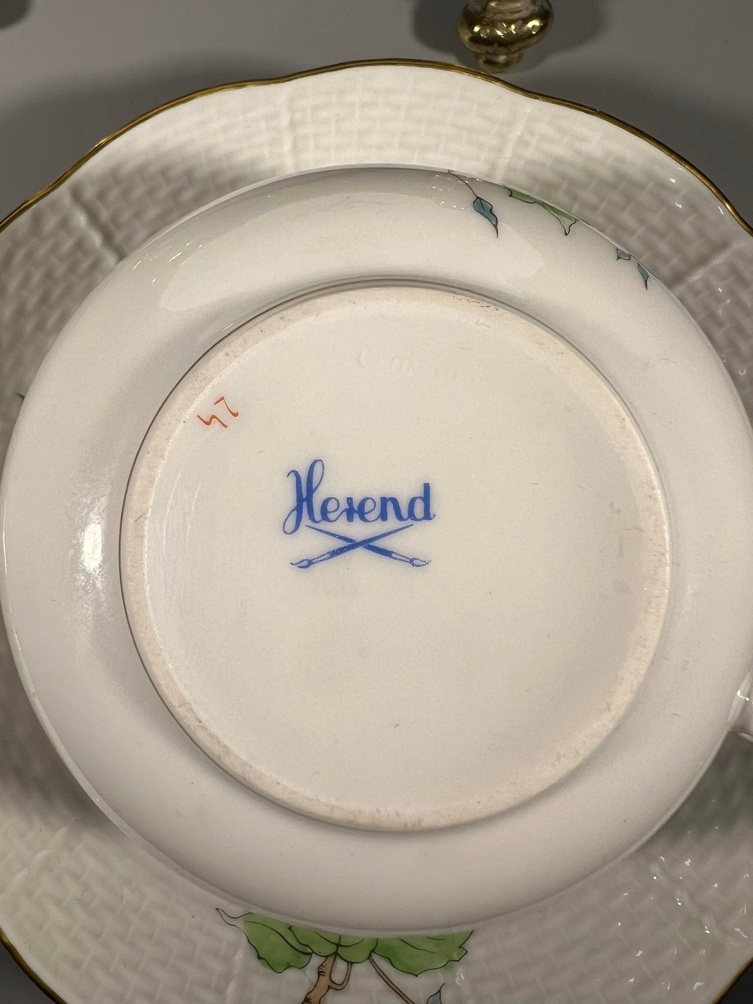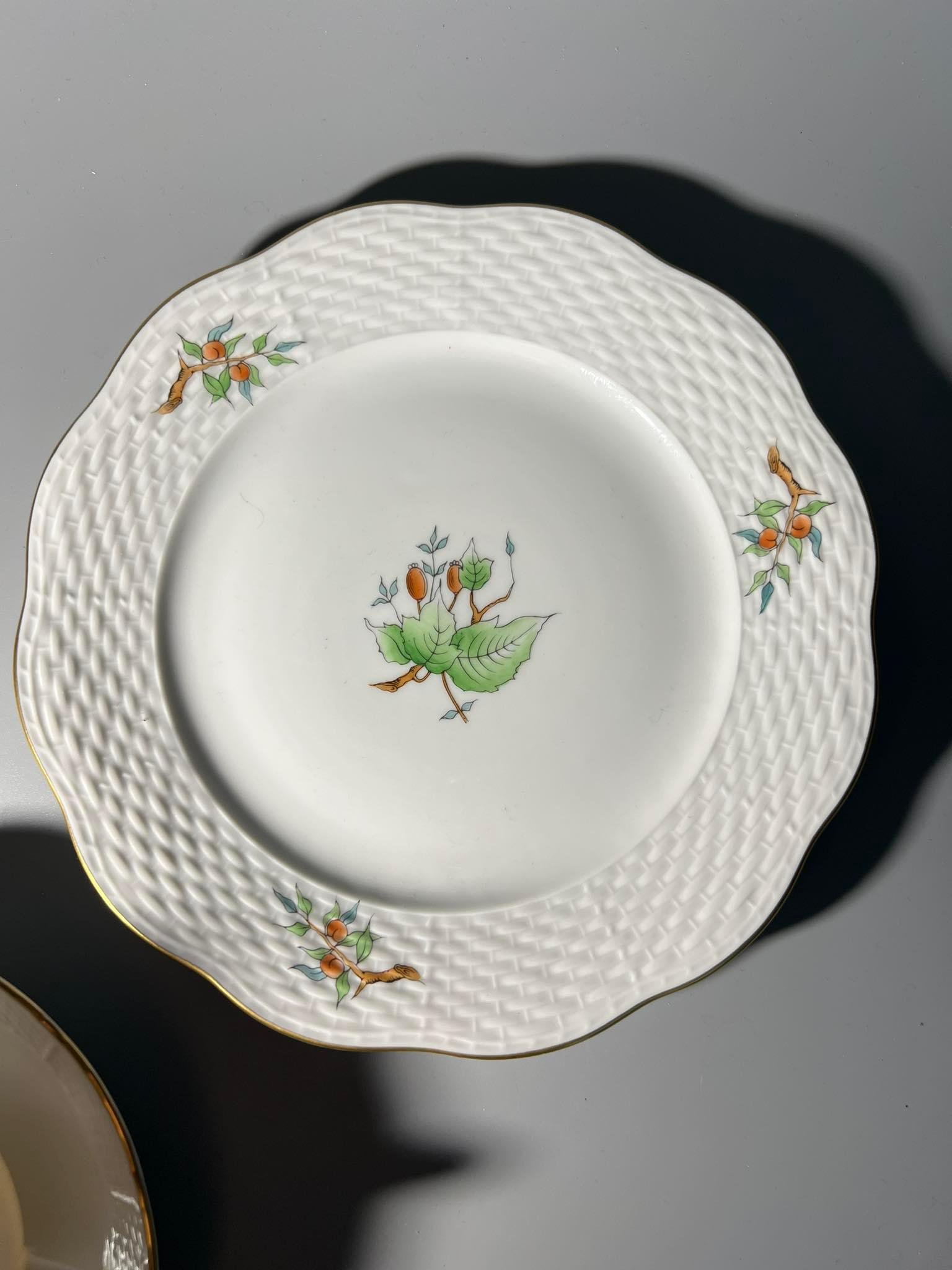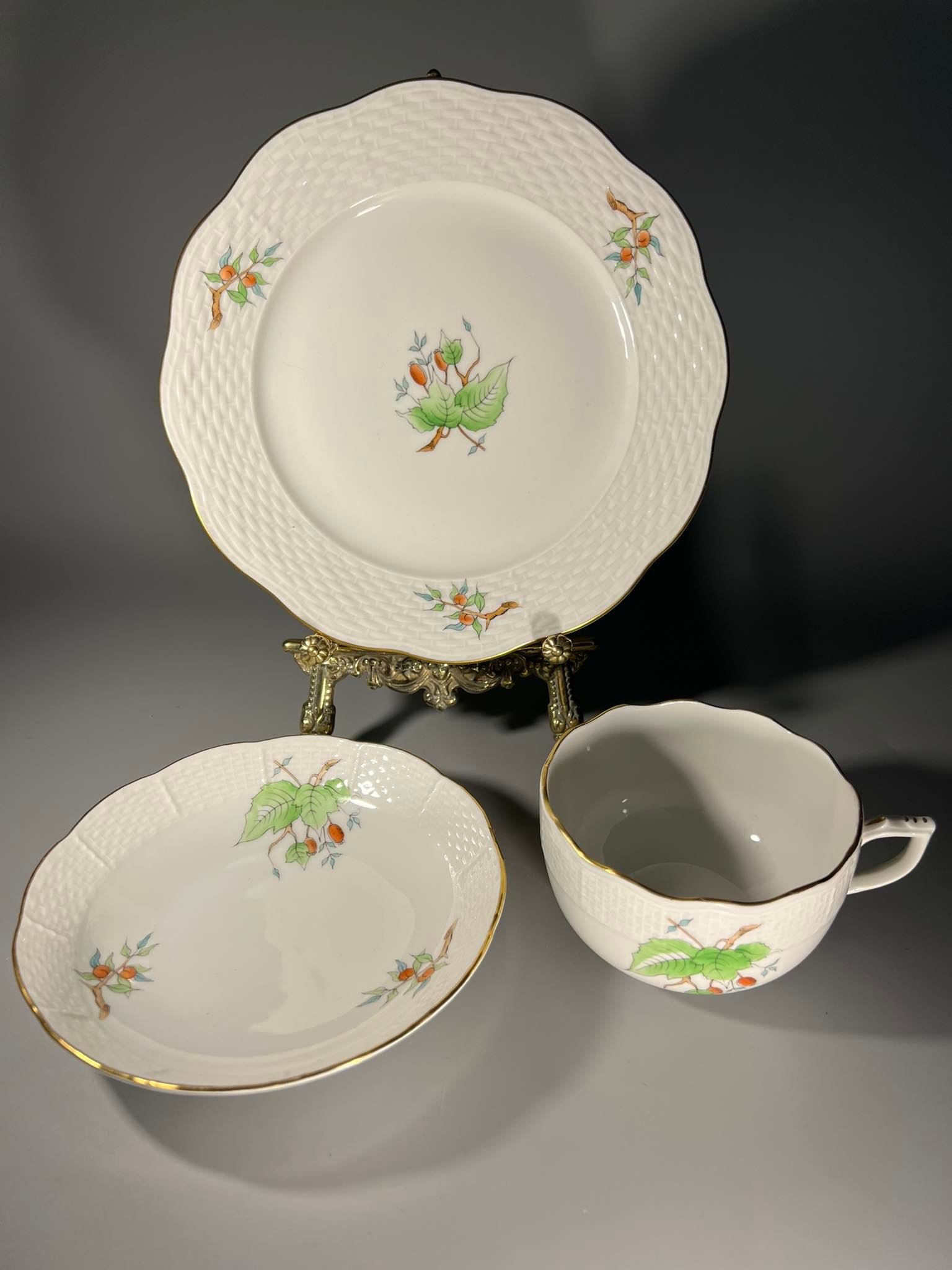 Puodelis su dviem lėkštutėmis Herend, Erškėtrožė, porcelianiniai, antikvariniai. 6 vnt. Puodelio talpa 220 ml. Didesnė lėkštutės skersmuo 19, mažesnės 14 cm. Kaina po 83