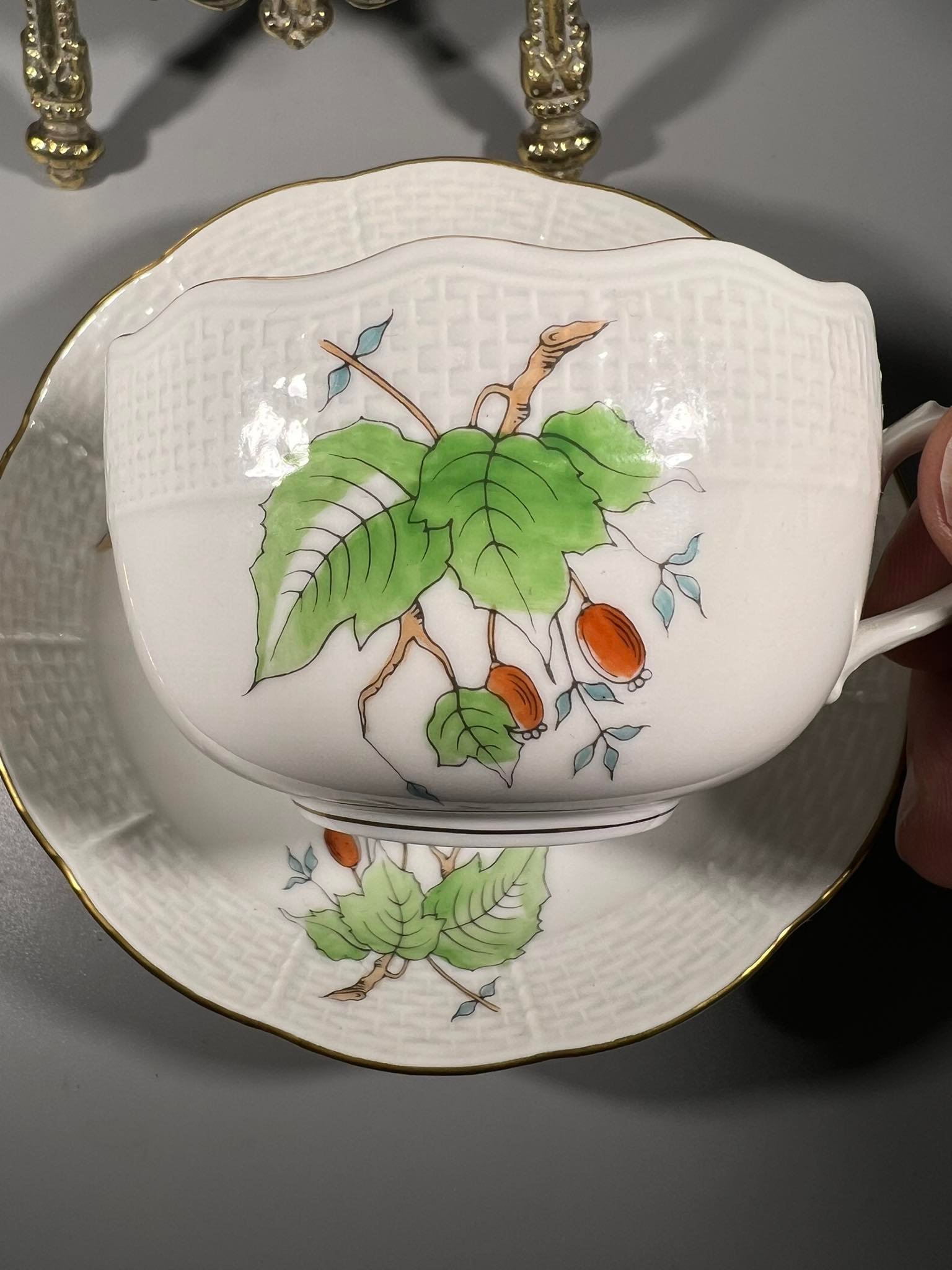Puodelis su dviem lėkštutėmis Herend, Erškėtrožė, porcelianiniai, antikvariniai. 6 vnt. Puodelio talpa 220 ml. Kaina po 83