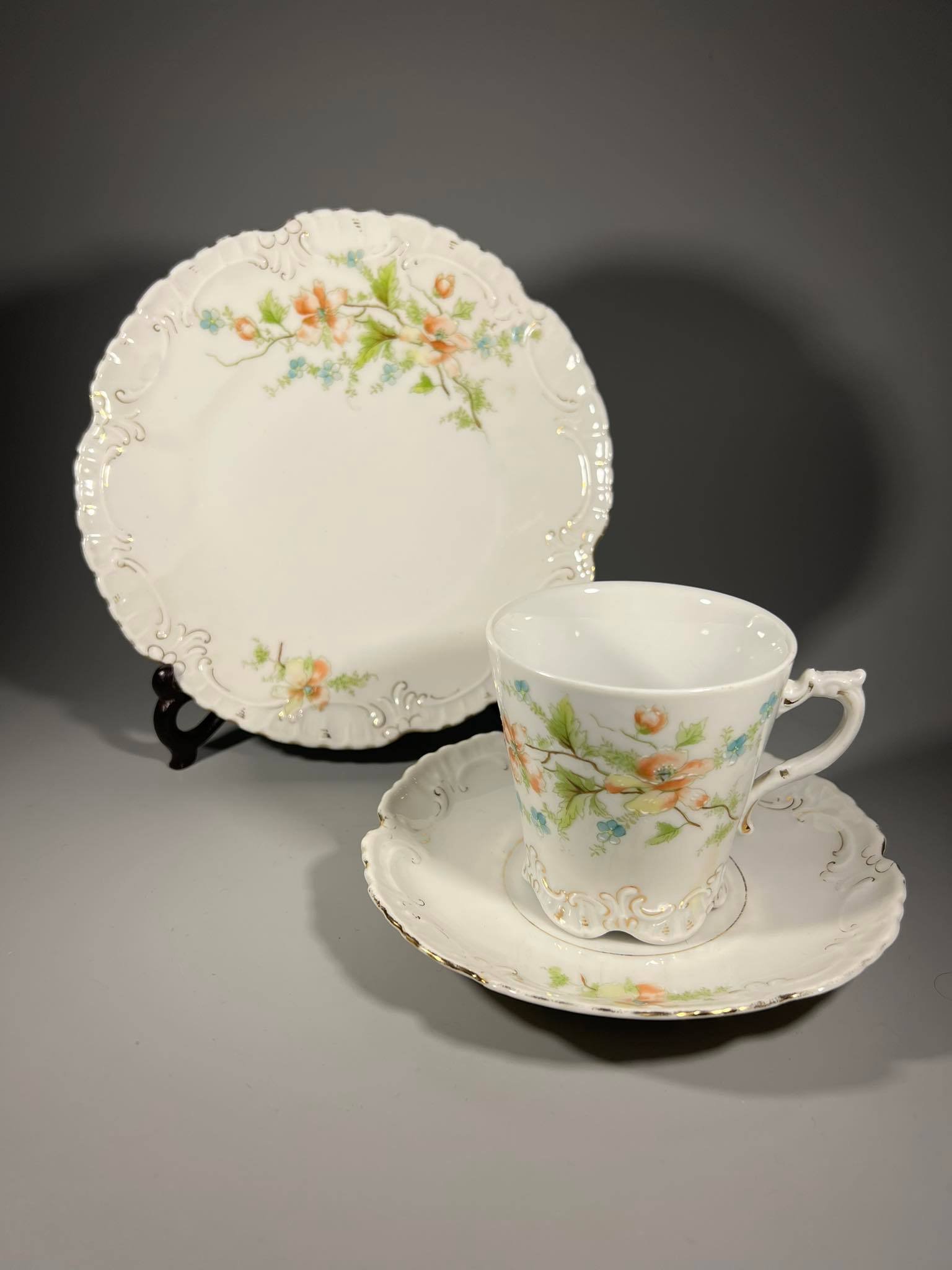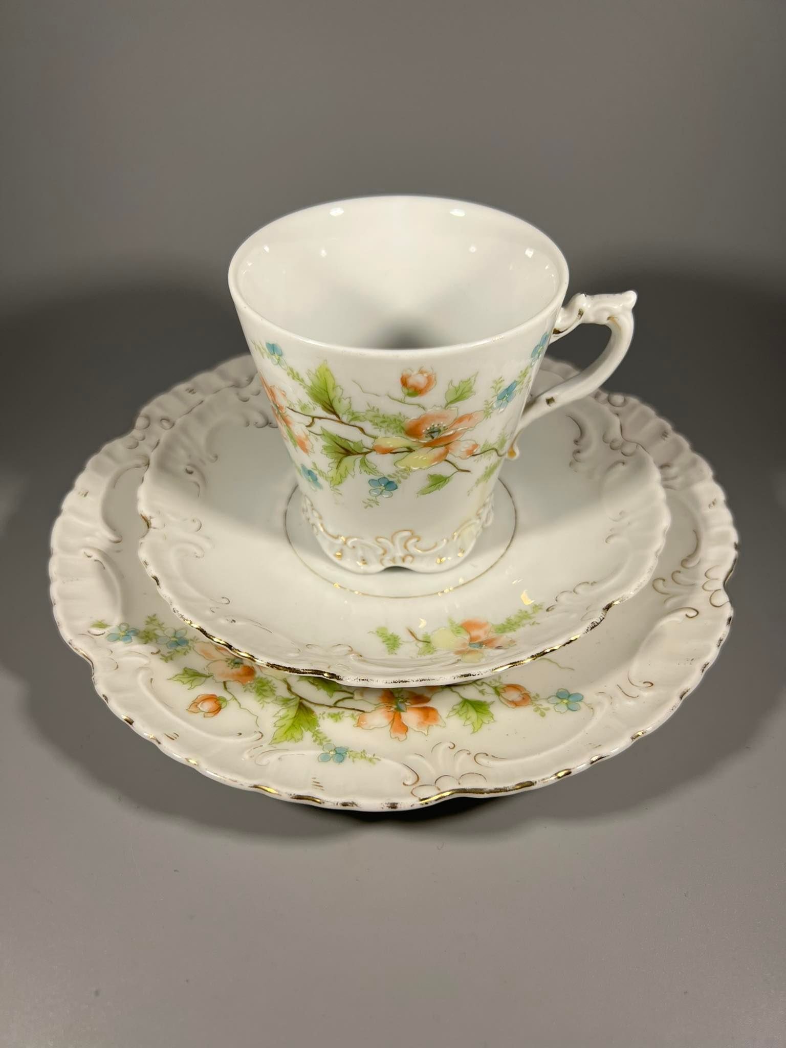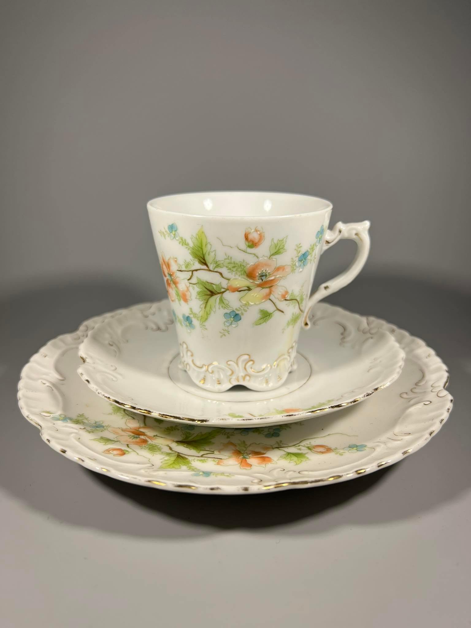 Puodelis su dviem lėkštutėmis porcelianinis, antikvarinis, apie 1900 m. Talpa 150 ml. 3 vnt. Didesnės lėkštutės skersmuo 18 cm. Kaina po 36