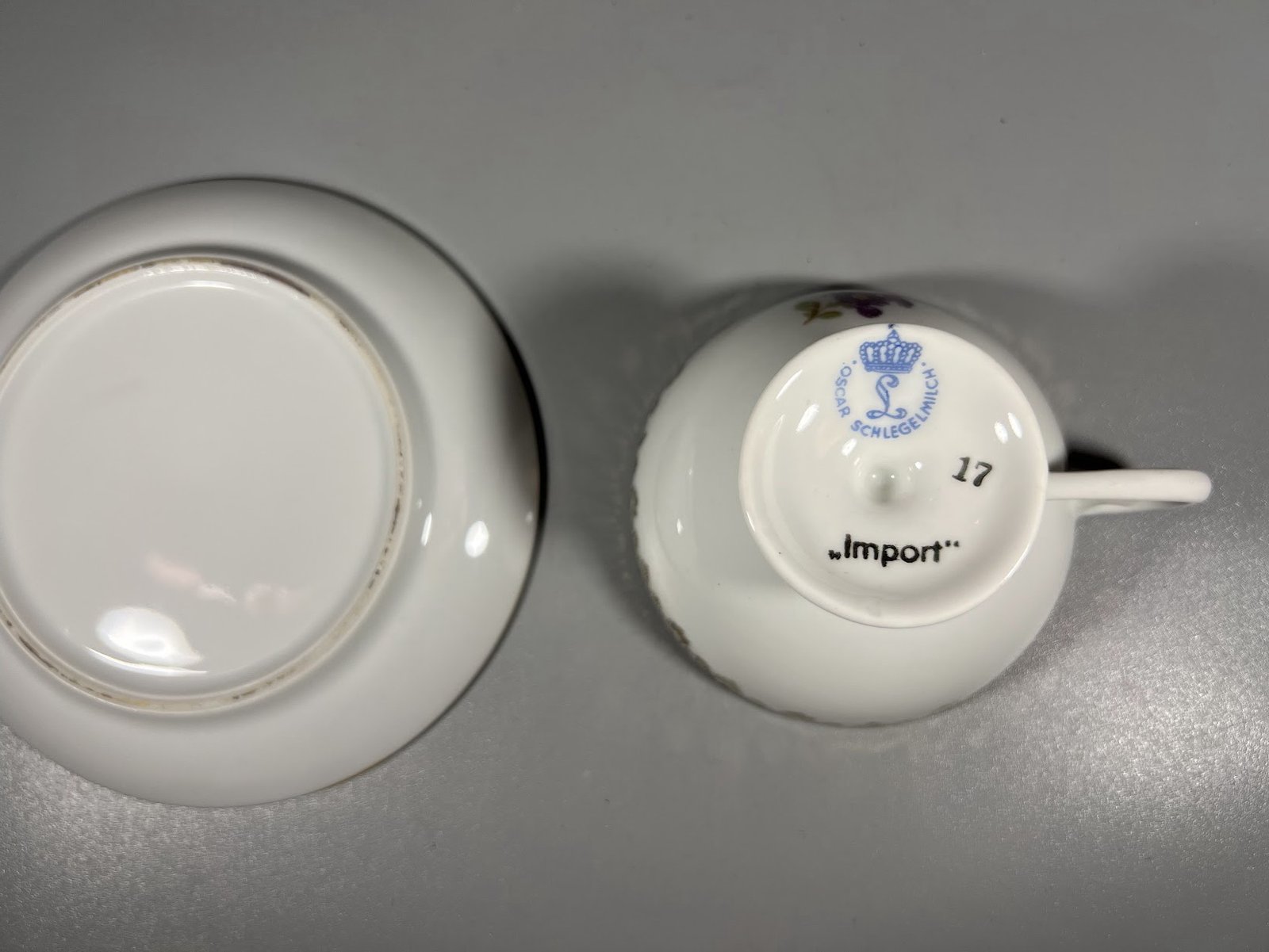 Puodelis su lėkštute porcelianinis, antikvarinis. Oscar Schlegelmilch. Vokietija. 60 ml, espresso. Kaina 18
