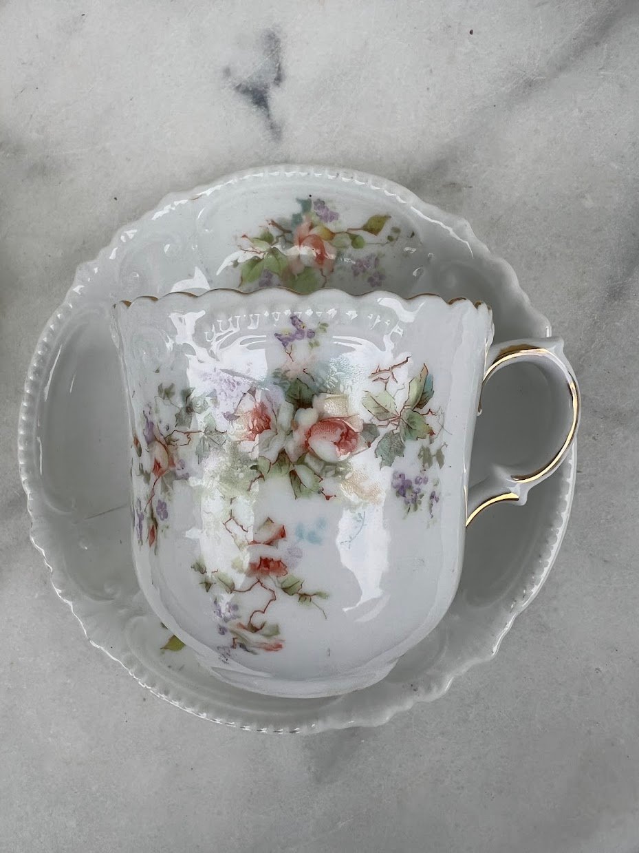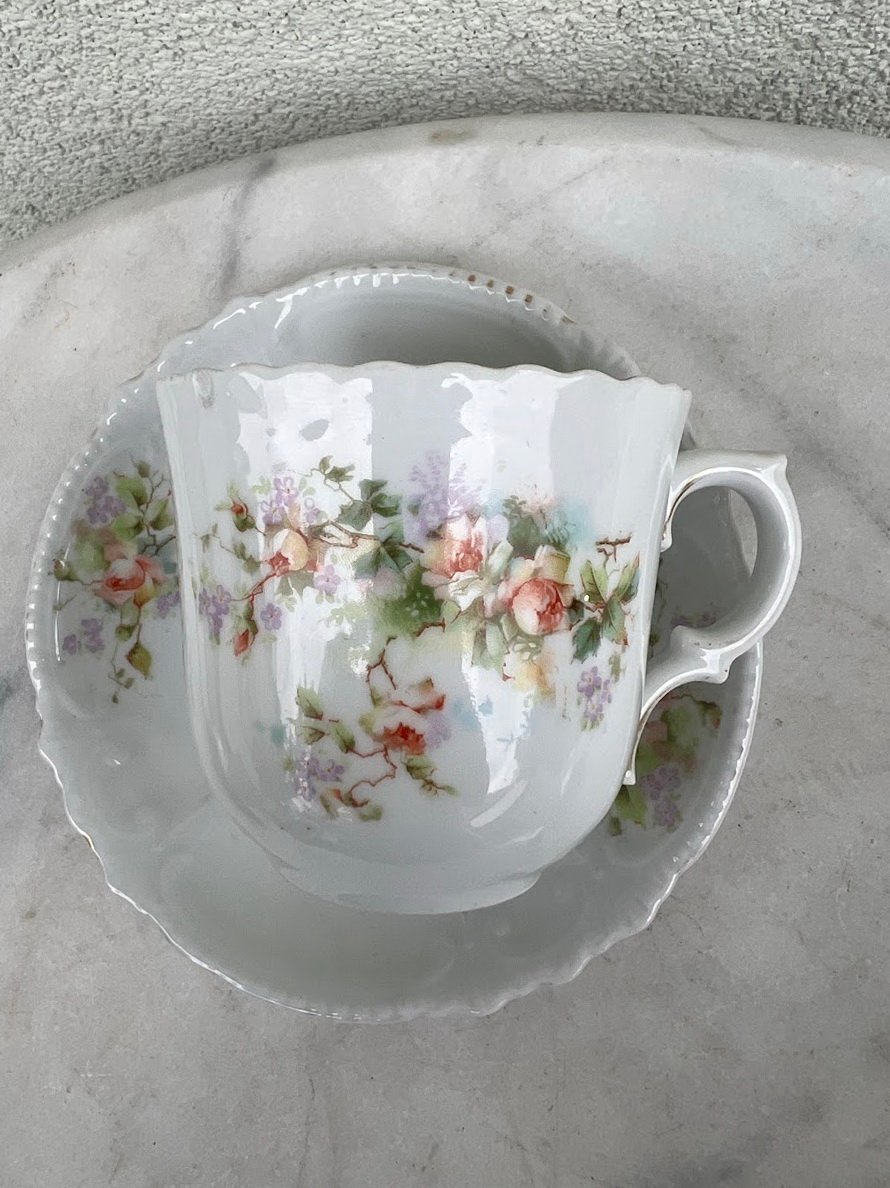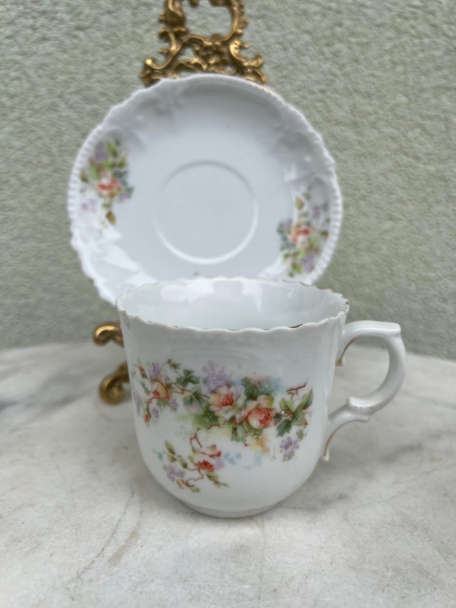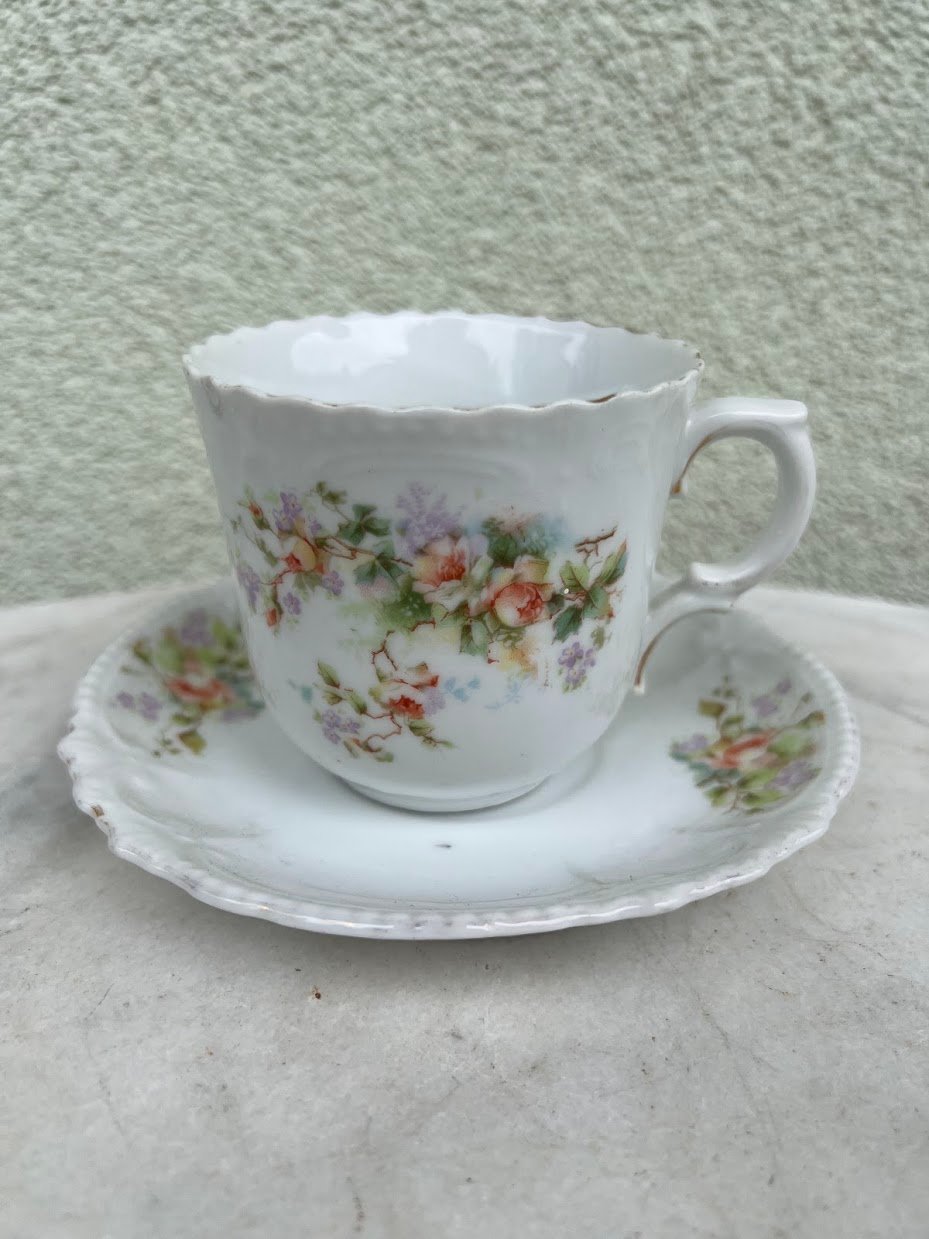 Puodelis su lėkštute porcelianinis, antikvarinis, puoštas rožėmis. Vokietijos imperija. 1880–1910 m. Puodelio talpa 200 ml. Aukštis 7,5 cm. 2 vnt. Kaina po 22