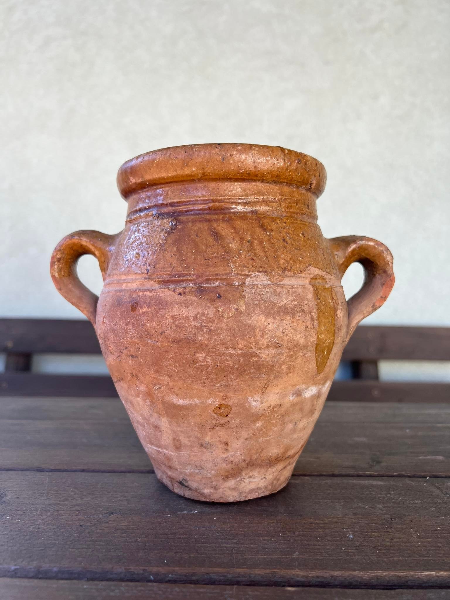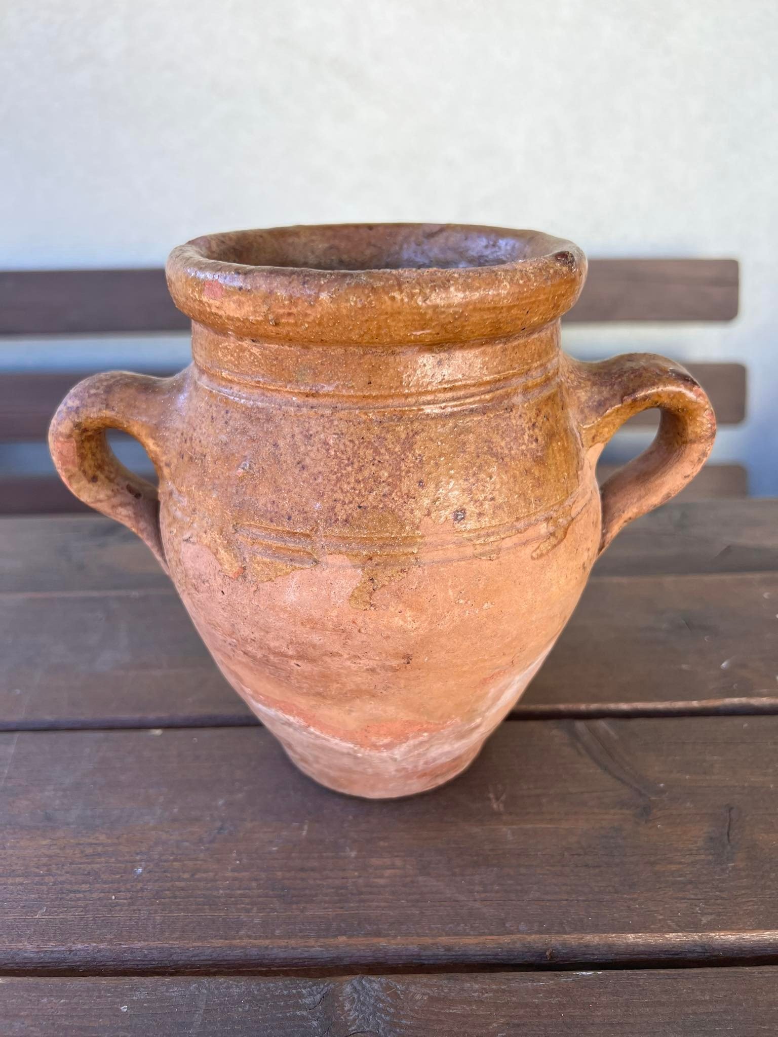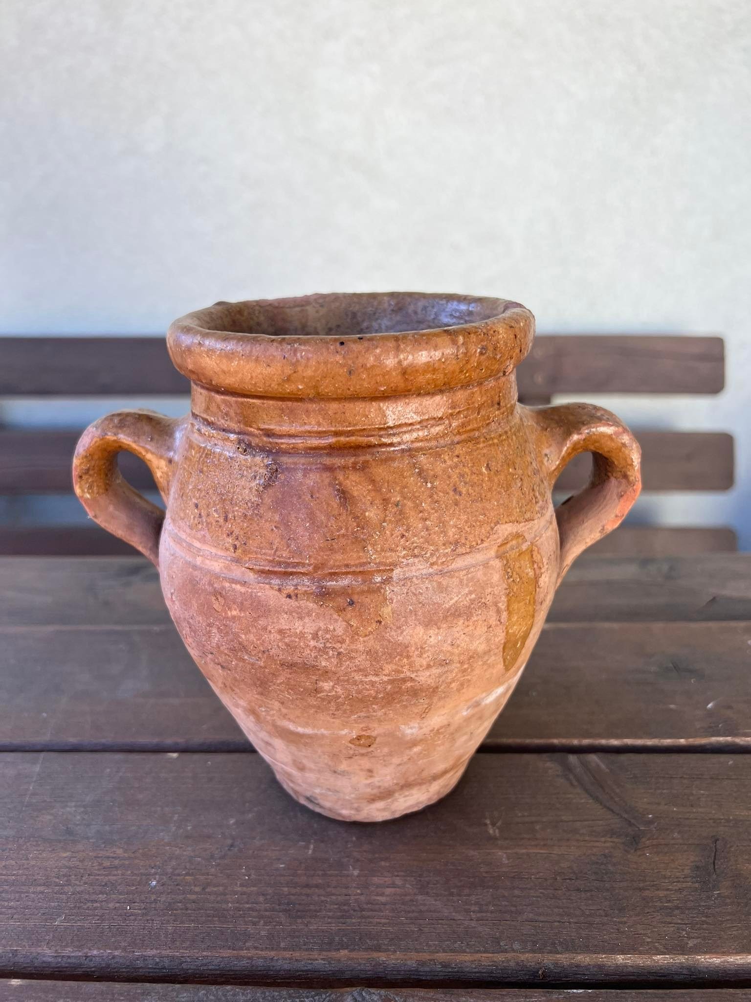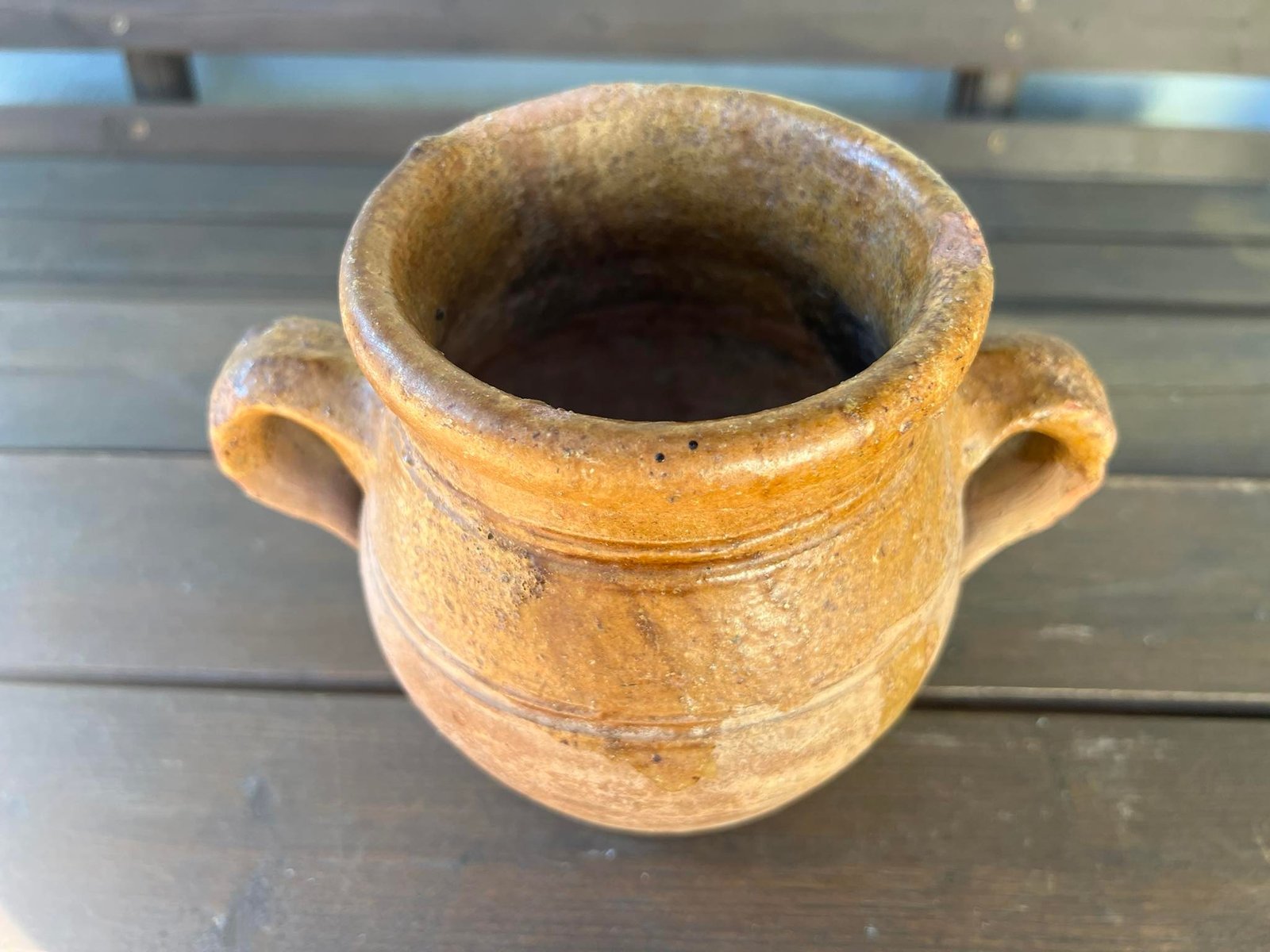 Puodynė antikvarinė, keraminė, molinė, viršutinė dalis dengta glazūra. Aukštis 17 cm. Kaina 32