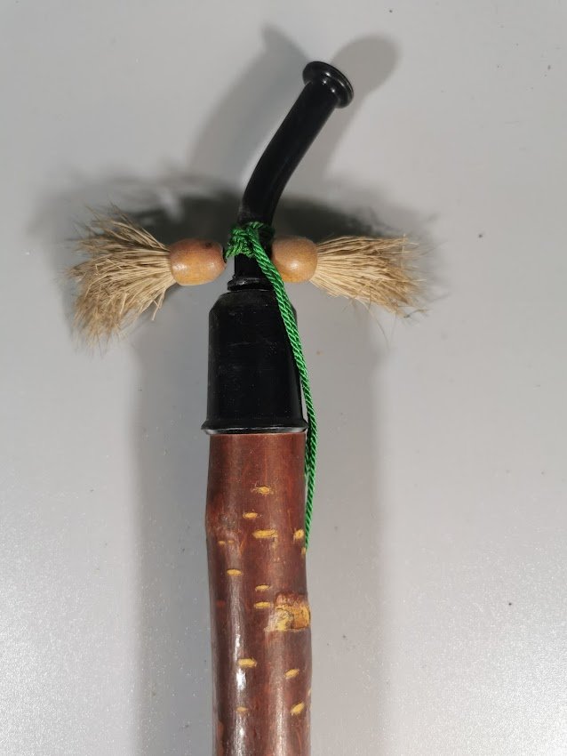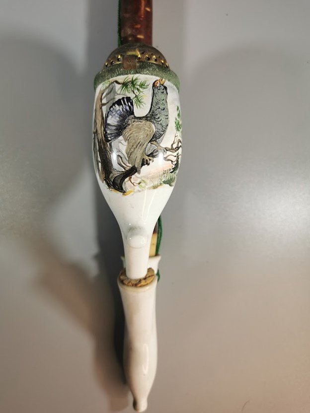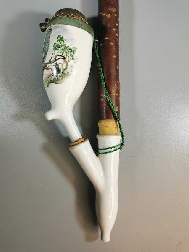 German Gesteckpfeife style tobacco pipe and porcelain bowl. This style of pipe is also known as a Jaeger Pipe, German hunter pipe, German Porcelain pipe, Tyrolean pipe, and Wine Pipe. The tobacco was packed in the porcelain bowl which was then placed in the reservoir (or abguss) of the pipe. The reservoir acted as a retainer for the juices and tar, and sometimes wine was placed in the reservoir to flavor the smoke. This style of pipe was popular in Central Europe from the 18th to the early 20th centuries and was most commonly associated with Germanic culture