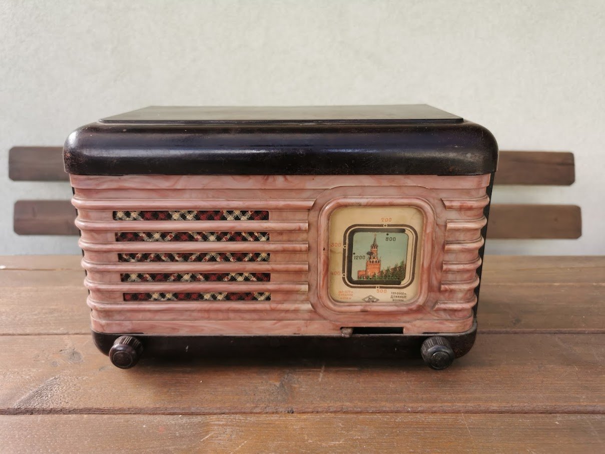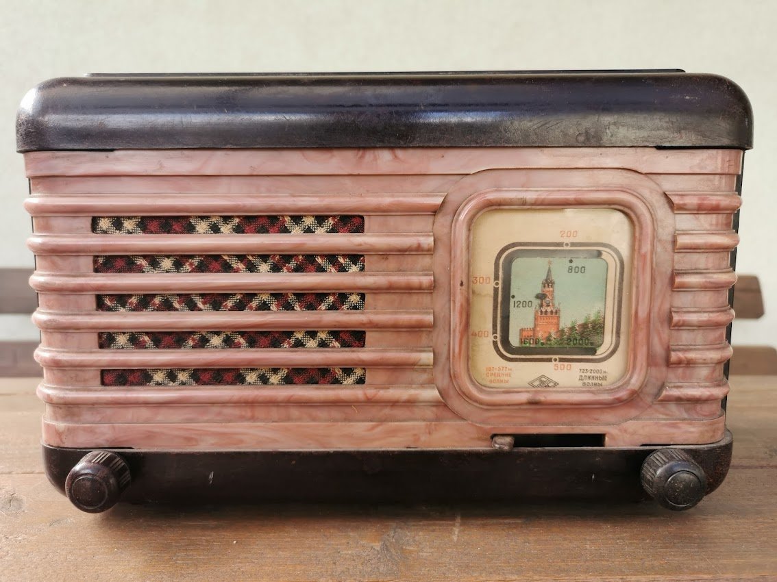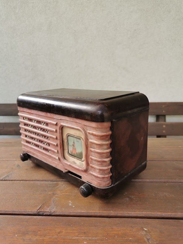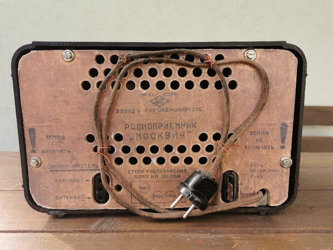 Radija Moskvič, Moskvich, Москвич V – В, tarybinė. 1949–1957 m. Gamintojas: Sarapoul Orjonikidze Radio factory. Netikrinta. Dydis: 29 x 18,5 x 14 cm. Kaina 107