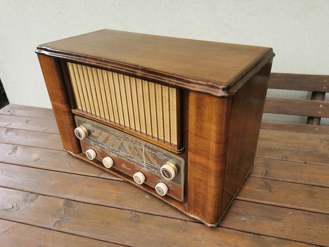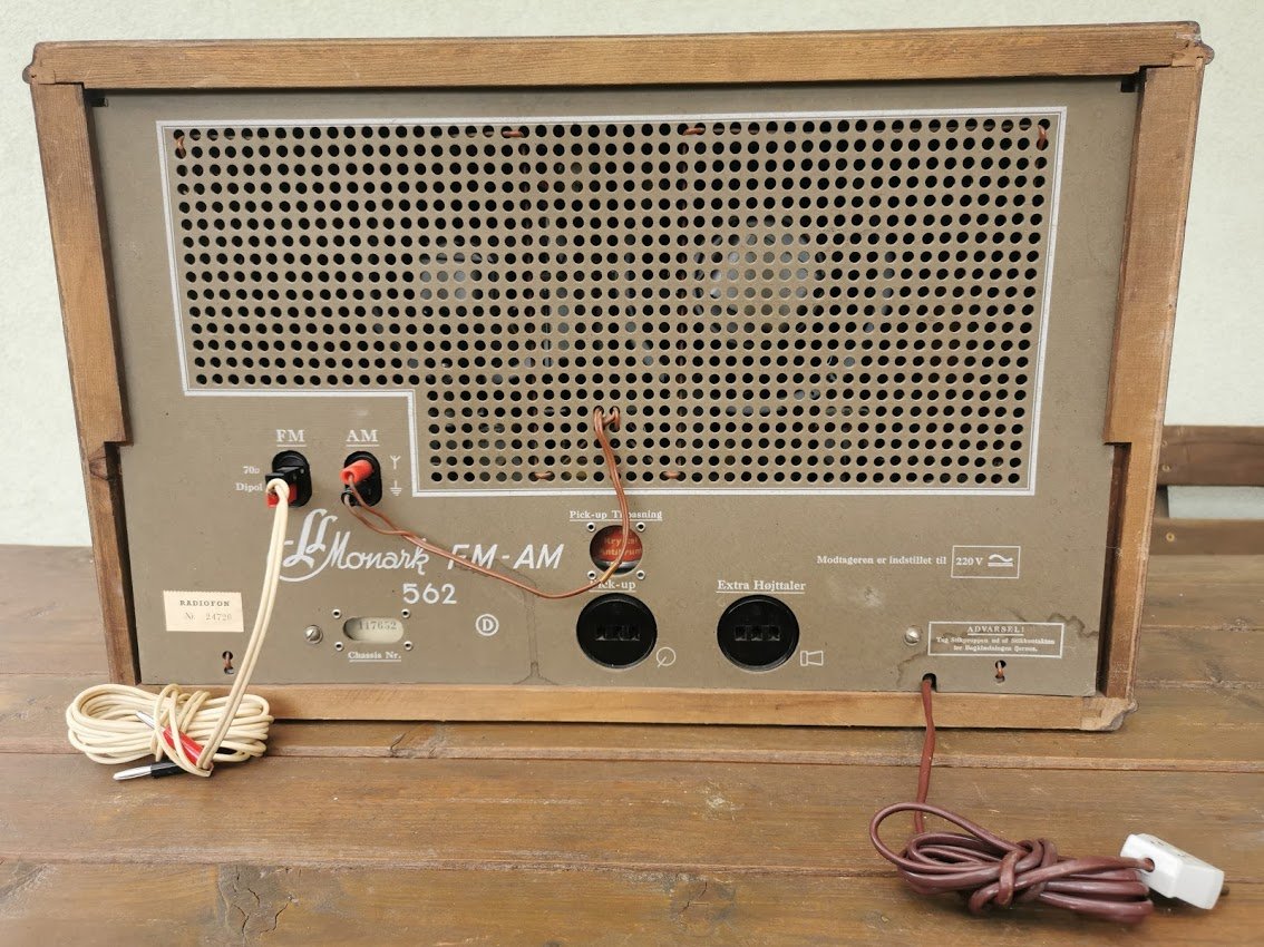 Radija, radio Linnet & Laursen LL: Monark FM-AM 562. 1958 m. Dydis: 58 x 37 x 27 cm. Skalėje matomas VILNUS. Kaina 96