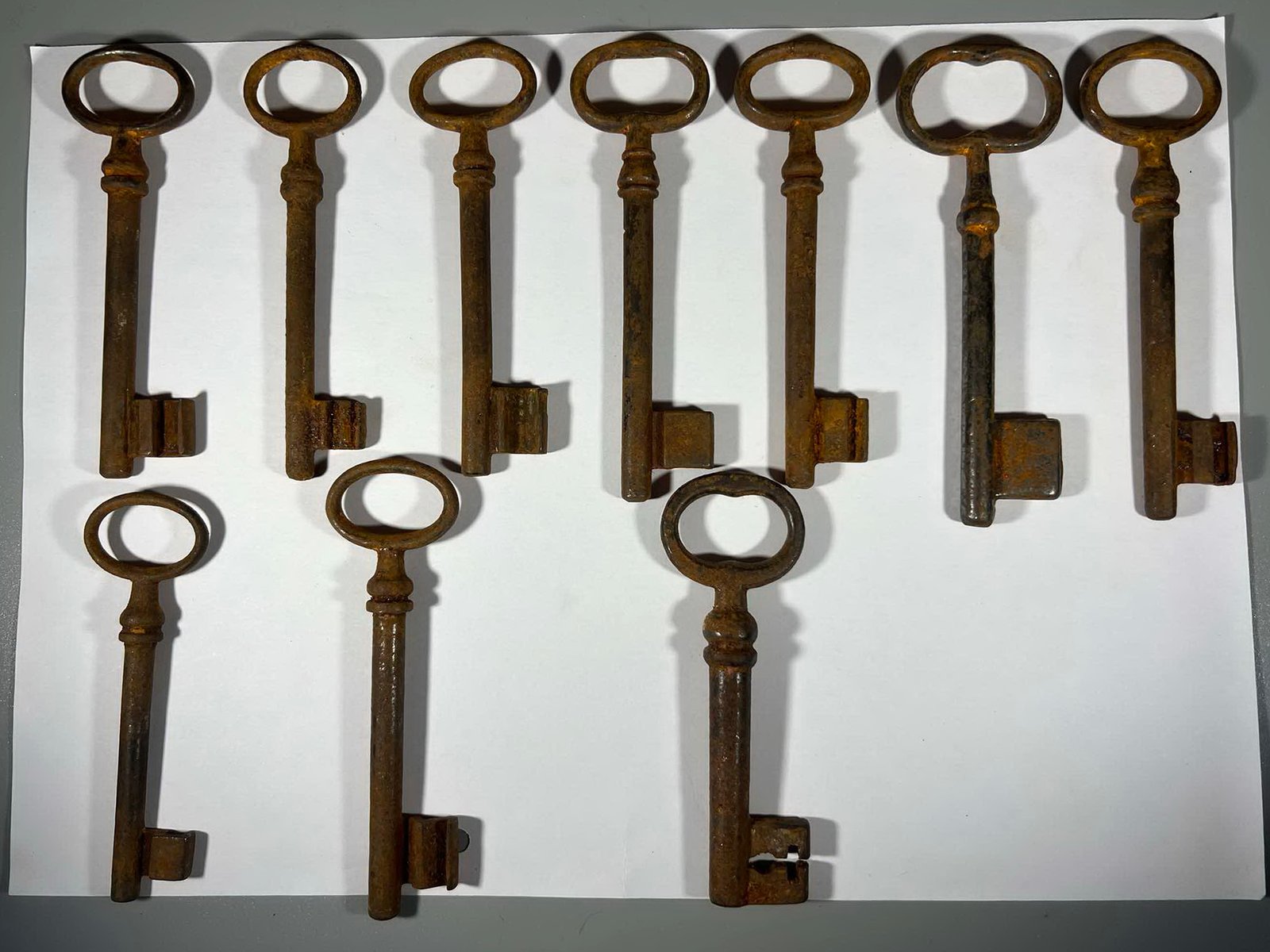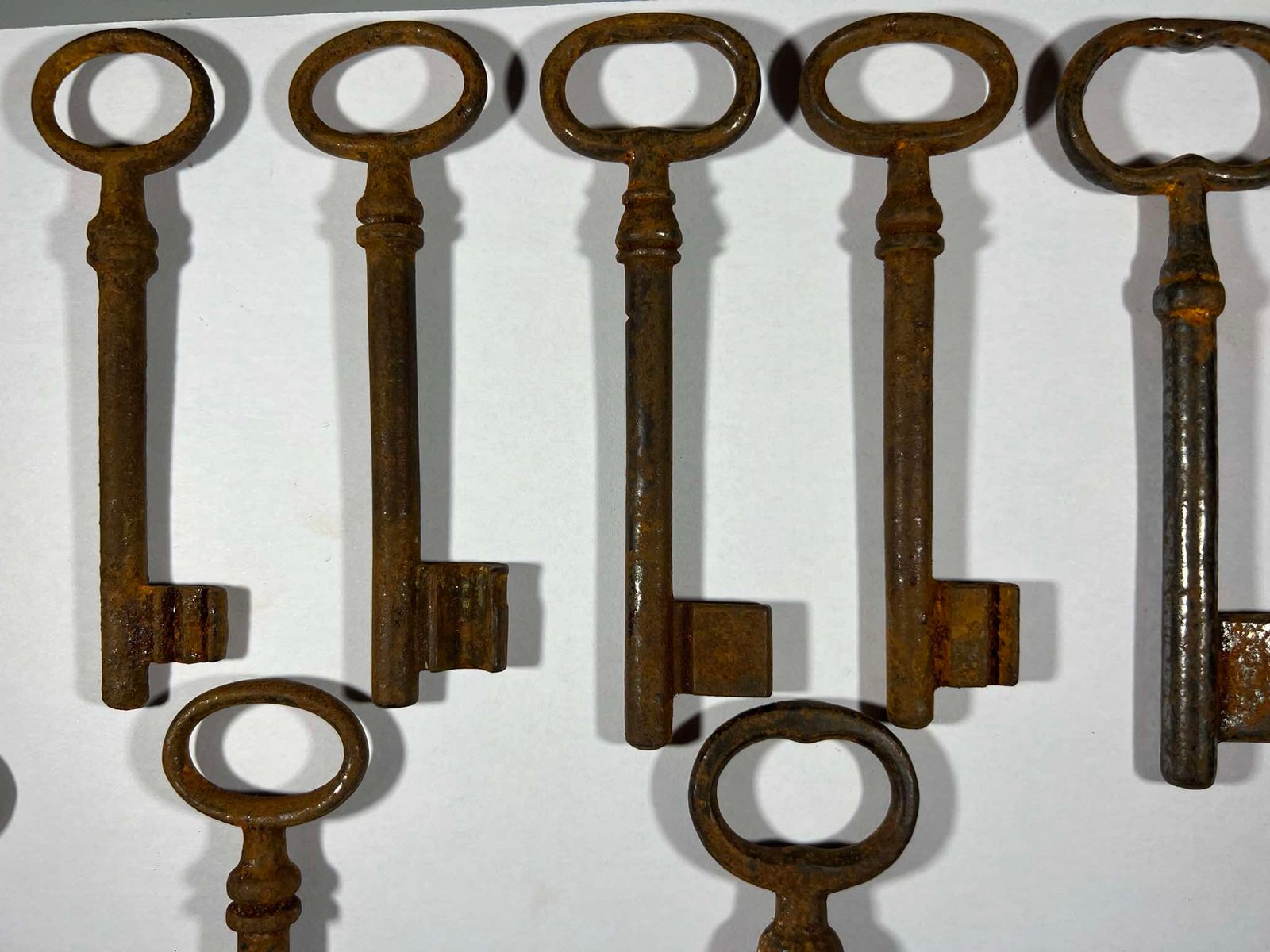 Raktas, raktai antikvariniai. 9 vnt. PARDUOTA apatinėje eilėje trečias. Ilgis 11 cm. Auselės ilgis apie 3 cm. Kaina po 13