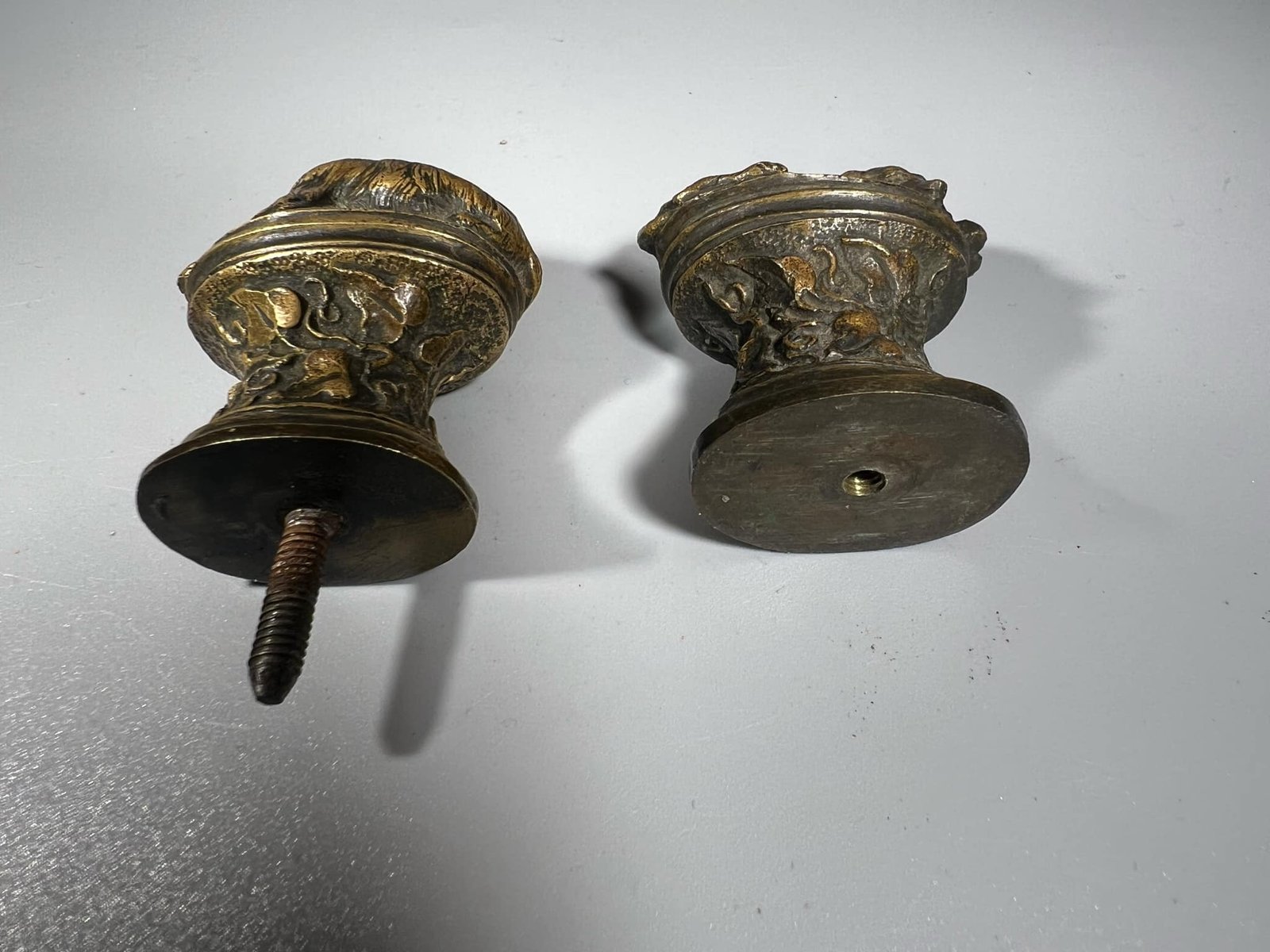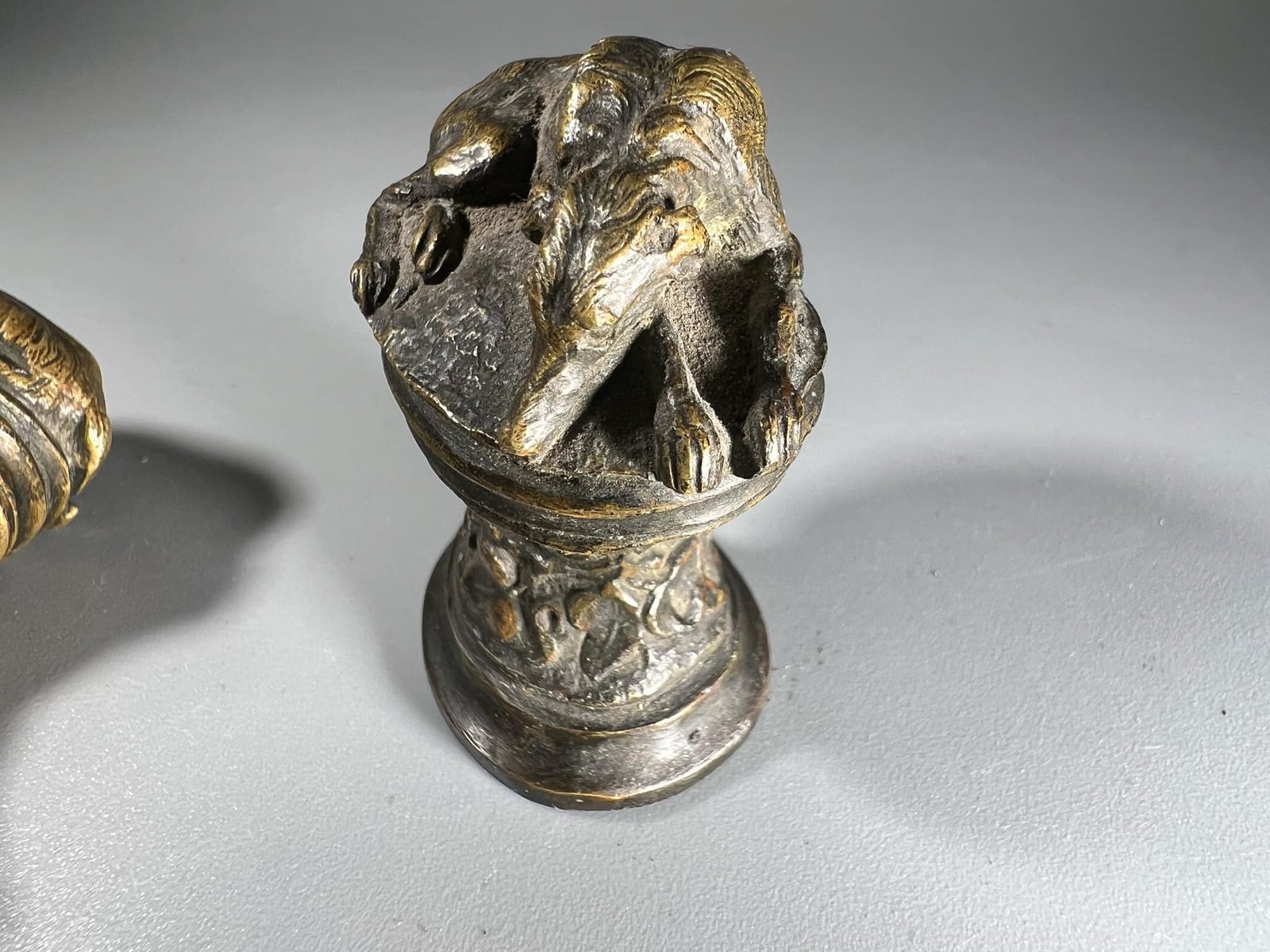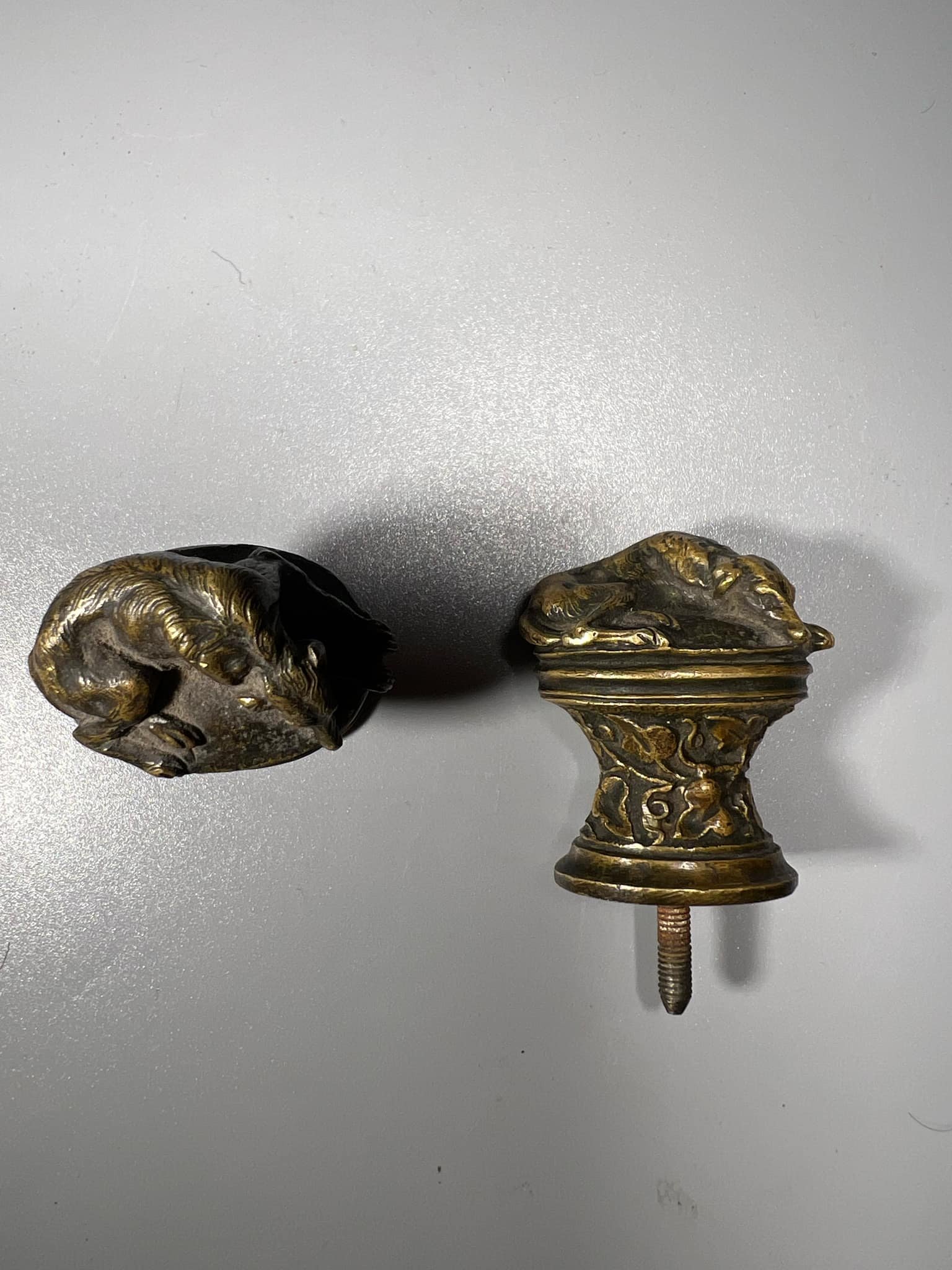 Rankenėlės antikvarinės, bronzinės, žalvarinės puoštos šunų figūrėlėmis. 2 vnt. Kaina 48 už abi.
