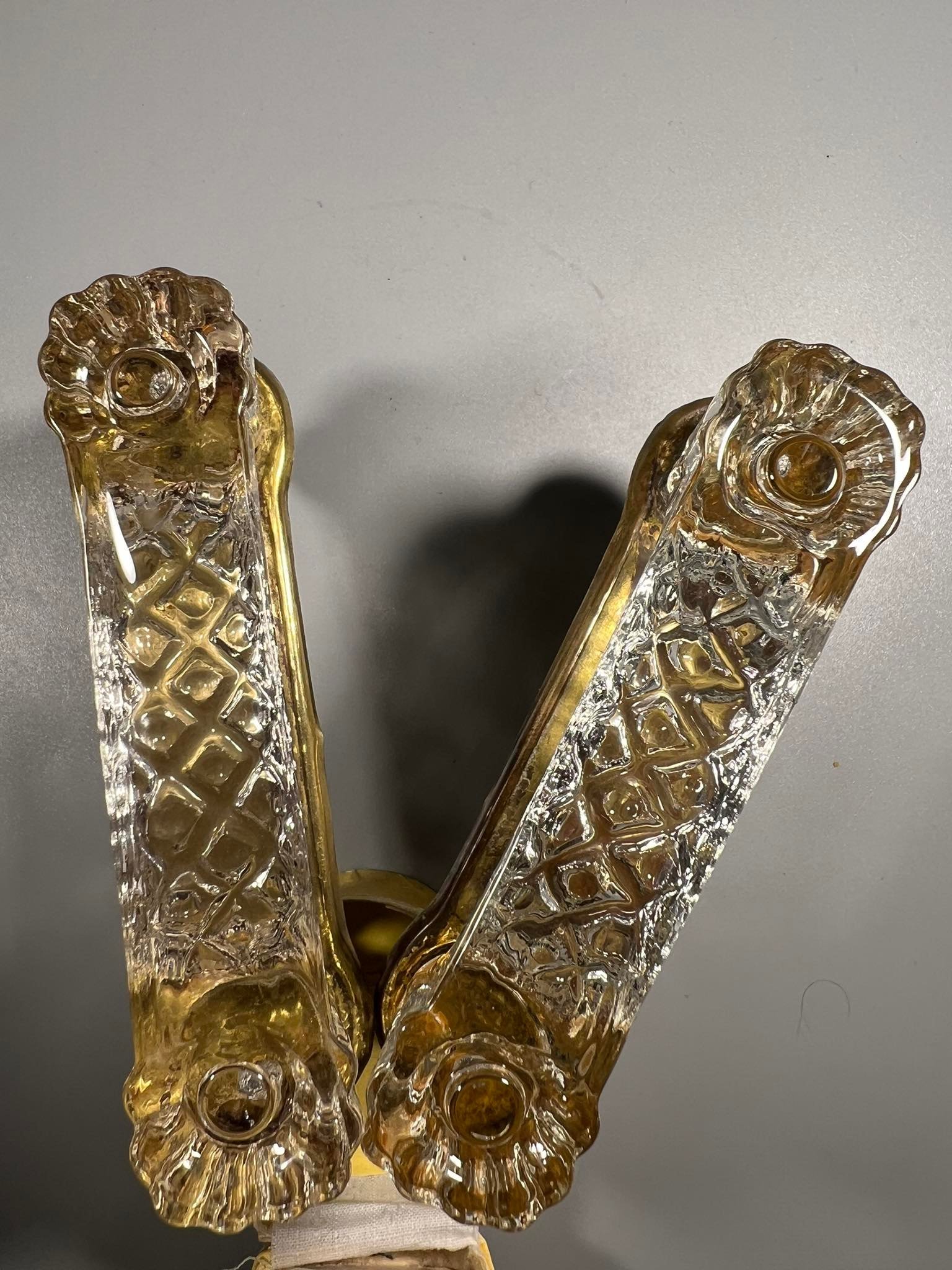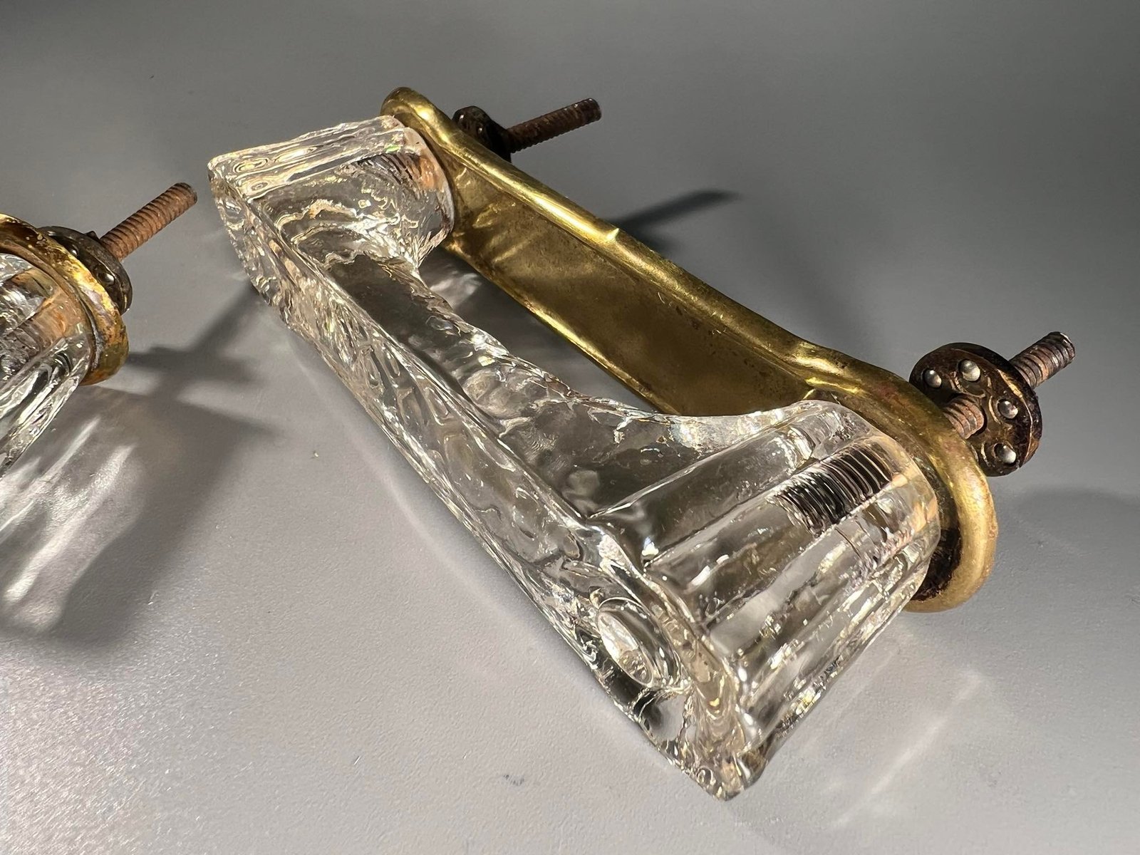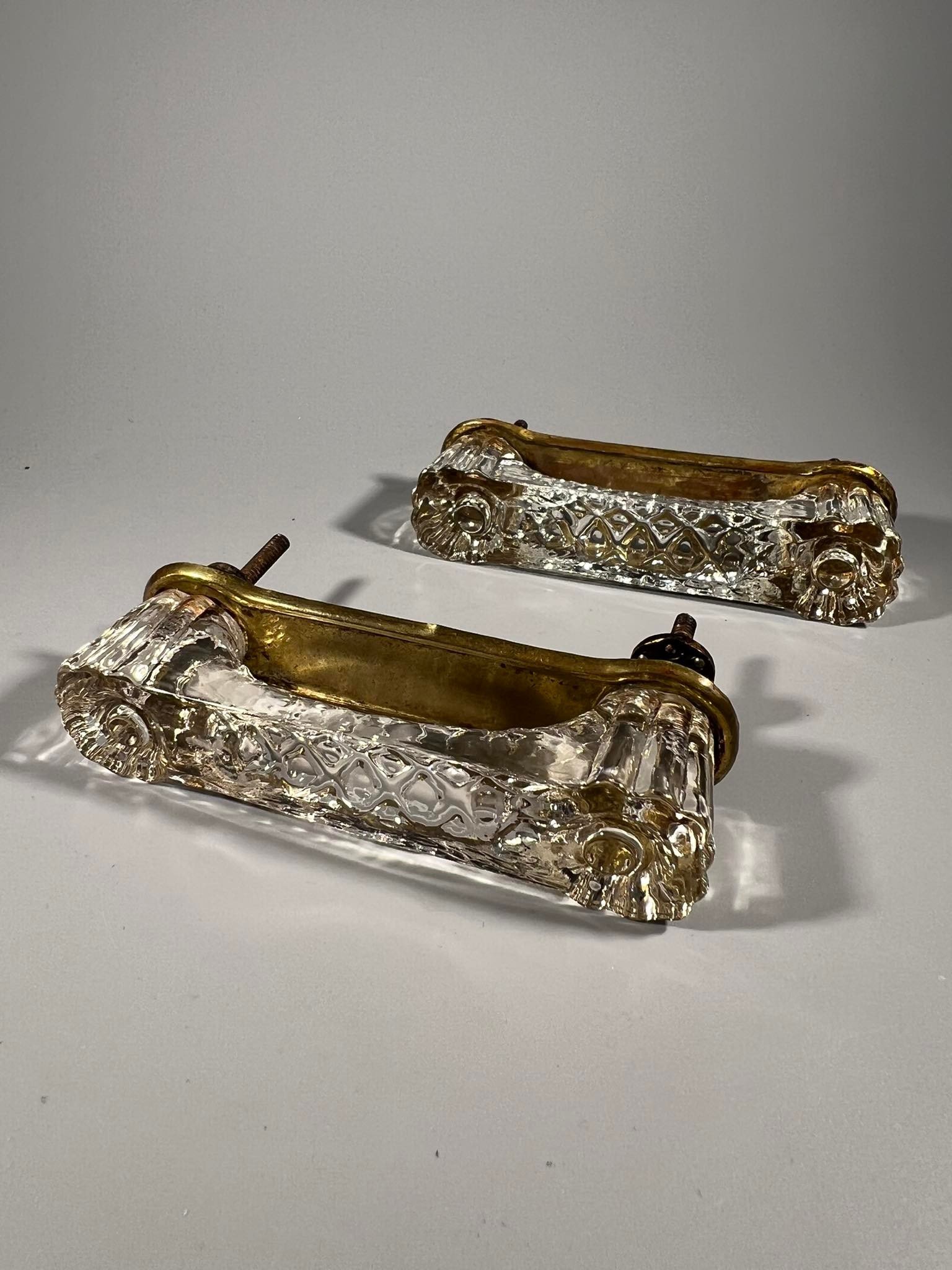 Rankenėlės vintažinės, lydyto, presuoto stiklo. 2 vnt. Ilgis 11 cm. Atstumas tarp varžtų 8,5 cm. Kaina po 23
