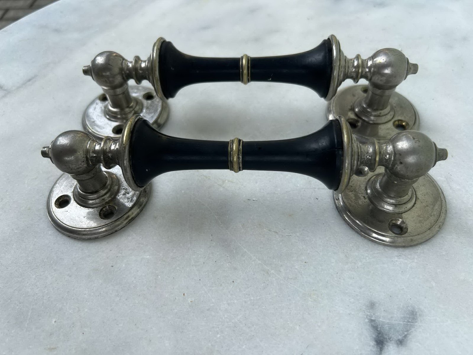 Rankenos vintažinės, tvirtos. Rankenos ilgis 17, viso ilgis 20, tvirtinimo skersmuo 5,5 cm. Kaina 38