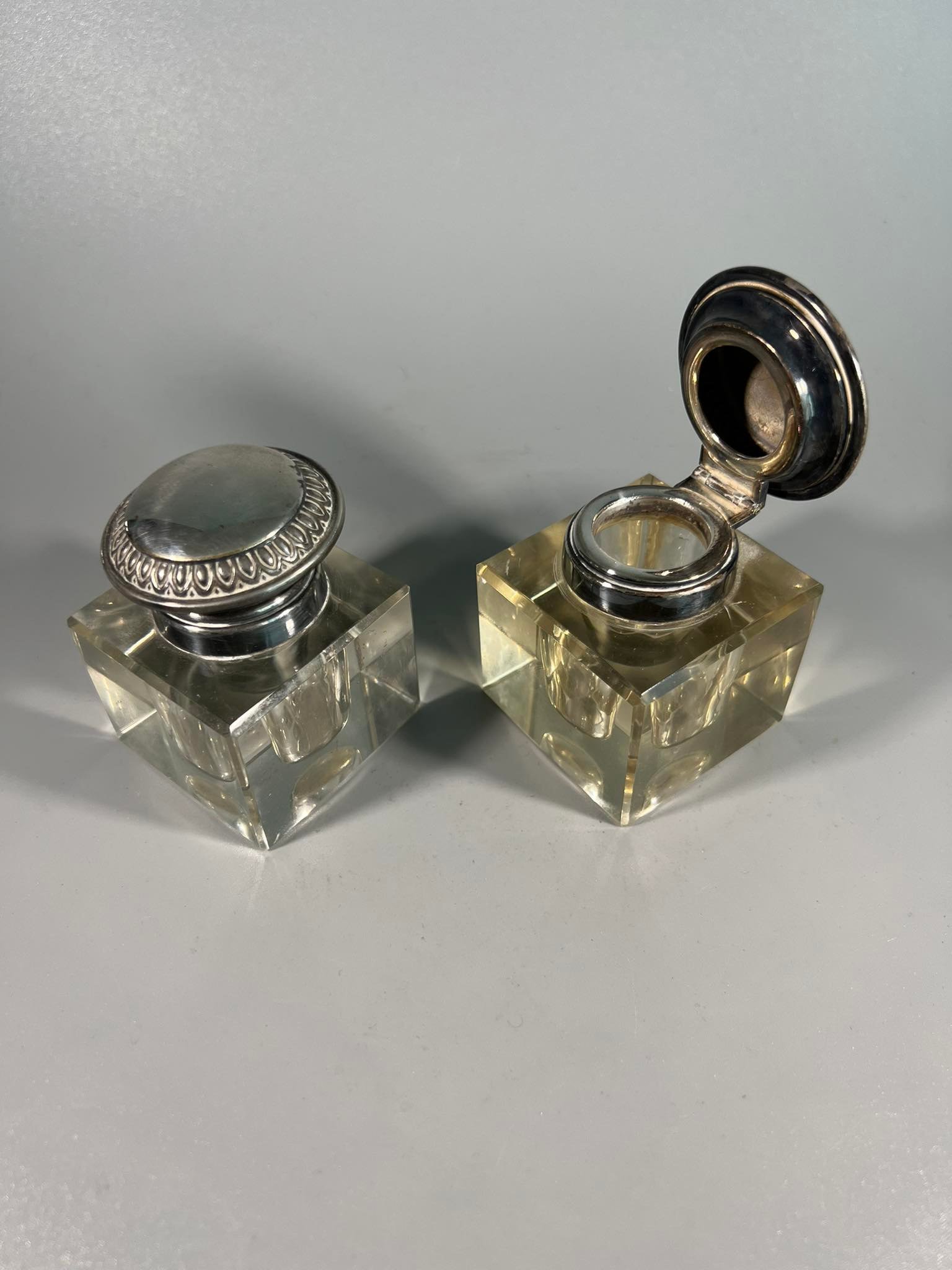 Rašalinės presuoto stiklo sidabruotais dangteliais, antikvarinės. 2 vnt. Kaina po 33