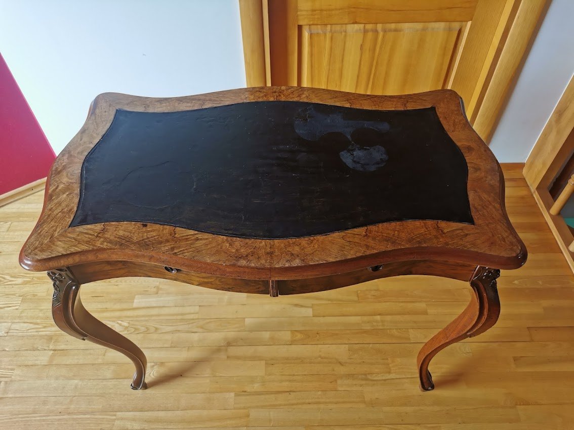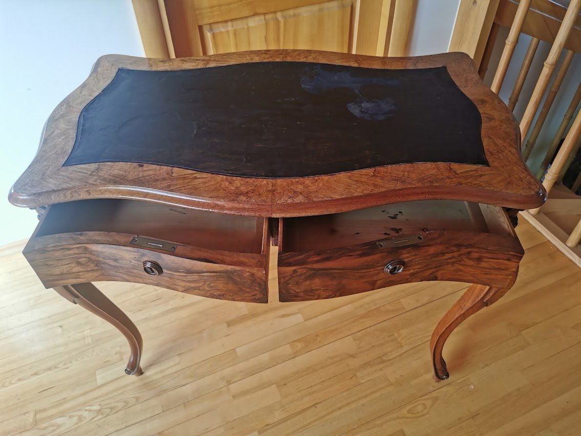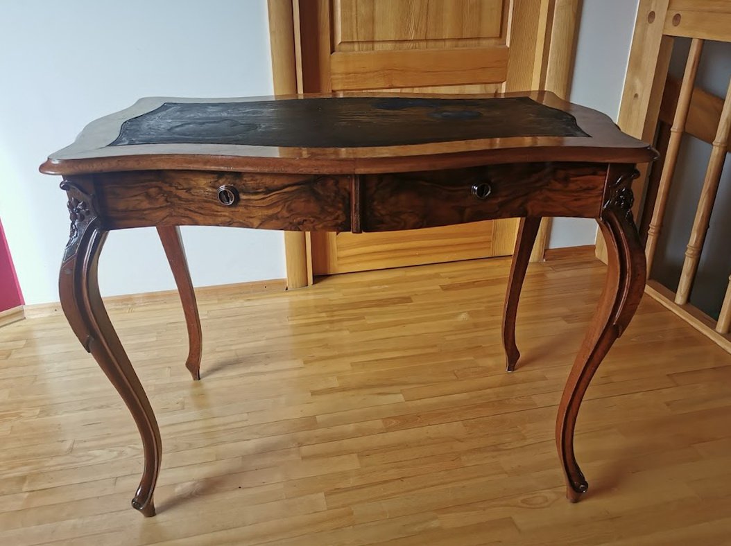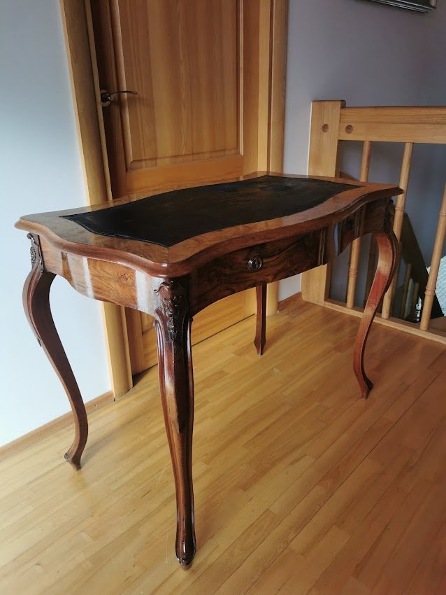 Rašomasis stalas su dviem stalčiais antikvarinis, lengvas, elegantiškas ir patogus. Ilgis 98, plotis 60, aukštis 75 cm. Dengtas lukštu. Stalviršis – dažyta oda. Kaina 367