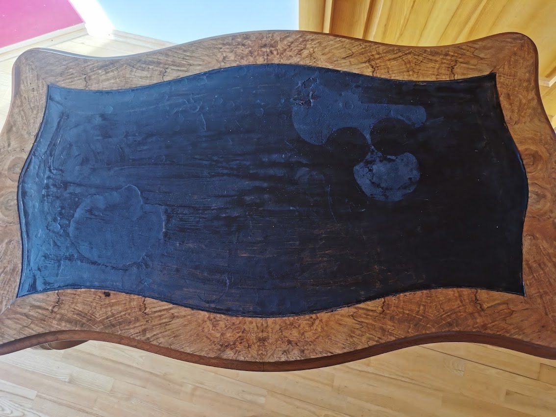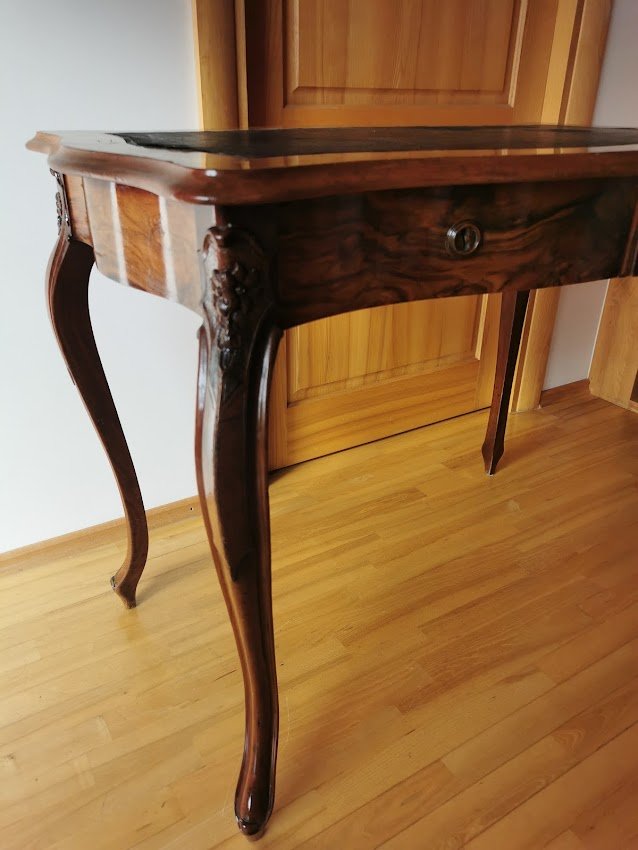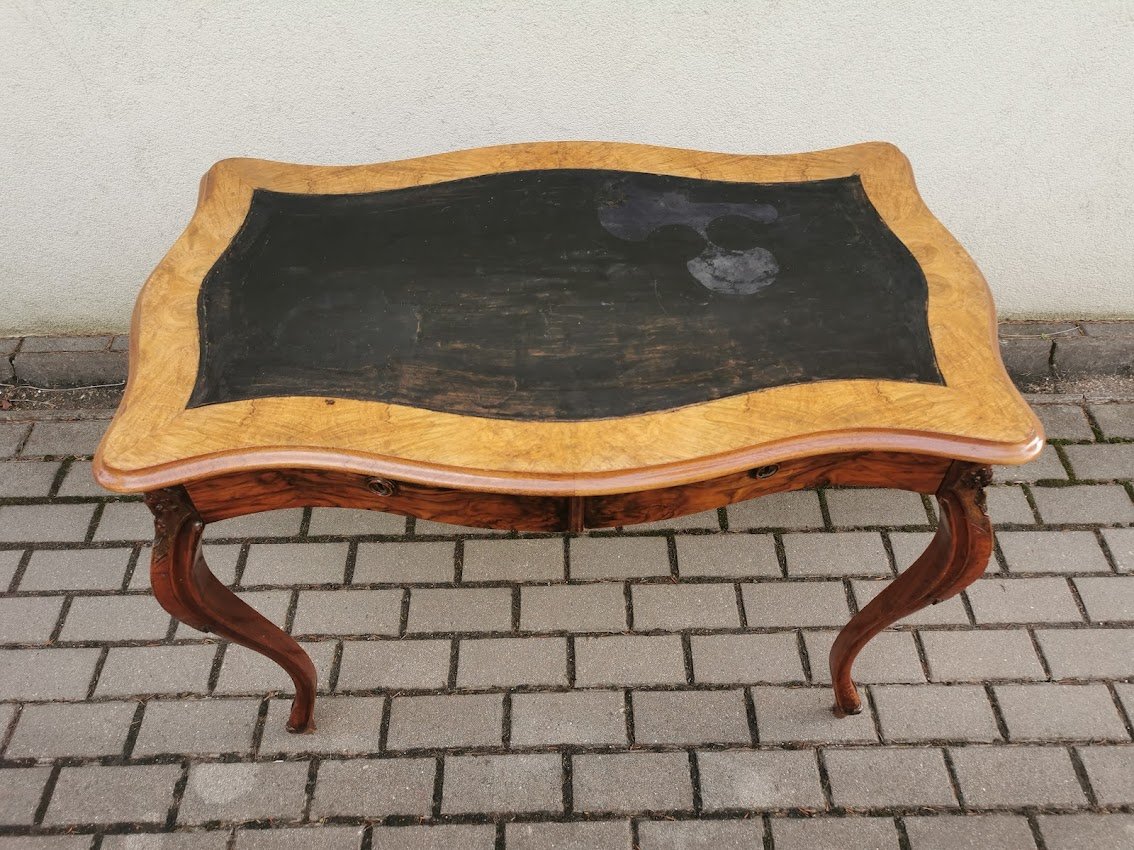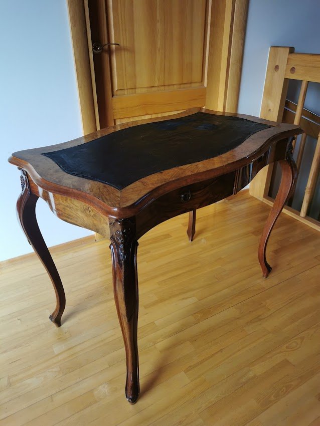 Rašomasis stalas su dviem stalčiais antikvarinis, lengvas, elegantiškas ir patogus. Ilgis 98, plotis 60, aukštis 75 cm. Dengtas lukštu. Stalviršis – dažyta oda. Kaina 367