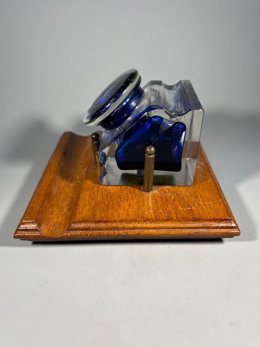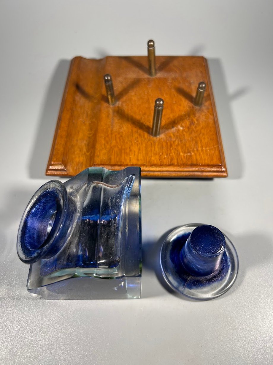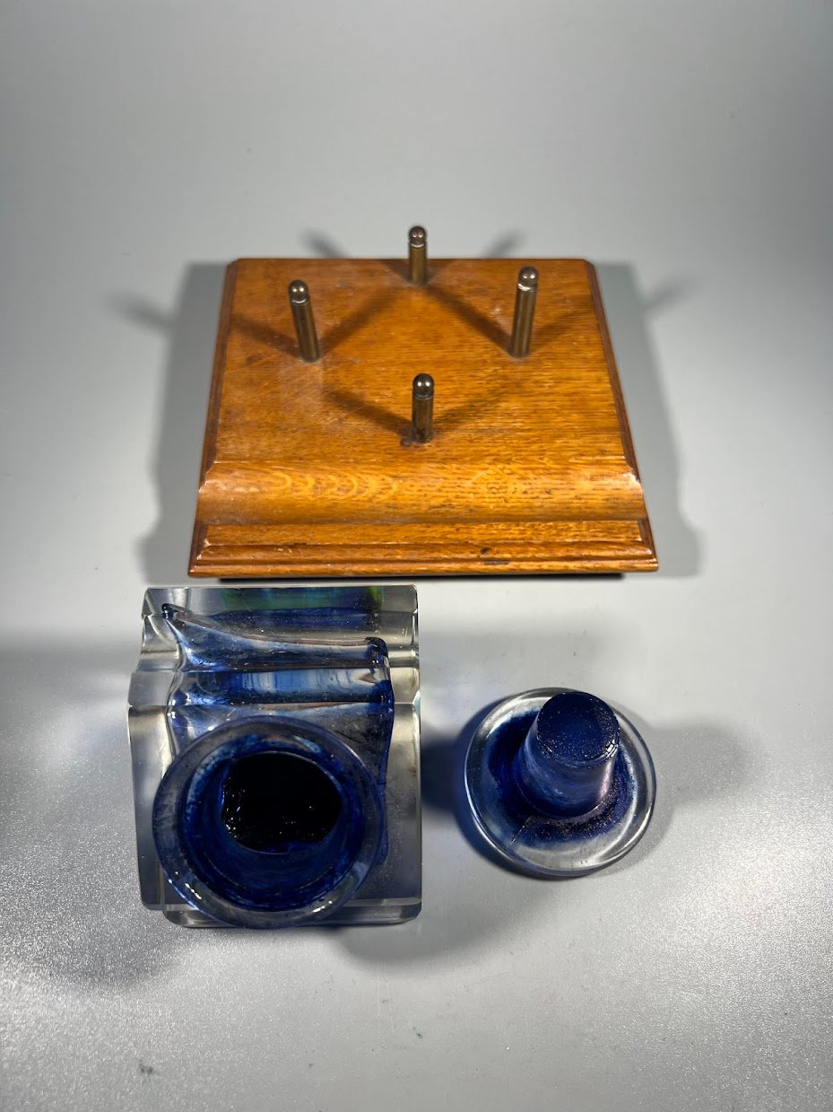 Raštinės komplektas, antikvarinis, rašalo buteliukas, rašalinė ant ąžuolinės lentelės. 1930 m. Pagrindo dydis: 13 x 13 cm. Kaina 87