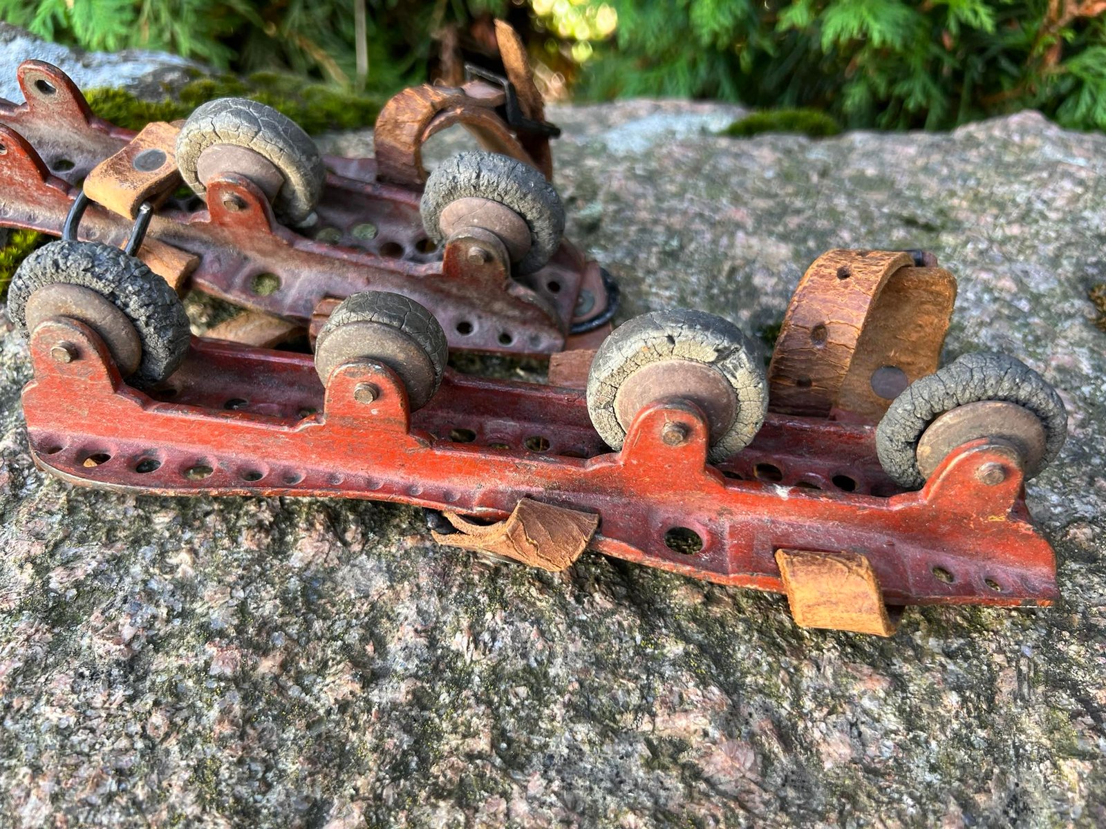 Riedučiai antikvariniai, ketaus, špižiniai, mediniai ratukai aptraukti guma. Kaina 28