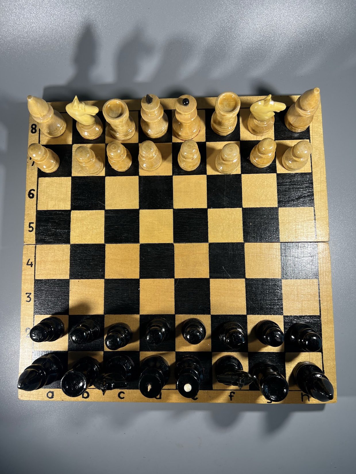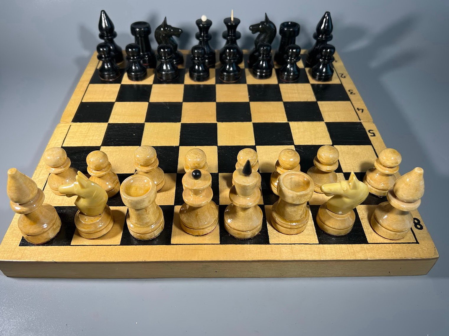 Šachmatai mediniai su medine šachmatų lenta, komplektas, sovietiniai, tarybinių laikų. 1970-1980 m. Karaliaus aukštis 6, pėstininko 3,5 cm. Viskas taip kaip matosi nuotraukose, arklių viršutinė dalis plastmasinė. Kaina 22