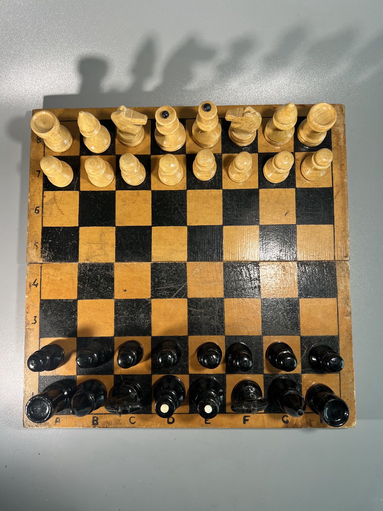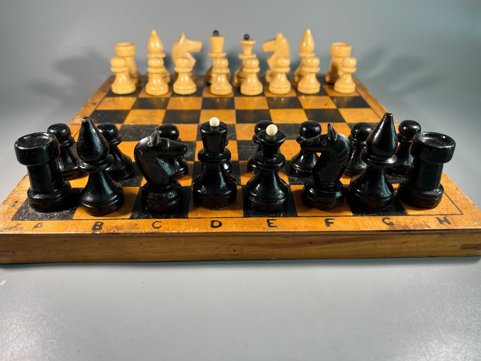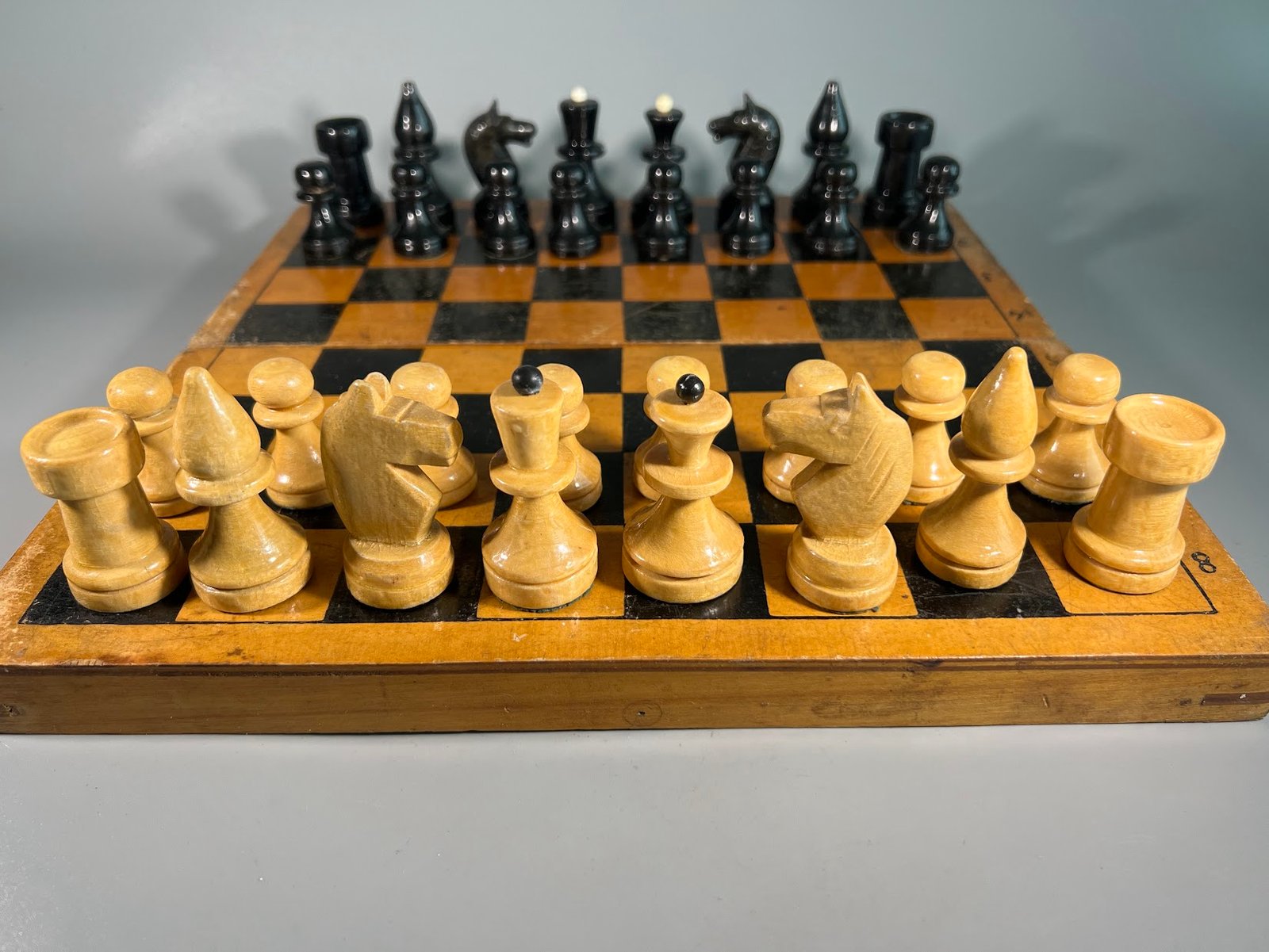 Šachmatai mediniai su medine šachmatų lenta, komplektas, sovietiniai, tarybinių laikų. 1970-1980 m. Pėstininko aukštis 4, karaliaus aukštis 5,5 cm. Kaina 38