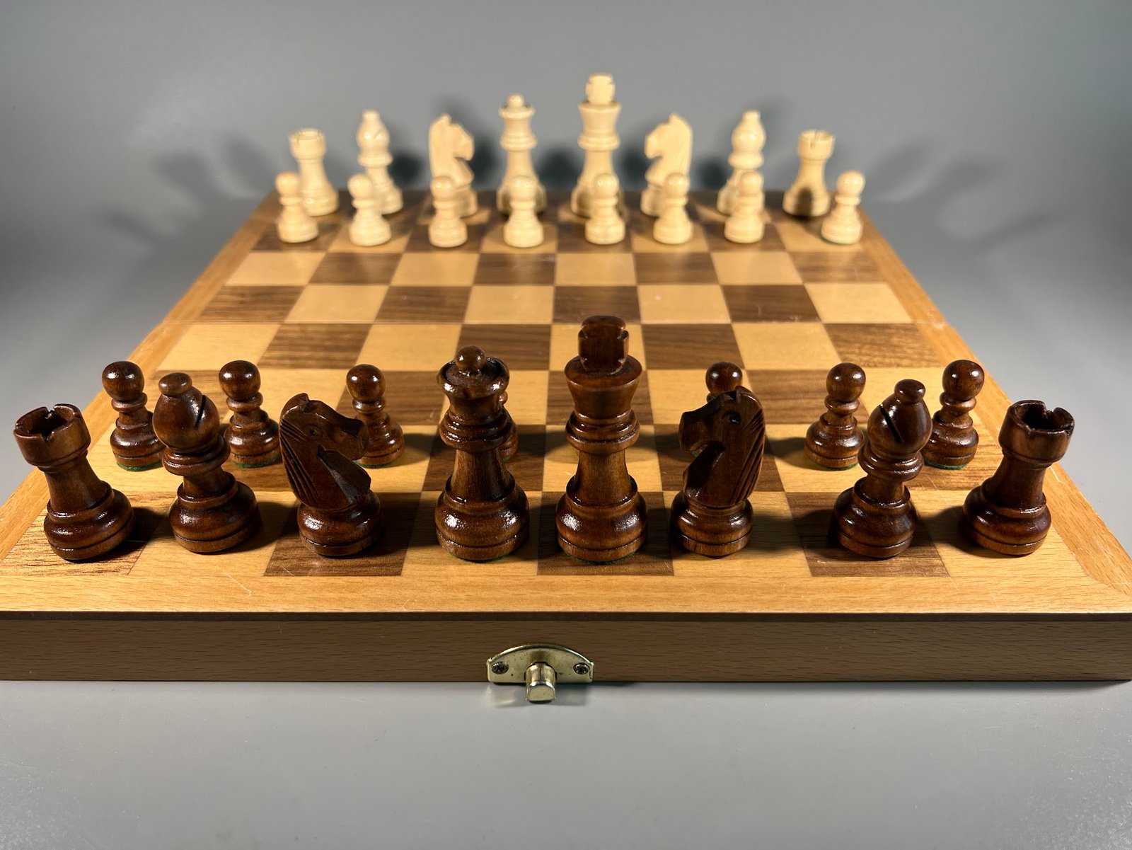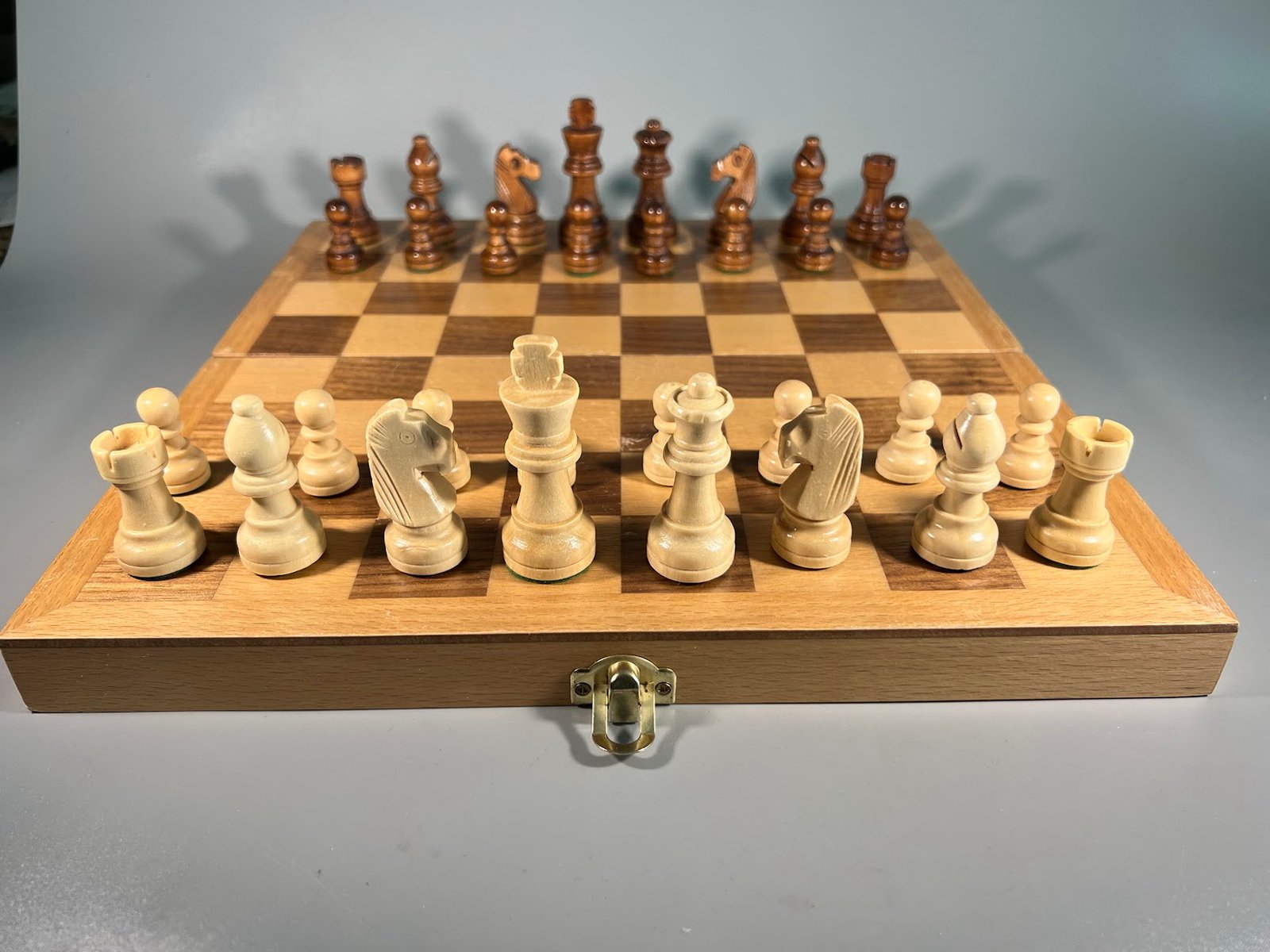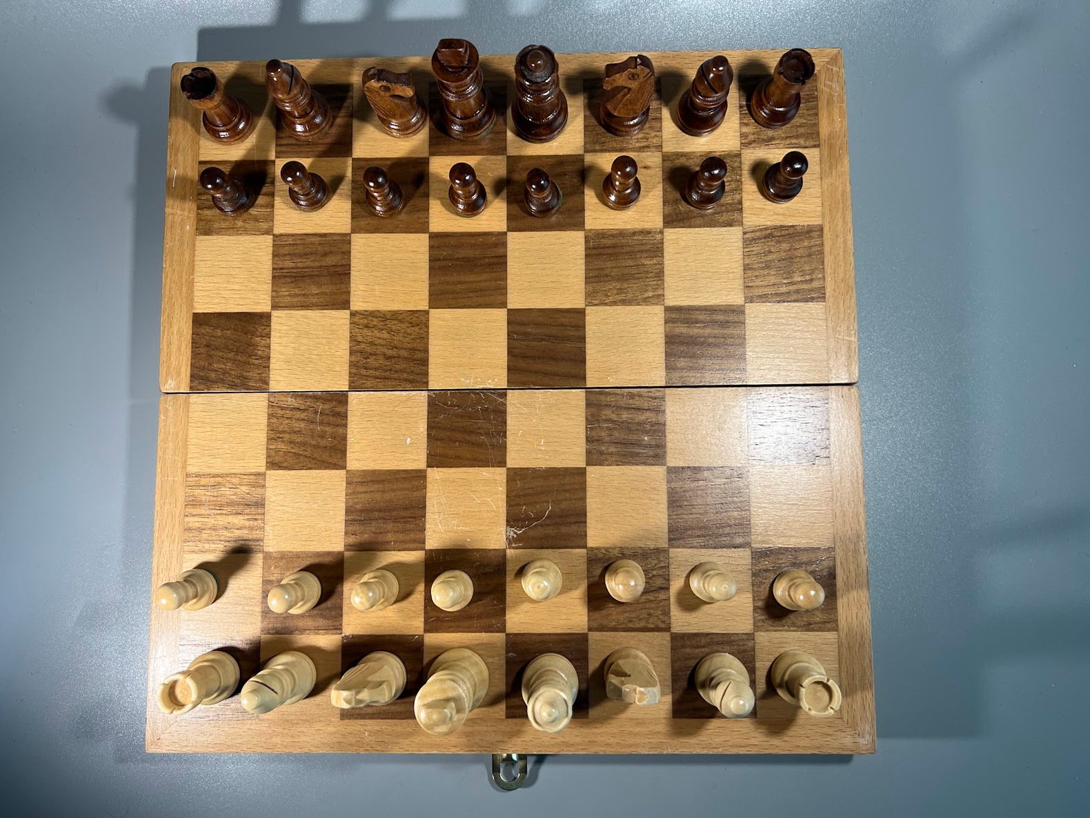 Šachmatai mediniai su medine šachmatų lenta, komplektas, vokiški. Karaliaus aukštis 6, pėstininko 3 cm. Kaina 58