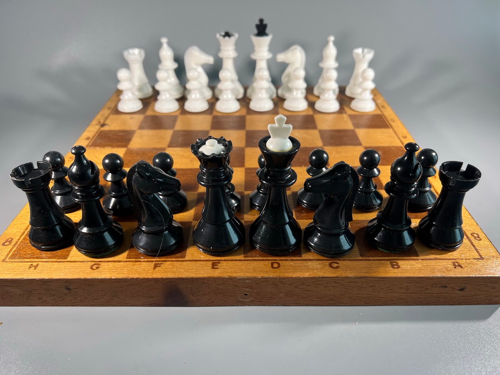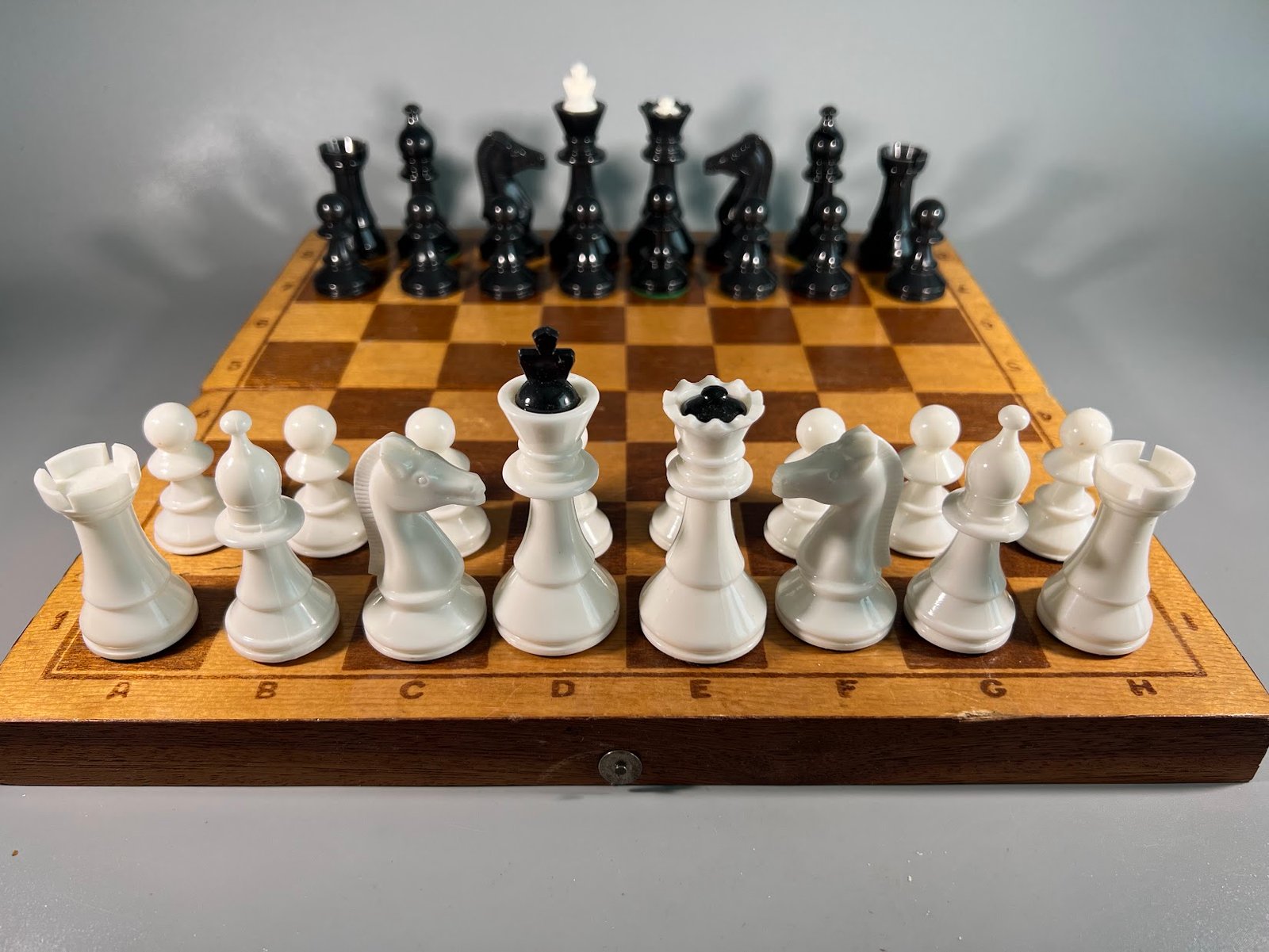 Šachmatai plastmasiniai su medine šachmatų lenta, komplektas, sovietiniai, tarybinių laikų. 1980 m. Karaliaus aukštis 8,5, pėstininko 4 cm. Kaina 28