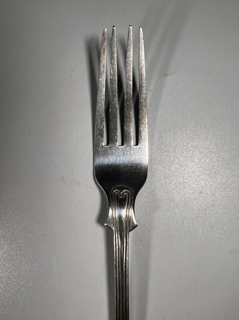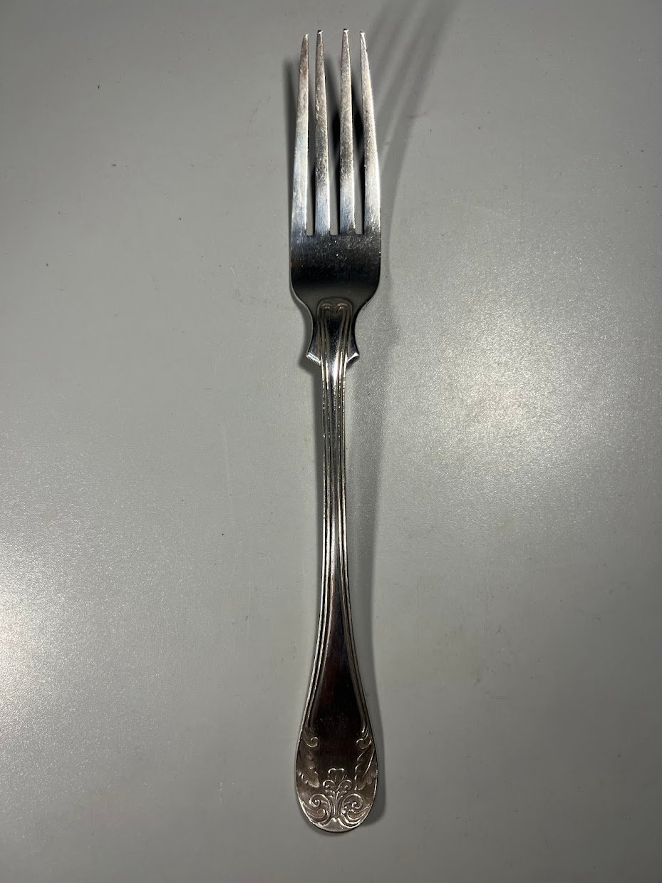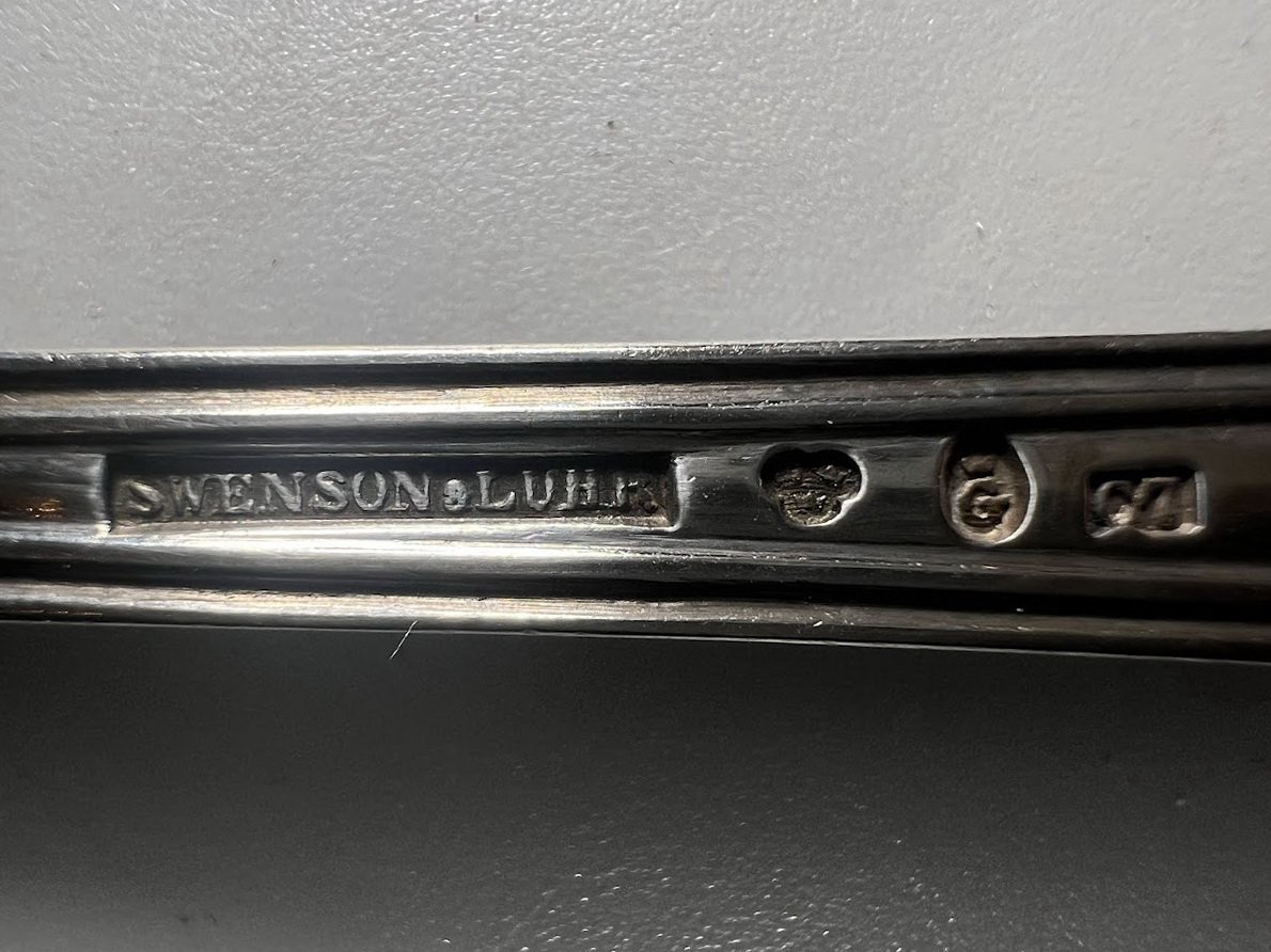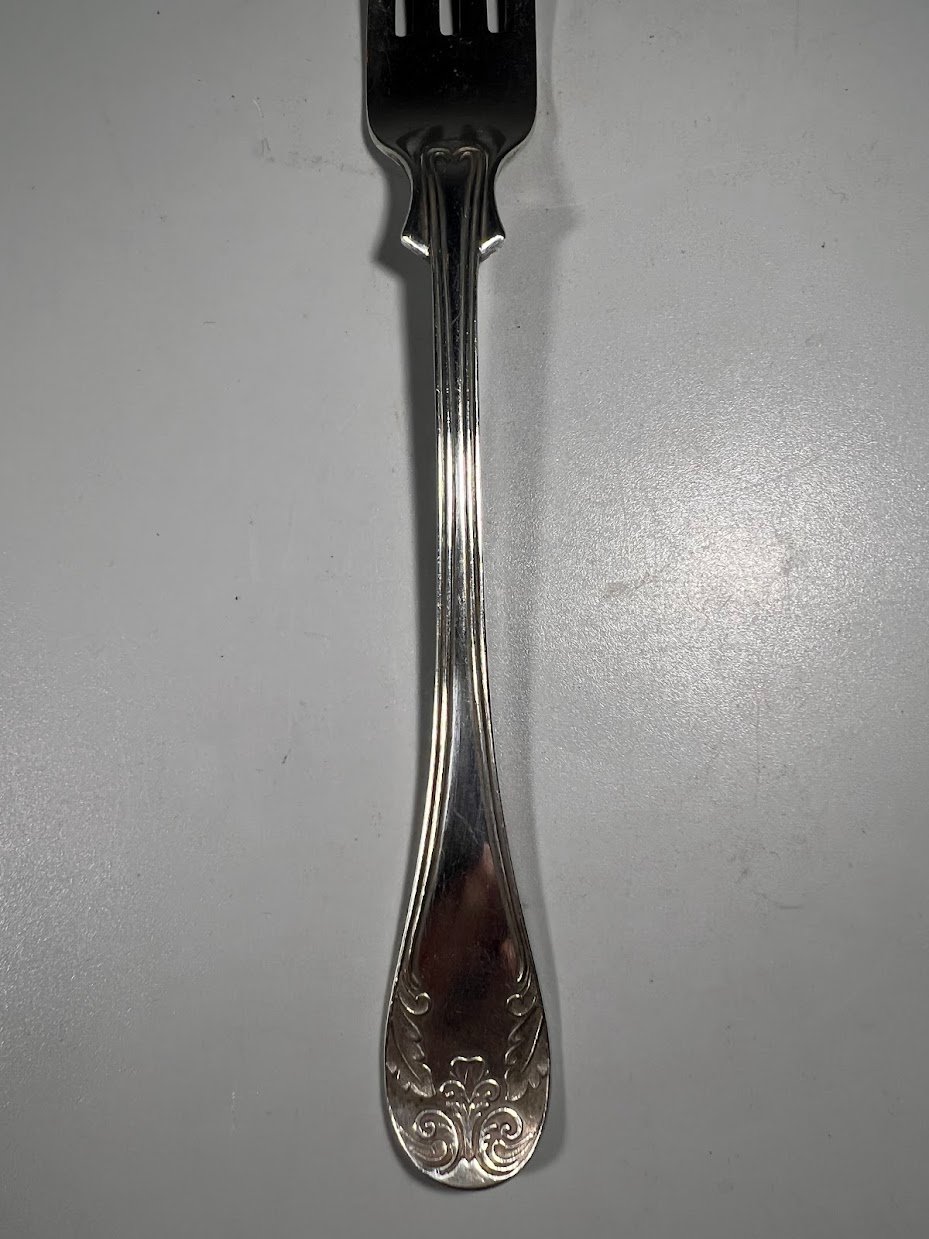 Šakutė sidabrinė, antikvarinė, Švedija. Praba 800, trys karūnos. Swenson & Luhr, Göteborg. 1929 m. Svoris 63 g. Ilgis 21 cm. Kaina 138