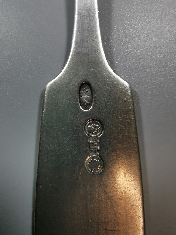 Šakutė sidabrinė, praba 84. Carinė Rusija. Svoris 68 g. Ilgis 20,5 cm. Kaina 196