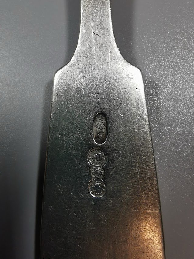 Šakutė sidabrinė, praba 84. Carinė Rusija. Svoris 70 g. Ilgis 21 cm. Kaina 198