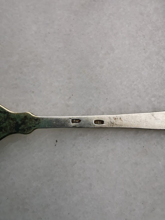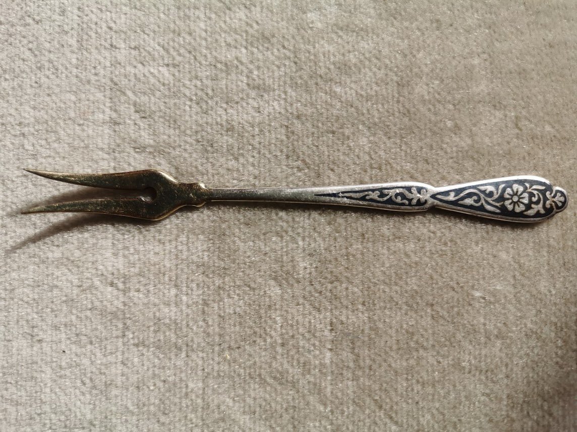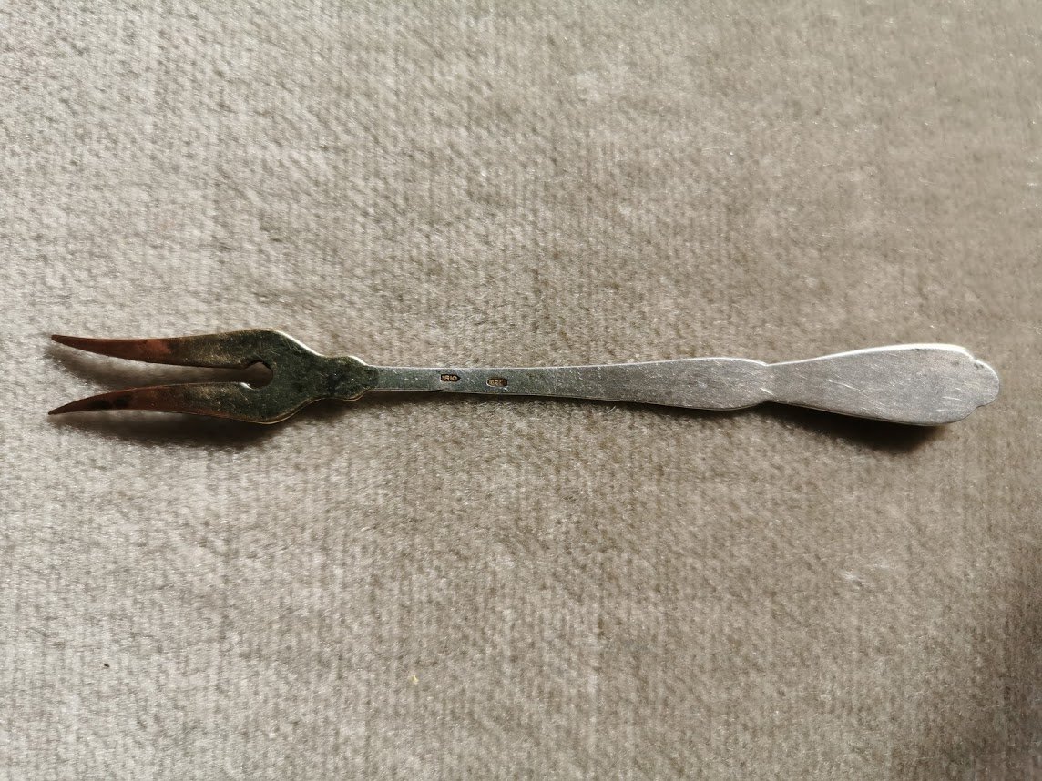 Šakutė vaisiams, citrinai ar pan. sidabrinė, tarybinė. Praba 875. Svoris 11 gr. Kaina 28