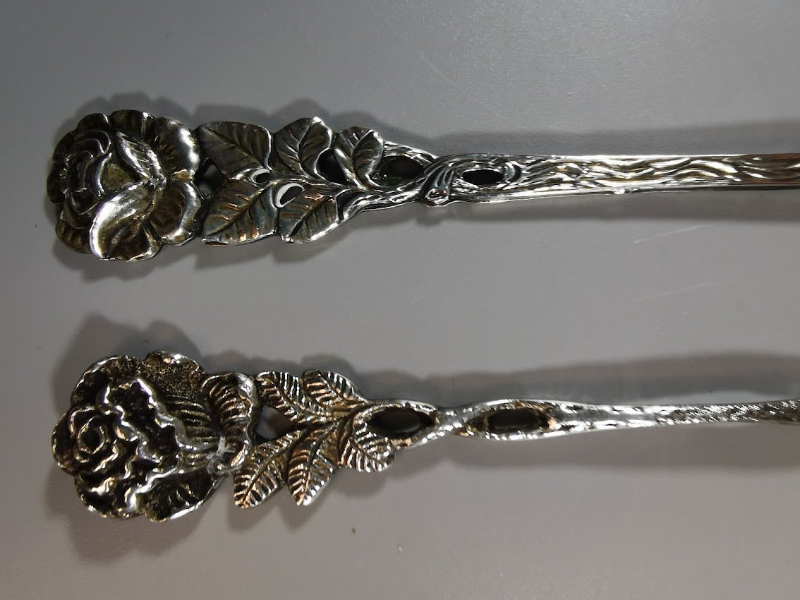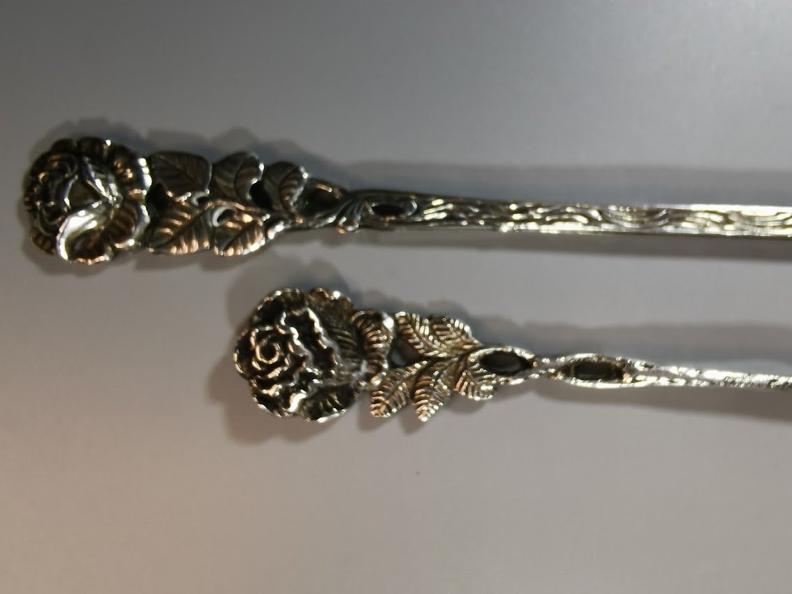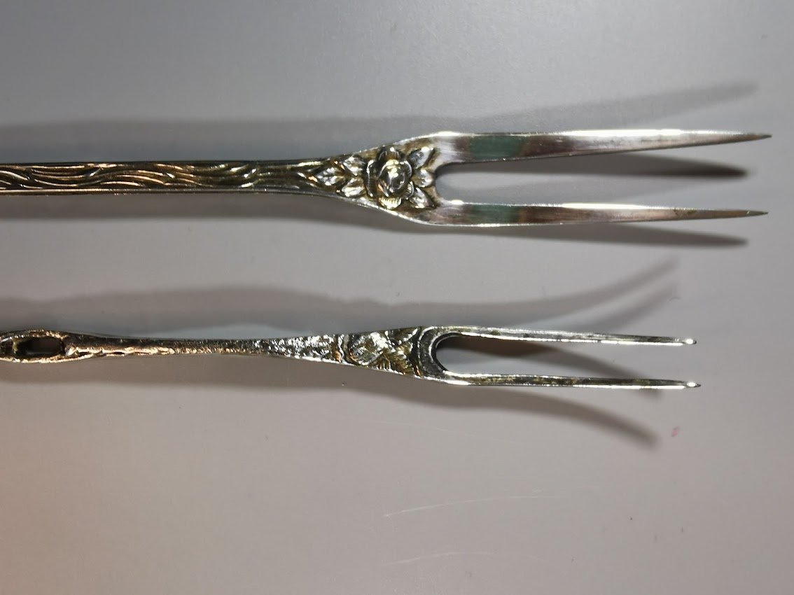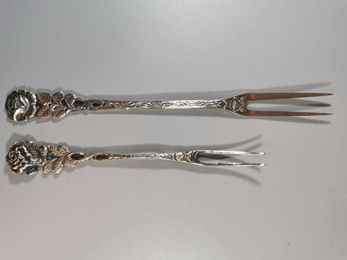 Šakutės vaisiams, citrinai ar pan. sidabrinės, antikvarinės. Vokietija. Praba 800. Trumpesnės: svoris 11 gr. Ilgis 13 cm. Kaina 27. Ilgesnė: svoris 17 g., ilgis 17 cm. Kaina 33