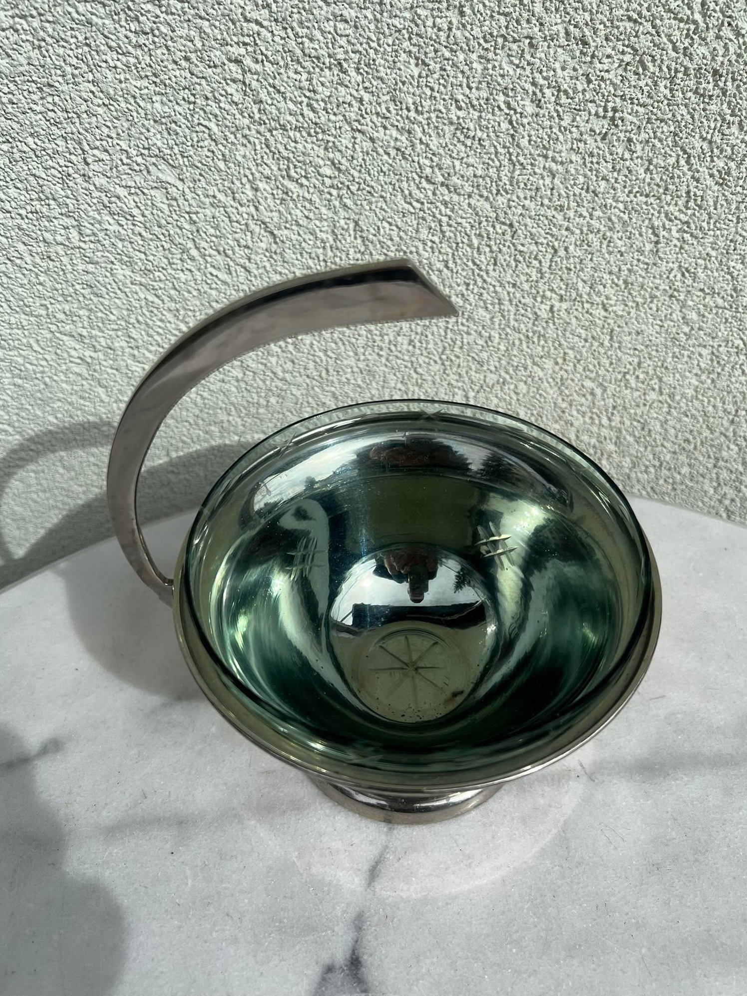 Saldaininė, sausaininė, indas su išimamu raižytu stiklu, antikvarinis. Aukštis 20, skersmuo 16 cm. Kaina 43