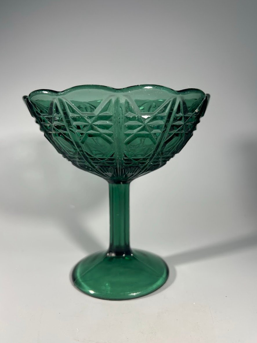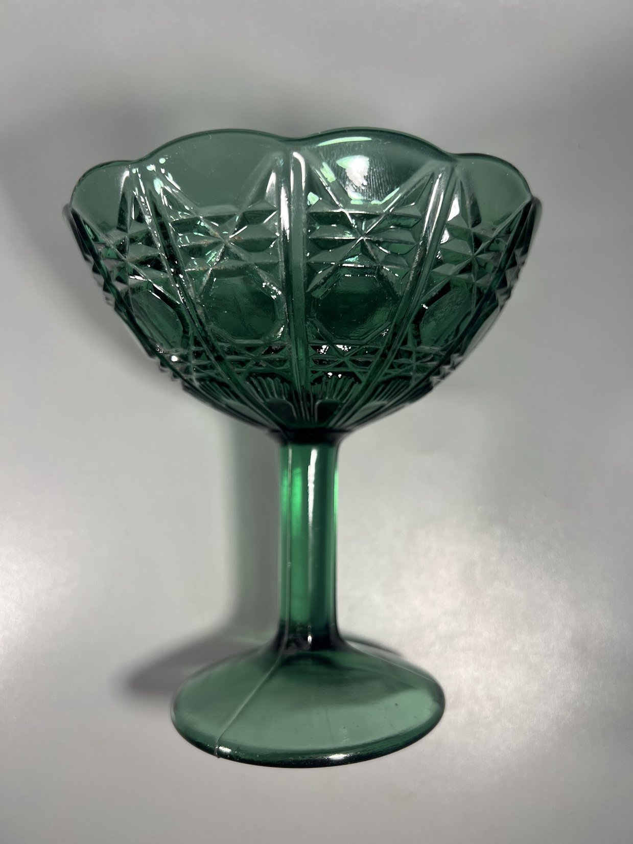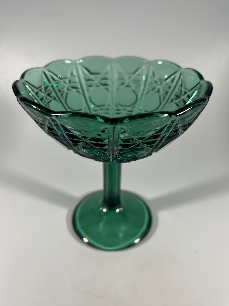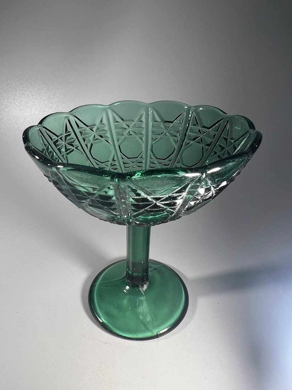 Saldaininė žalio stiklo vintažinė, latviška. Aukštis 14, viršutinis skersmuo 13 cm. Kaina 18